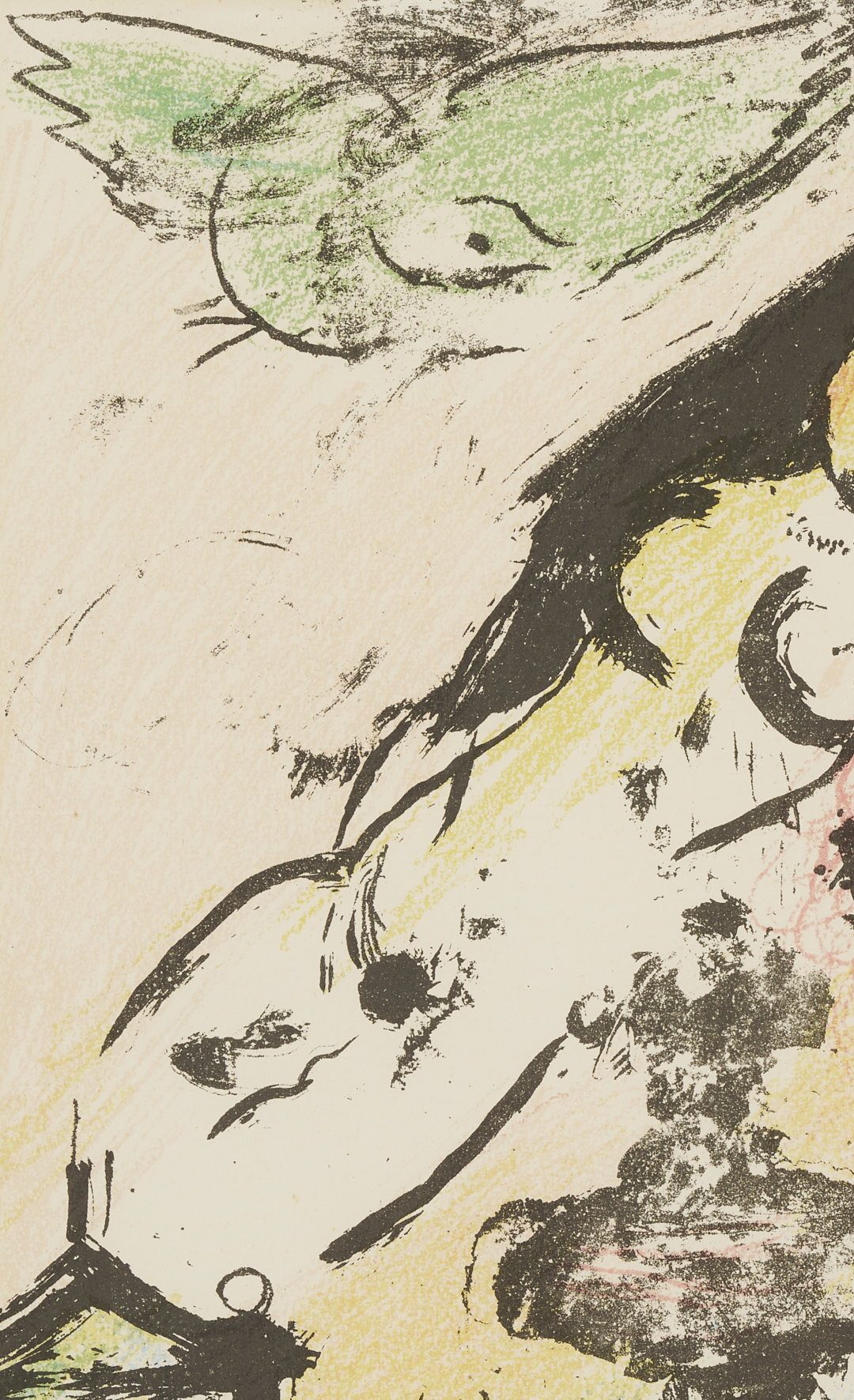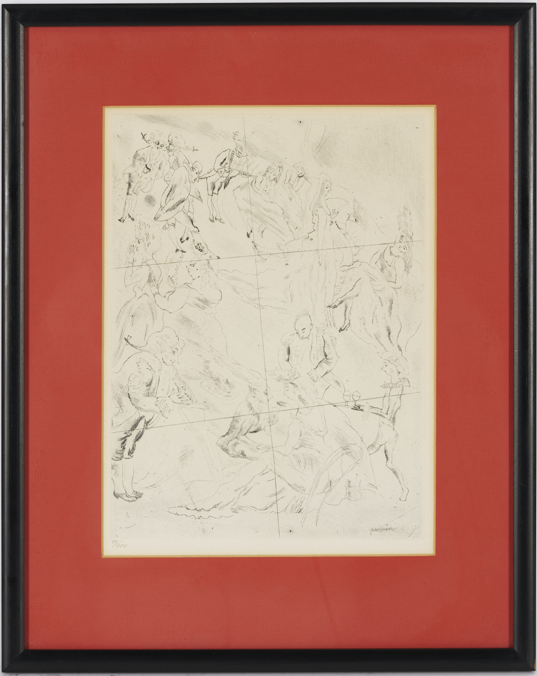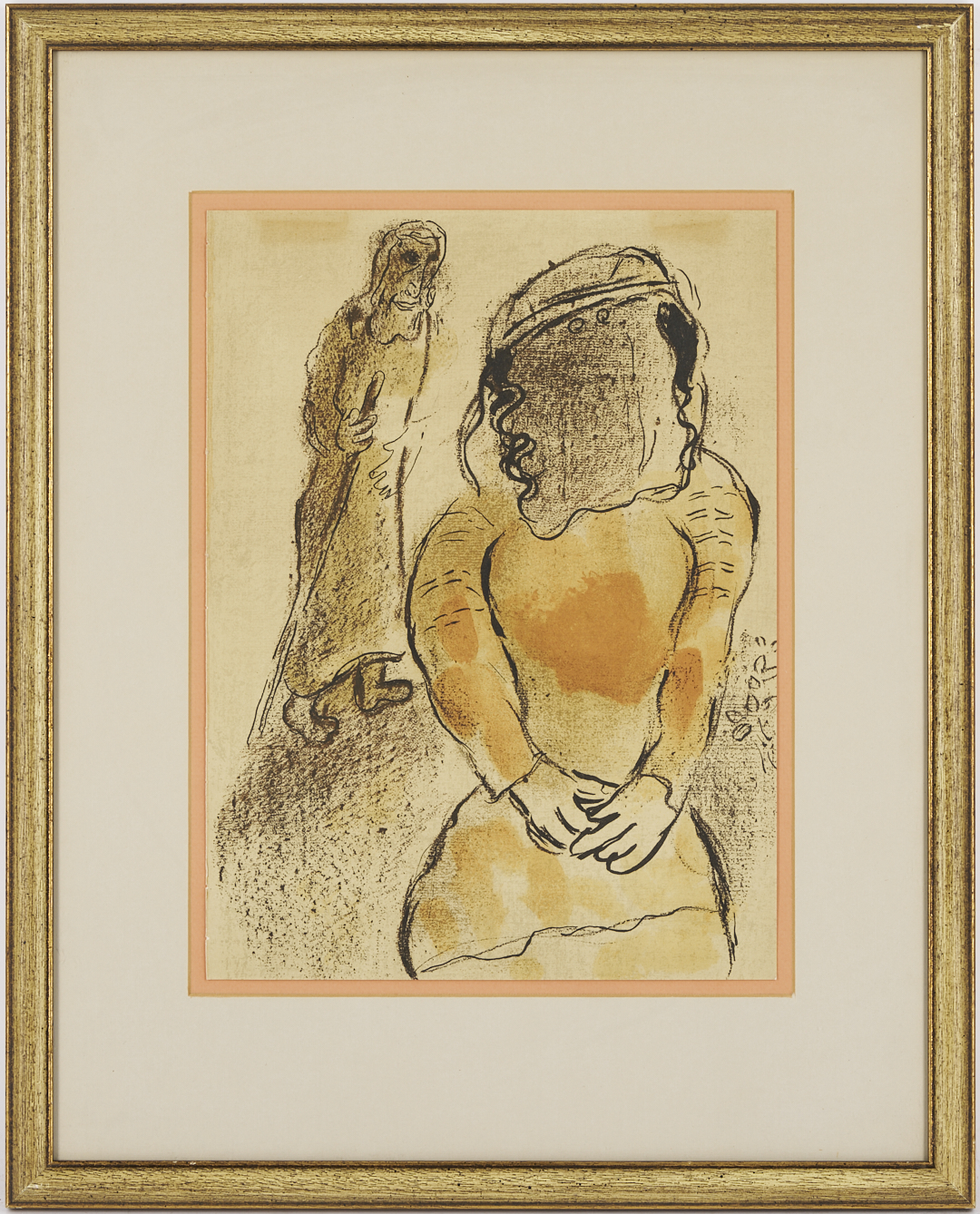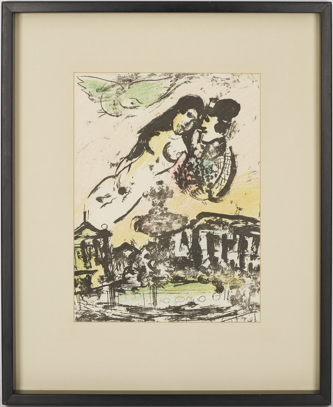 Items 1-2: Two (2) Marc Chagall (French/Russian, 1887-1985) lithographs, “Tamar, Daughter-in-Law of Judah” and “Paradise.” Both from Drawings for the Bible, 1960, and both part of the unsigned book edition of 6500 printed by Mourlot, Paris, and published by Harcourt, Brace and Company, New York. Both floated under glass in painted wooden frames. “Tamar…” sheet: 13 3/4 in. H x 10 1/4 in. W. “Tamar” framed: 21 3/4 in. H x 17 1/2 in. W. “Paradise” sight: 13 5/8 in. “Paradise” framed: 21 1/4 in. H x 17 in. W. Item 3: “The Lovers’ Heaven” from Fernand Mourlot’s CHAGALL LITHOGRAPHIE II, 1963. Unsigned. Printed and published by Mourlot, Paris. Housed under glass in an ebonized wood frame with cream mat. Sight: 11 3/4 in. H x 9 in. W. Framed: 19 1/4 in. H x 15 5/8 in. W. Item 4: Jules Pascin (French, 1885-1930) etching titled “At the Ball” from the Cendrillon. Signed in the plate and numbered 99/200 lower left. The impression is from the canceled plate. Ferdinand Roten Galleries, Baltimore label en verso. Housed in an ebonized wood frame. Image: 13 1/2 in. H x 10 in. W. Framed: 21 1/4 in. H x 17 1/8 in. W.