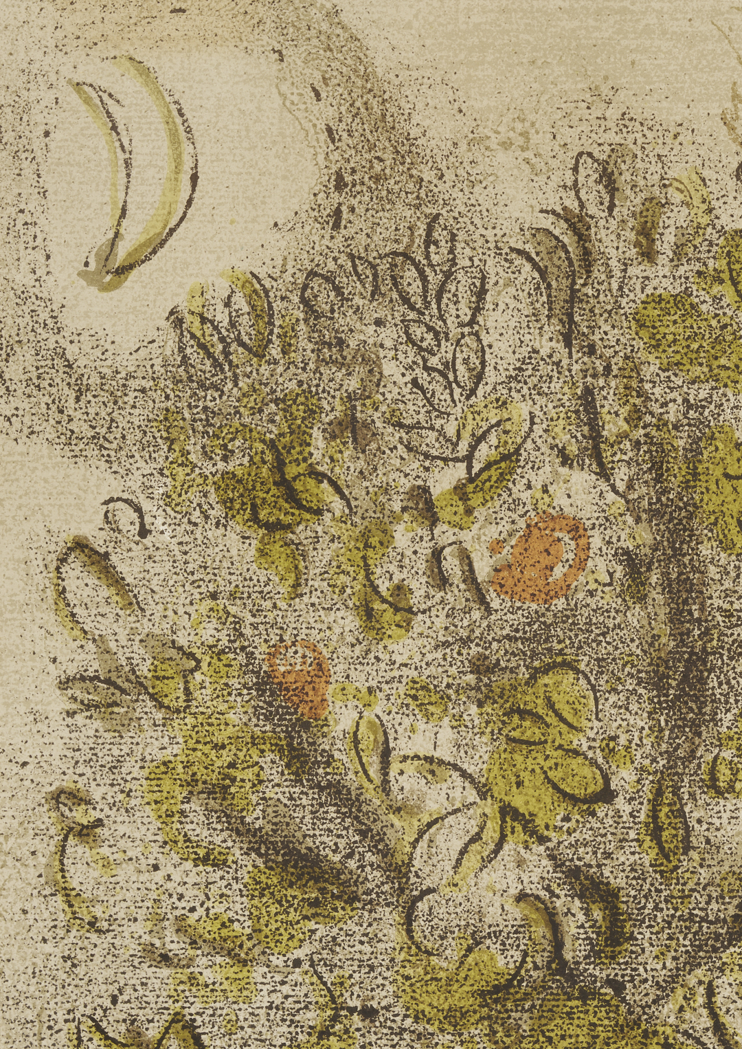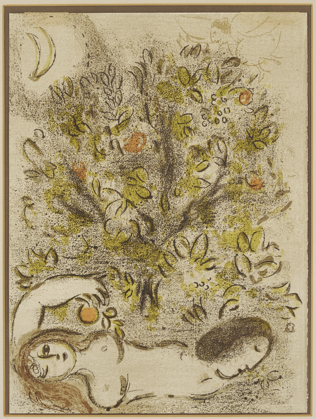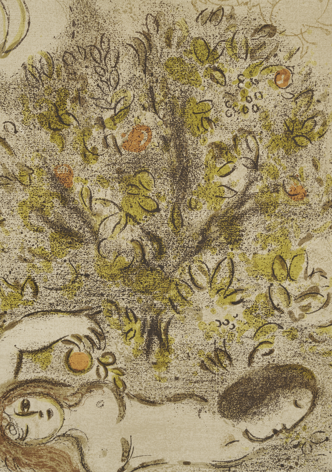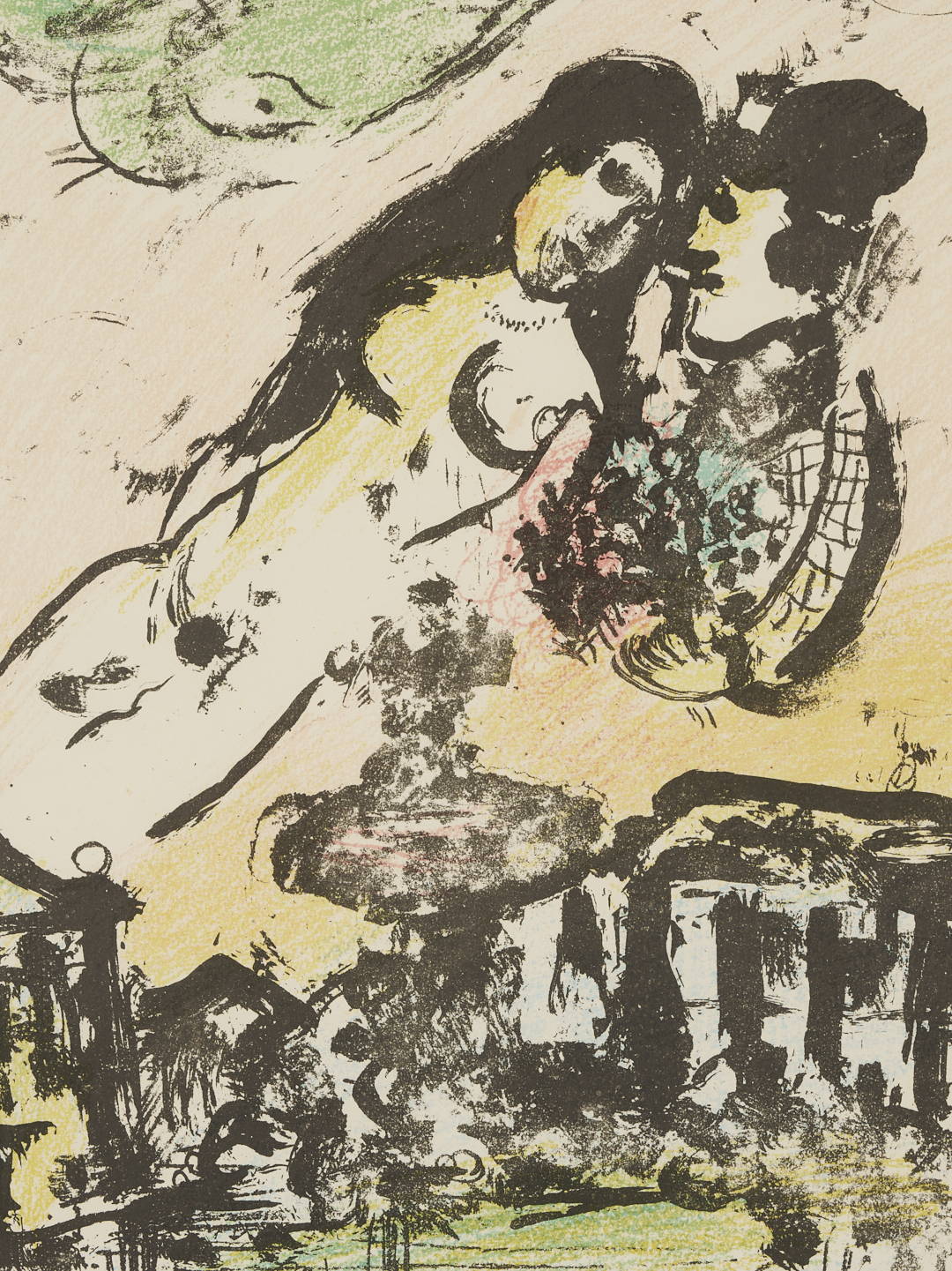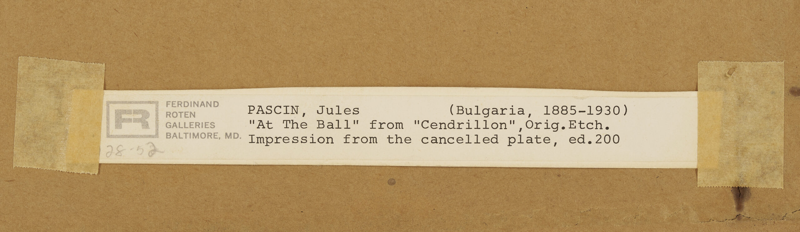 Items 1-2: Two (2) Marc Chagall (French/Russian, 1887-1985) lithographs, “Tamar, Daughter-in-Law of Judah” and “Paradise.” Both from Drawings for the Bible, 1960, and both part of the unsigned book edition of 6500 printed by Mourlot, Paris, and published by Harcourt, Brace and Company, New York. Both floated under glass in painted wooden frames. “Tamar…” sheet: 13 3/4 in. H x 10 1/4 in. W. “Tamar” framed: 21 3/4 in. H x 17 1/2 in. W. “Paradise” sight: 13 5/8 in. “Paradise” framed: 21 1/4 in. H x 17 in. W. Item 3: “The Lovers’ Heaven” from Fernand Mourlot’s CHAGALL LITHOGRAPHIE II, 1963. Unsigned. Printed and published by Mourlot, Paris. Housed under glass in an ebonized wood frame with cream mat. Sight: 11 3/4 in. H x 9 in. W. Framed: 19 1/4 in. H x 15 5/8 in. W. Item 4: Jules Pascin (French, 1885-1930) etching titled “At the Ball” from the Cendrillon. Signed in the plate and numbered 99/200 lower left. The impression is from the canceled plate. Ferdinand Roten Galleries, Baltimore label en verso. Housed in an ebonized wood frame. Image: 13 1/2 in. H x 10 in. W. Framed: 21 1/4 in. H x 17 1/8 in. W.