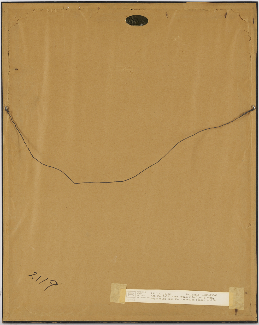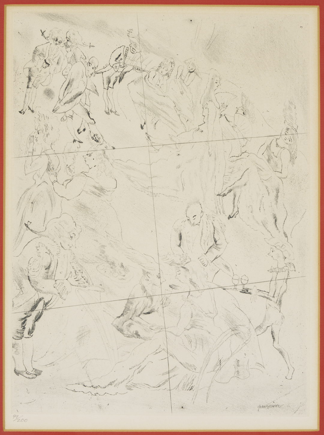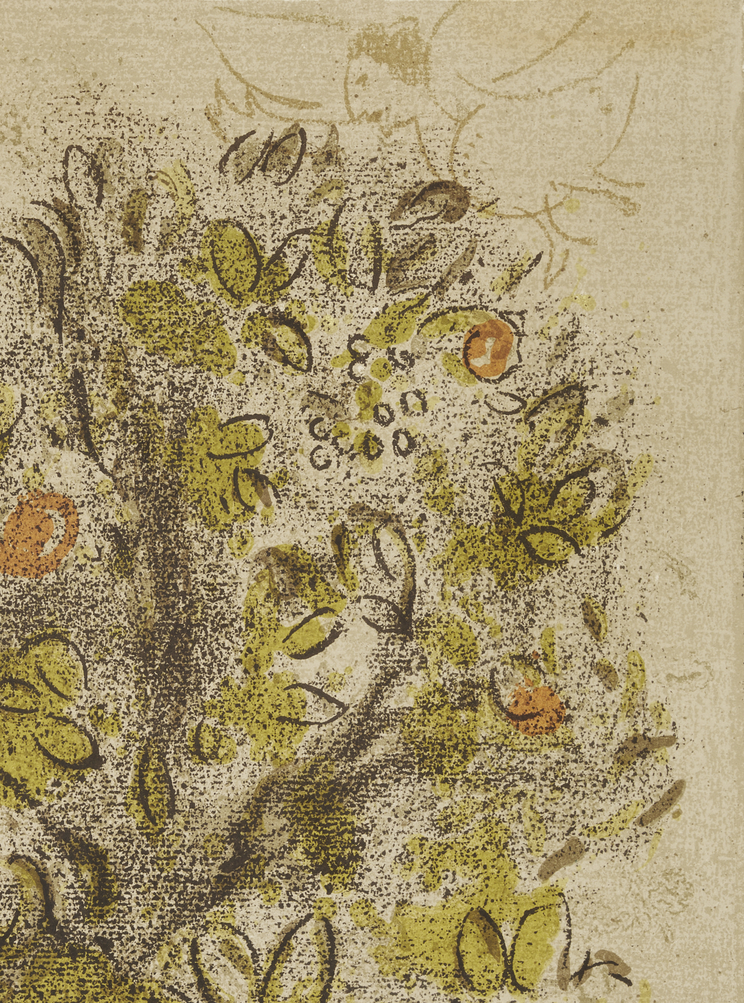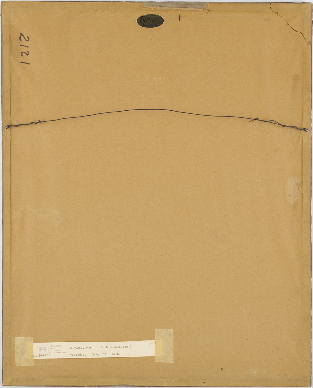 Items 1-2: Two (2) Marc Chagall (French/Russian, 1887-1985) lithographs, “Tamar, Daughter-in-Law of Judah” and “Paradise.” Both from Drawings for the Bible, 1960, and both part of the unsigned book edition of 6500 printed by Mourlot, Paris, and published by Harcourt, Brace and Company, New York. Both floated under glass in painted wooden frames. “Tamar…” sheet: 13 3/4 in. H x 10 1/4 in. W. “Tamar” framed: 21 3/4 in. H x 17 1/2 in. W. “Paradise” sight: 13 5/8 in. “Paradise” framed: 21 1/4 in. H x 17 in. W. Item 3: “The Lovers’ Heaven” from Fernand Mourlot’s CHAGALL LITHOGRAPHIE II, 1963. Unsigned. Printed and published by Mourlot, Paris. Housed under glass in an ebonized wood frame with cream mat. Sight: 11 3/4 in. H x 9 in. W. Framed: 19 1/4 in. H x 15 5/8 in. W. Item 4: Jules Pascin (French, 1885-1930) etching titled “At the Ball” from the Cendrillon. Signed in the plate and numbered 99/200 lower left. The impression is from the canceled plate. Ferdinand Roten Galleries, Baltimore label en verso. Housed in an ebonized wood frame. Image: 13 1/2 in. H x 10 in. W. Framed: 21 1/4 in. H x 17 1/8 in. W.