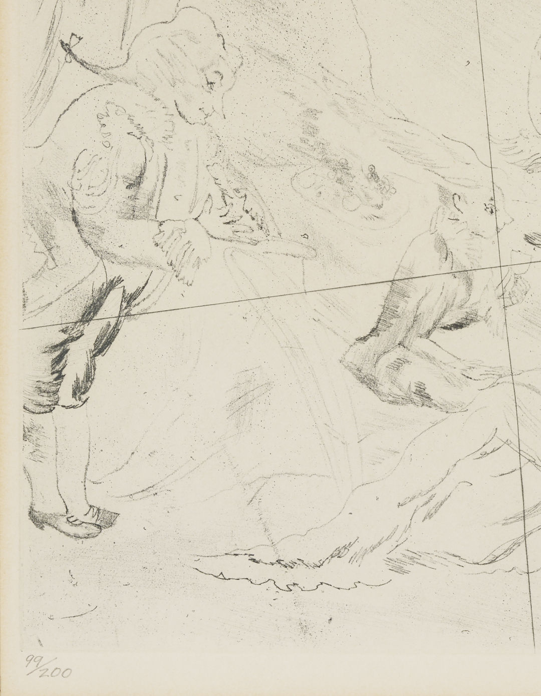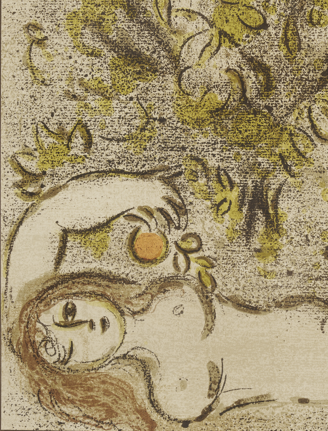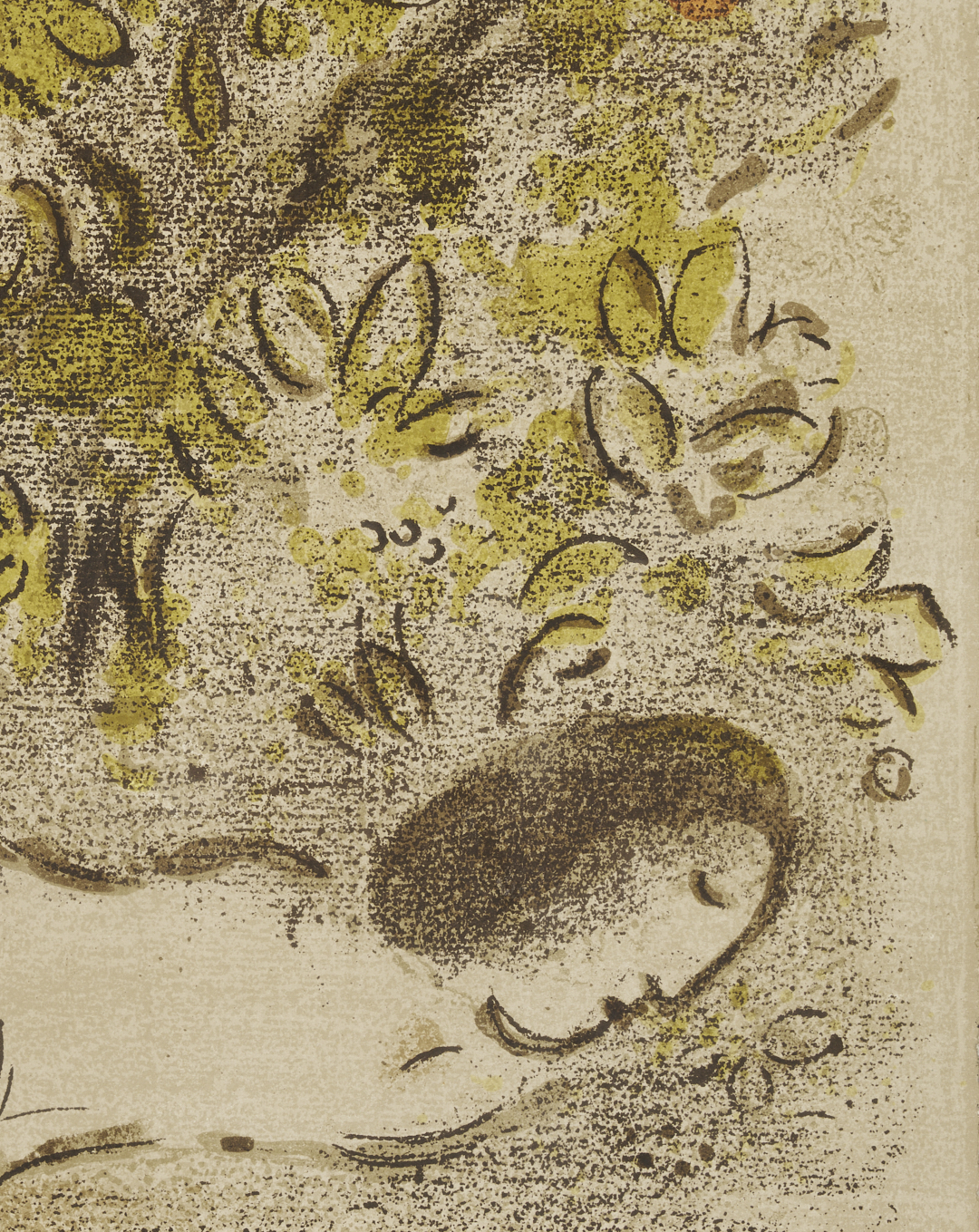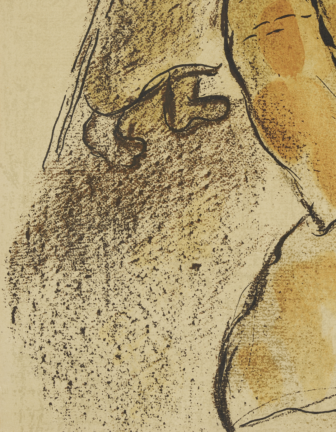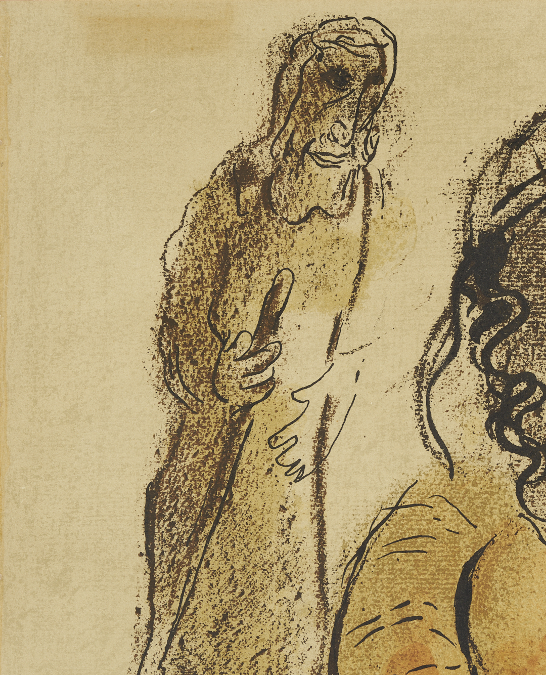 Items 1-2: Two (2) Marc Chagall (French/Russian, 1887-1985) lithographs, “Tamar, Daughter-in-Law of Judah” and “Paradise.” Both from Drawings for the Bible, 1960, and both part of the unsigned book edition of 6500 printed by Mourlot, Paris, and published by Harcourt, Brace and Company, New York. Both floated under glass in painted wooden frames. “Tamar…” sheet: 13 3/4 in. H x 10 1/4 in. W. “Tamar” framed: 21 3/4 in. H x 17 1/2 in. W. “Paradise” sight: 13 5/8 in. “Paradise” framed: 21 1/4 in. H x 17 in. W. Item 3: “The Lovers’ Heaven” from Fernand Mourlot’s CHAGALL LITHOGRAPHIE II, 1963. Unsigned. Printed and published by Mourlot, Paris. Housed under glass in an ebonized wood frame with cream mat. Sight: 11 3/4 in. H x 9 in. W. Framed: 19 1/4 in. H x 15 5/8 in. W. Item 4: Jules Pascin (French, 1885-1930) etching titled “At the Ball” from the Cendrillon. Signed in the plate and numbered 99/200 lower left. The impression is from the canceled plate. Ferdinand Roten Galleries, Baltimore label en verso. Housed in an ebonized wood frame. Image: 13 1/2 in. H x 10 in. W. Framed: 21 1/4 in. H x 17 1/8 in. W.