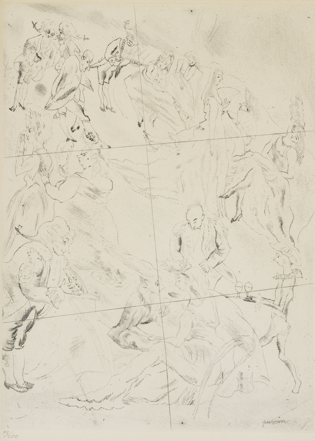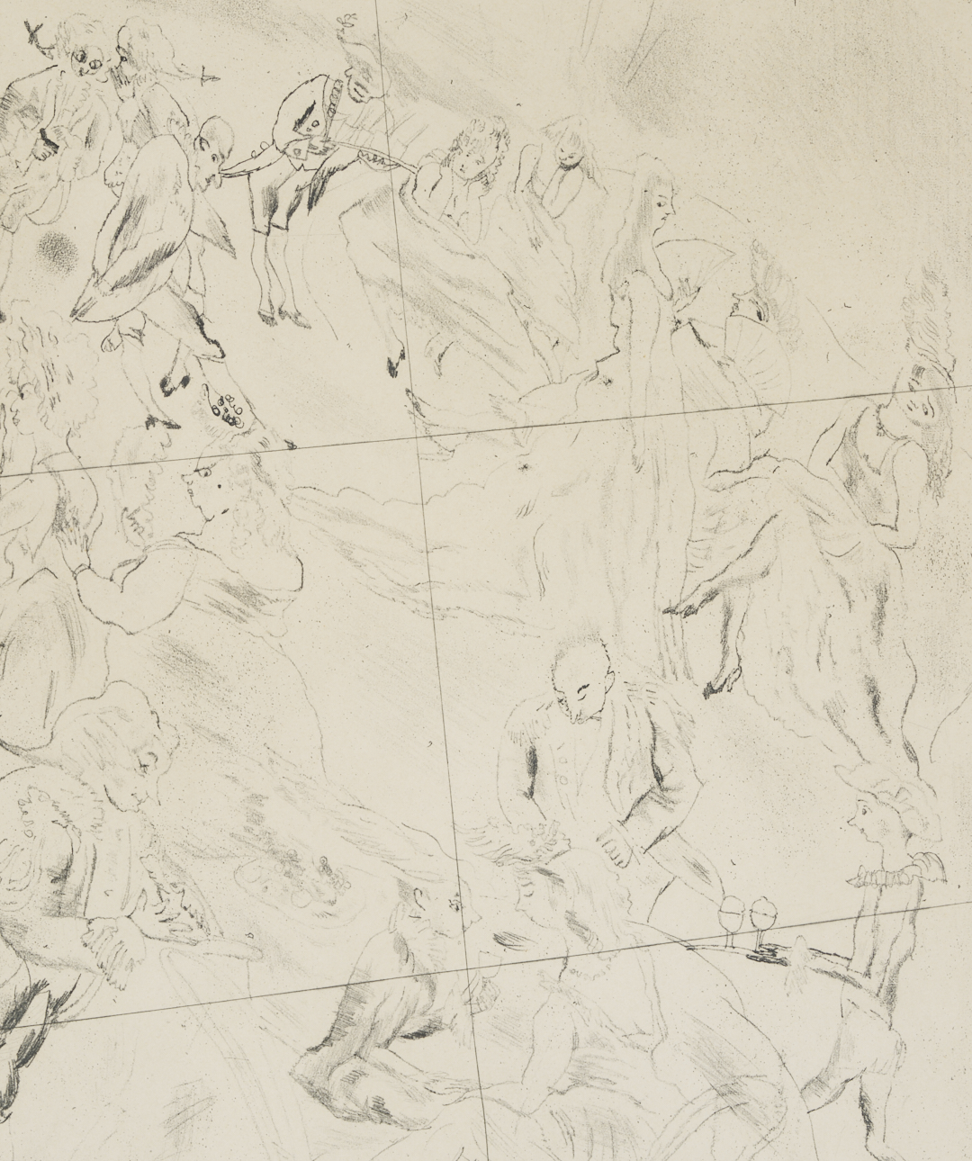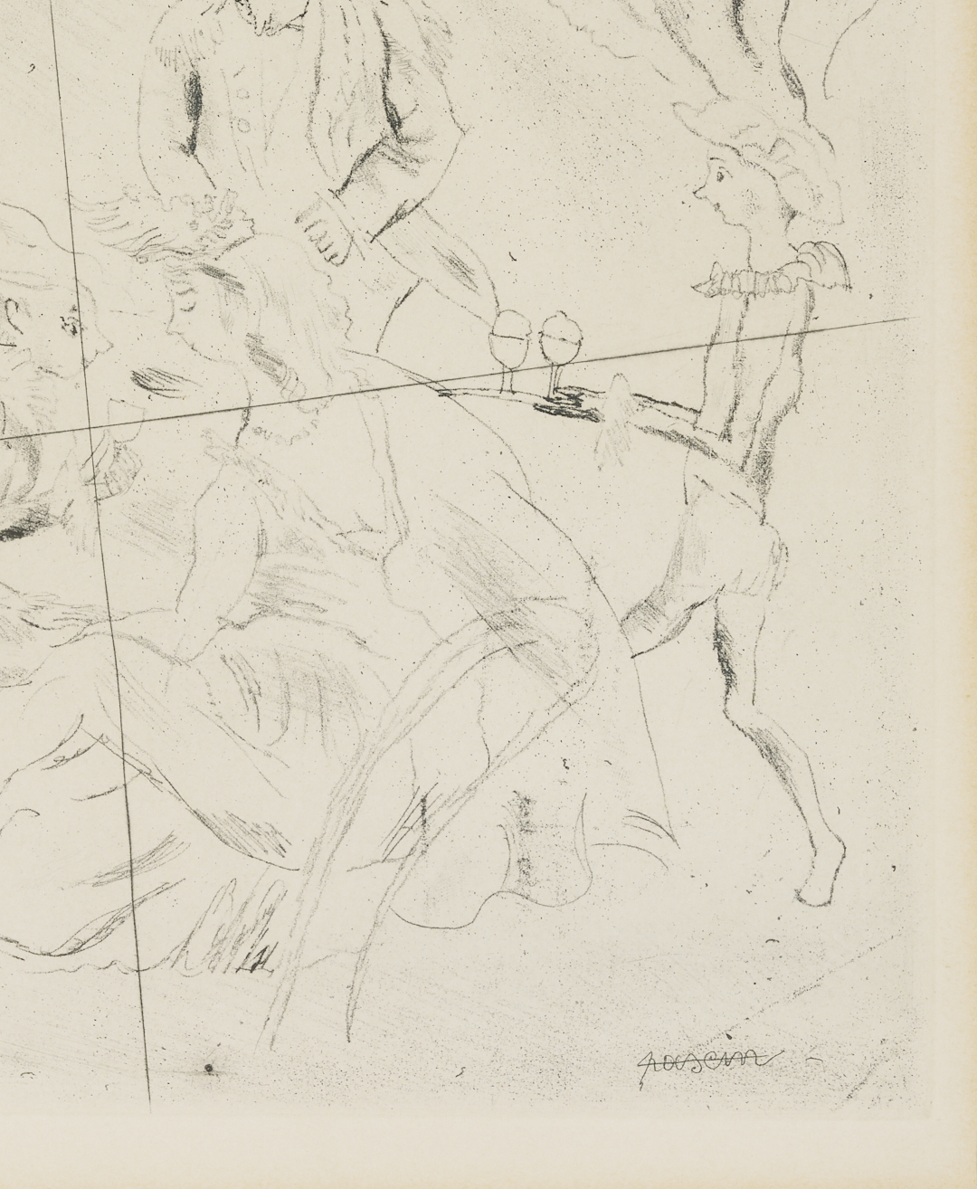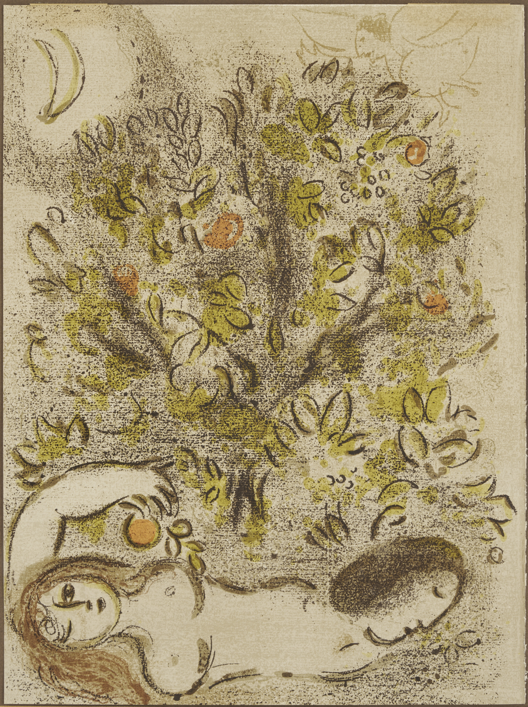 Items 1-2: Two (2) Marc Chagall (French/Russian, 1887-1985) lithographs, “Tamar, Daughter-in-Law of Judah” and “Paradise.” Both from Drawings for the Bible, 1960, and both part of the unsigned book edition of 6500 printed by Mourlot, Paris, and published by Harcourt, Brace and Company, New York. Both floated under glass in painted wooden frames. “Tamar…” sheet: 13 3/4 in. H x 10 1/4 in. W. “Tamar” framed: 21 3/4 in. H x 17 1/2 in. W. “Paradise” sight: 13 5/8 in. “Paradise” framed: 21 1/4 in. H x 17 in. W. Item 3: “The Lovers’ Heaven” from Fernand Mourlot’s CHAGALL LITHOGRAPHIE II, 1963. Unsigned. Printed and published by Mourlot, Paris. Housed under glass in an ebonized wood frame with cream mat. Sight: 11 3/4 in. H x 9 in. W. Framed: 19 1/4 in. H x 15 5/8 in. W. Item 4: Jules Pascin (French, 1885-1930) etching titled “At the Ball” from the Cendrillon. Signed in the plate and numbered 99/200 lower left. The impression is from the canceled plate. Ferdinand Roten Galleries, Baltimore label en verso. Housed in an ebonized wood frame. Image: 13 1/2 in. H x 10 in. W. Framed: 21 1/4 in. H x 17 1/8 in. W.