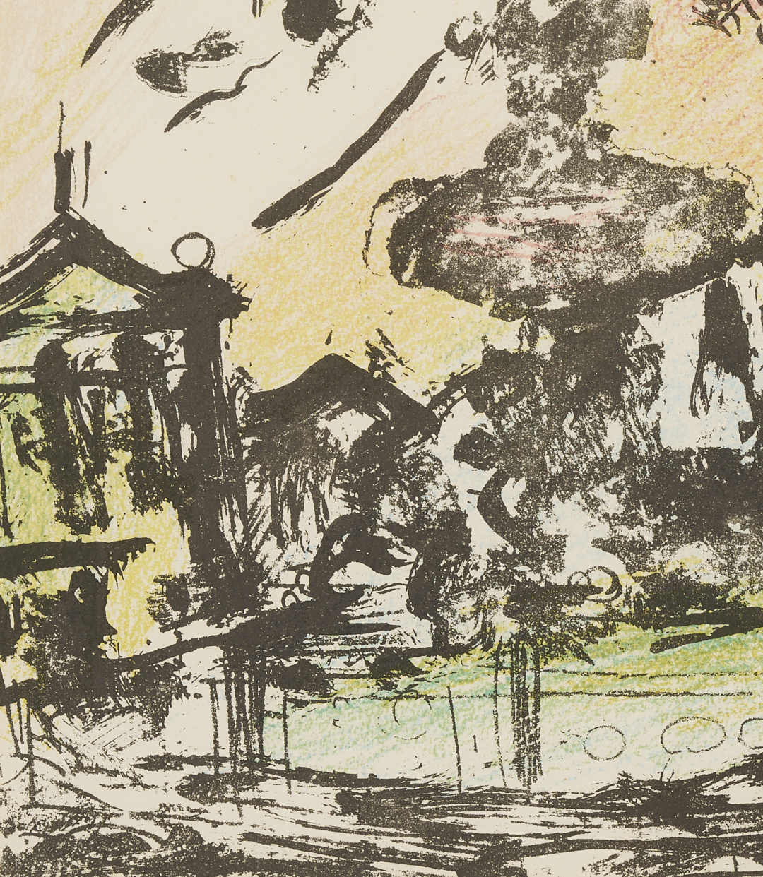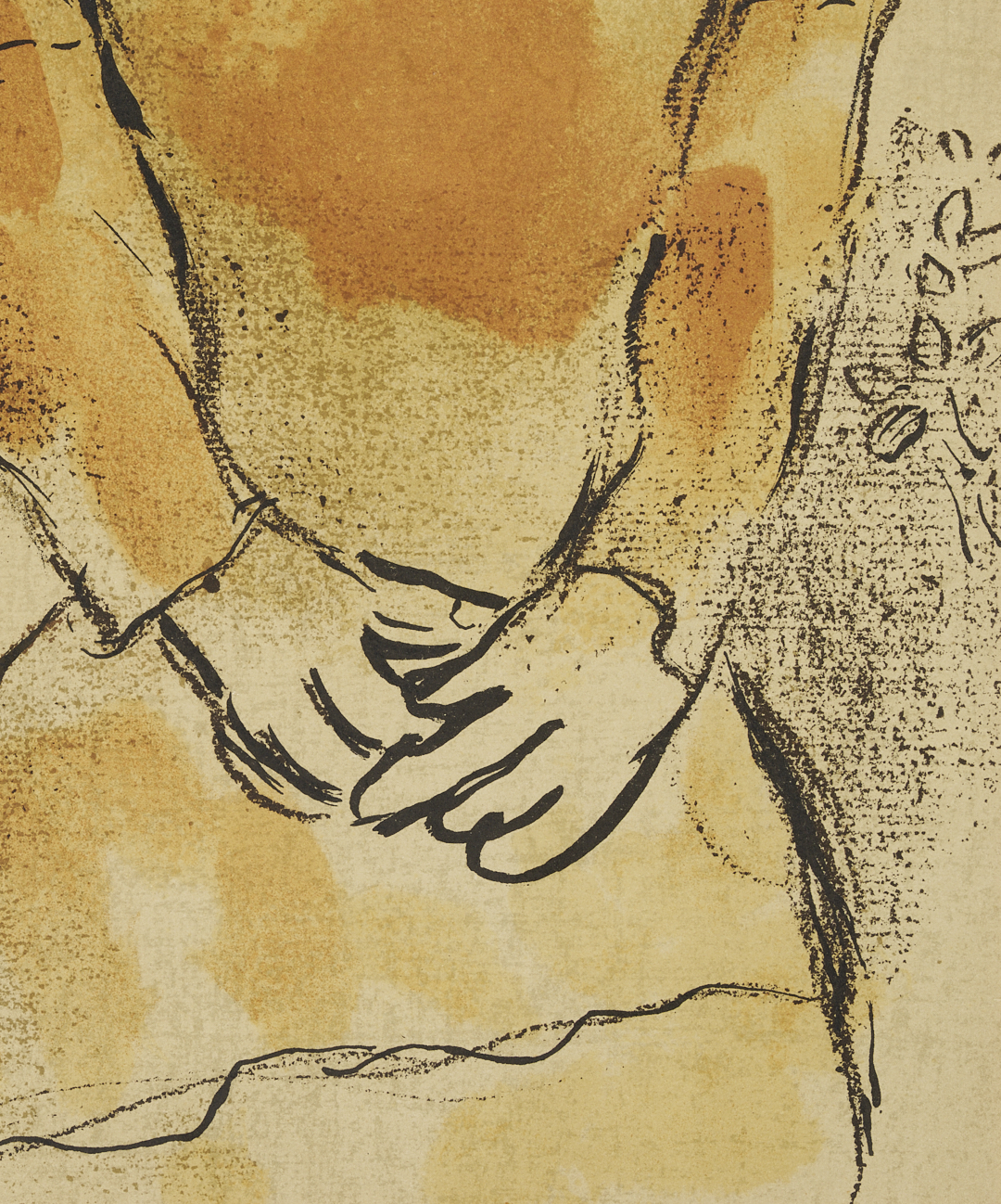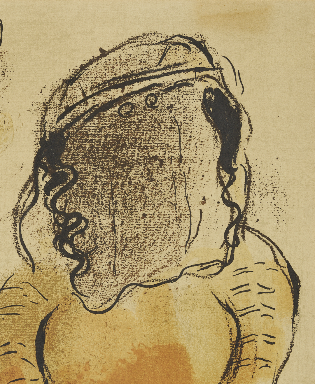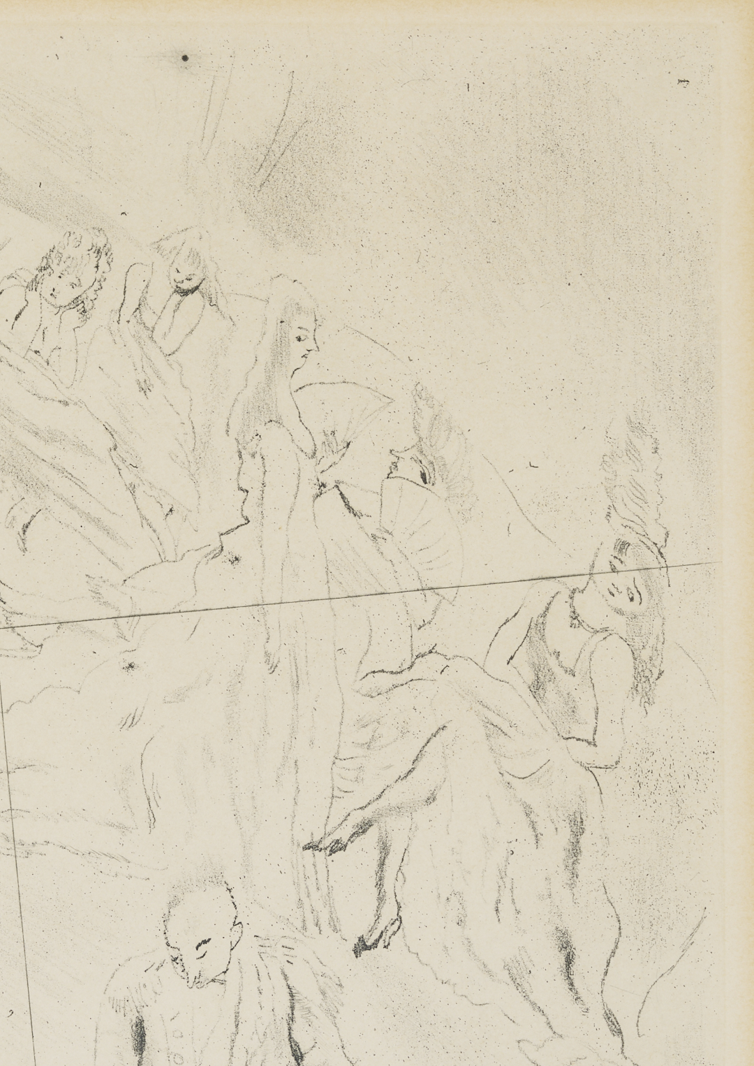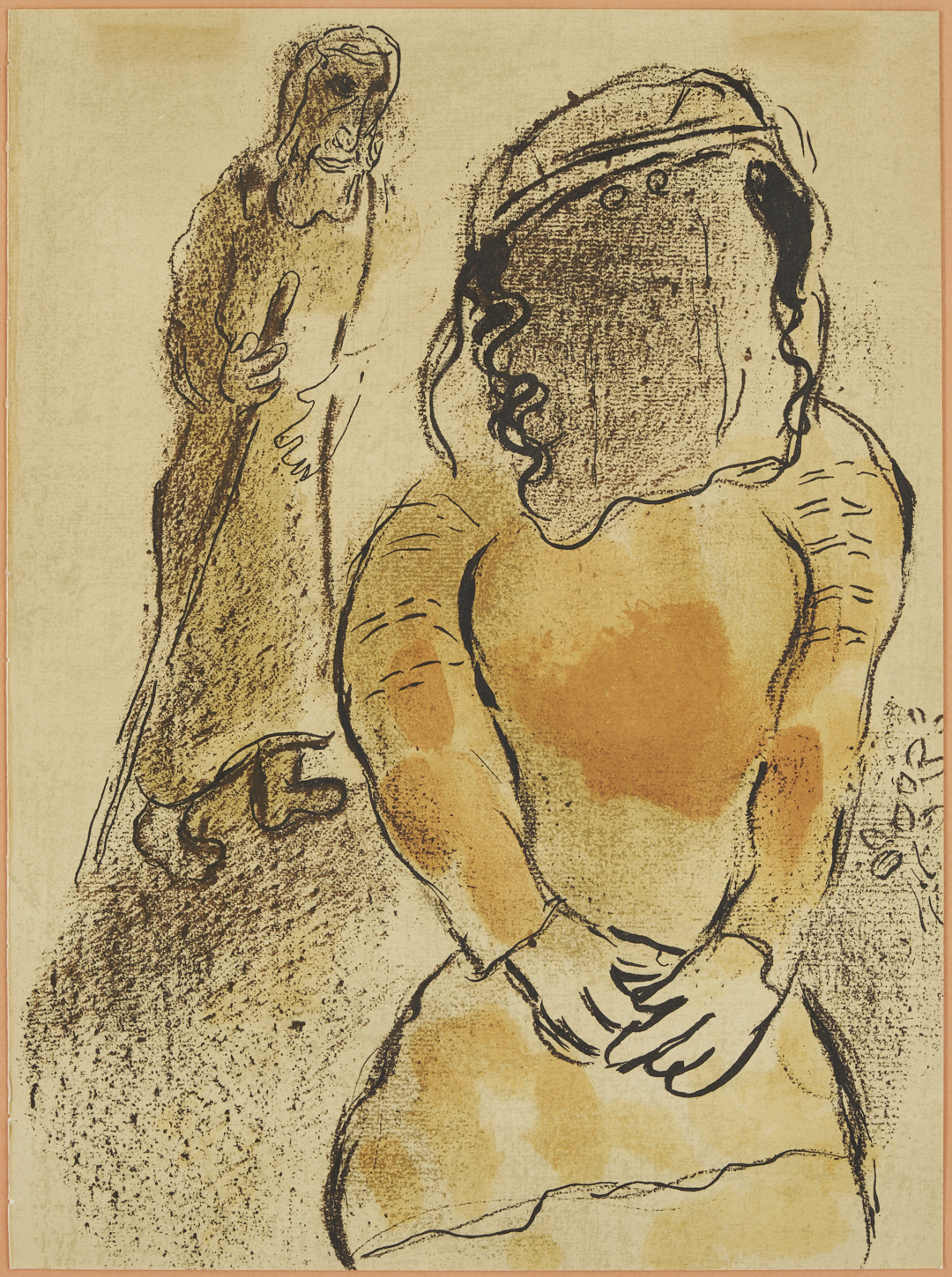 Items 1-2: Two (2) Marc Chagall (French/Russian, 1887-1985) lithographs, “Tamar, Daughter-in-Law of Judah” and “Paradise.” Both from Drawings for the Bible, 1960, and both part of the unsigned book edition of 6500 printed by Mourlot, Paris, and published by Harcourt, Brace and Company, New York. Both floated under glass in painted wooden frames. “Tamar…” sheet: 13 3/4 in. H x 10 1/4 in. W. “Tamar” framed: 21 3/4 in. H x 17 1/2 in. W. “Paradise” sight: 13 5/8 in. “Paradise” framed: 21 1/4 in. H x 17 in. W. Item 3: “The Lovers’ Heaven” from Fernand Mourlot’s CHAGALL LITHOGRAPHIE II, 1963. Unsigned. Printed and published by Mourlot, Paris. Housed under glass in an ebonized wood frame with cream mat. Sight: 11 3/4 in. H x 9 in. W. Framed: 19 1/4 in. H x 15 5/8 in. W. Item 4: Jules Pascin (French, 1885-1930) etching titled “At the Ball” from the Cendrillon. Signed in the plate and numbered 99/200 lower left. The impression is from the canceled plate. Ferdinand Roten Galleries, Baltimore label en verso. Housed in an ebonized wood frame. Image: 13 1/2 in. H x 10 in. W. Framed: 21 1/4 in. H x 17 1/8 in. W.