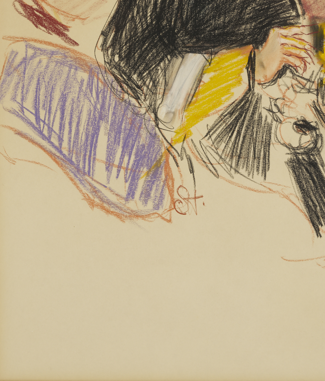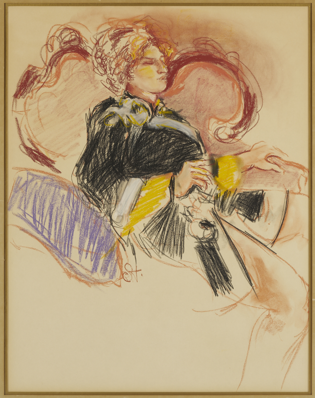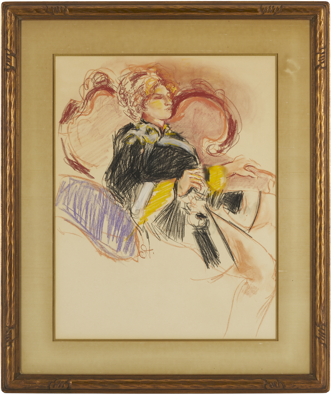 Pastel on paper drawing, laid down to a cardstock backing, of a woman in a short, black dress or robe seated informally in an upholstered chair. Monogrammed SH below hip. Housed under glass in a carved giltwood frame with a gold textile mat and gilt reveal. Sight: 22 3/4 in H x 17 1/2 in. W. Framed: 31 1/2 in. H x 26 1/2 in. W. 20th century.