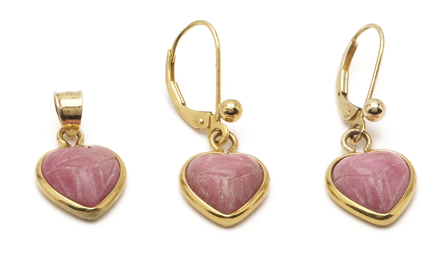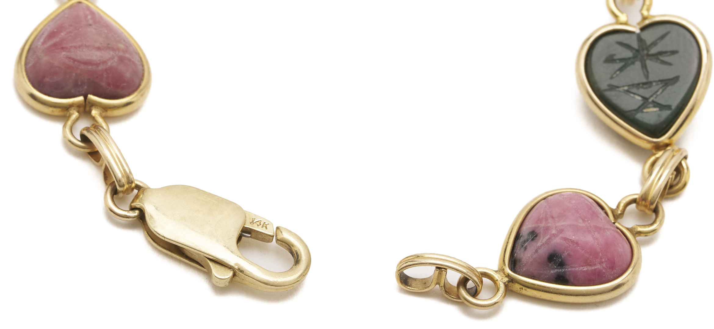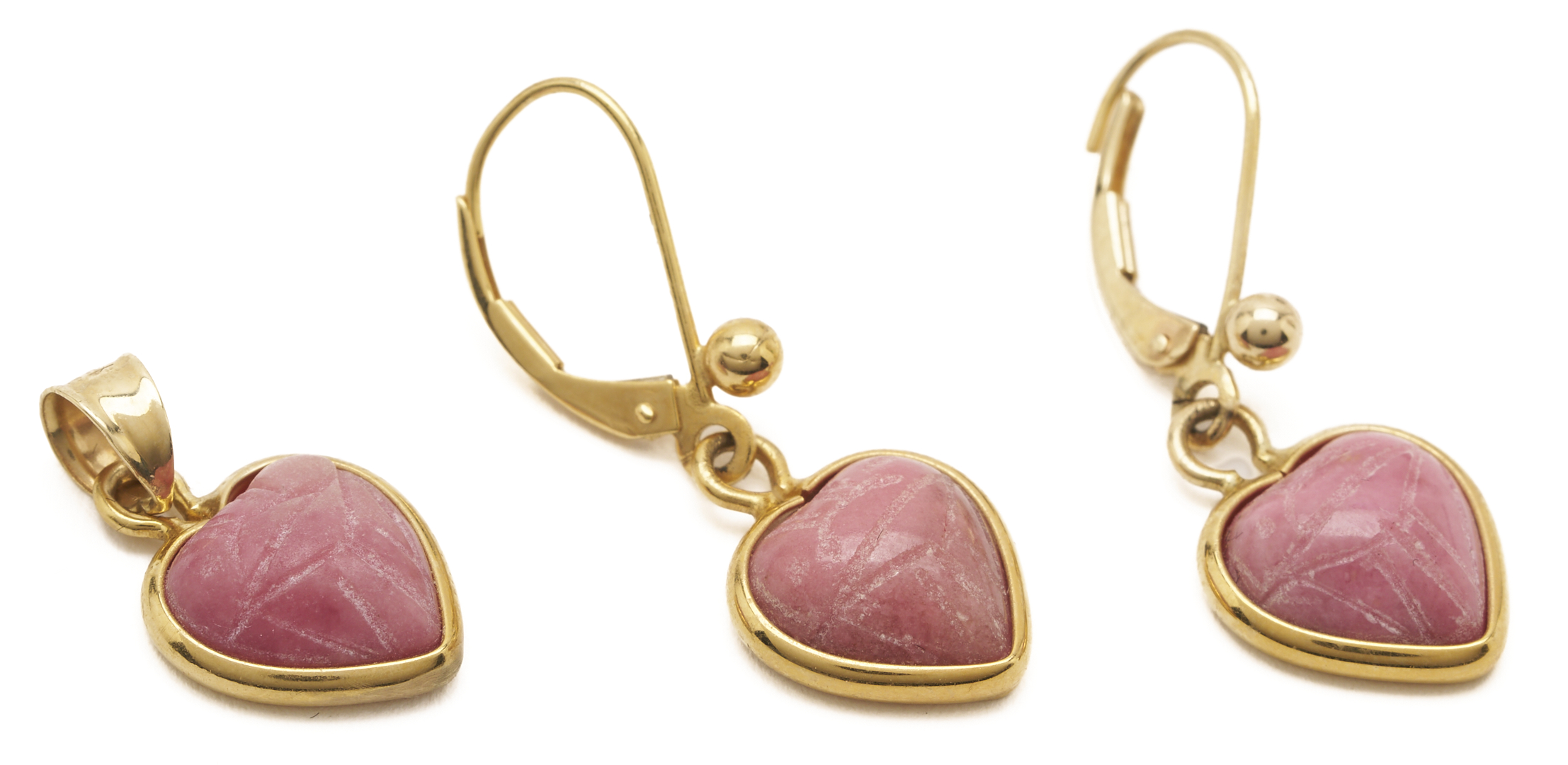 1st item: Ladies’ 14K yellow gold bracelet featuring two (2) rhodochrosite, one (1) nephrite jade, one (1) tiger’s eye, one (1) carnelian, one (1) jasper, and one (1) serpentinite all heart shaped cabochons with rune carvings. The bracelet is marked “14K” and XRF tests 14K gold. The bracelet is 7 in. L. and has a gross weight of 12.74 grams. 2nd item: Ladies’ 14K yellow gold pendant featuring one (1) heart shaped cabochon rhodochrosite with rune carvings. The pendant is marked “14K” and XRF tests 14K gold. The pendant is 3/4 in. x 3/8 in. and has a gross weight of 1.62 grams. 3rd item: Ladies’ 14K yellow gold pair of pierced back dangle earrings featuring two (2) heart shaped cabochon rhodochrosite with rune carvings. The earrings are marked “14K” and XRF test 14K gold. The earrings are 1 1/4 in. x 3/8 in. and have a gross weight of 3.61 grams. Gross weight of the lot is 17.97 grams.