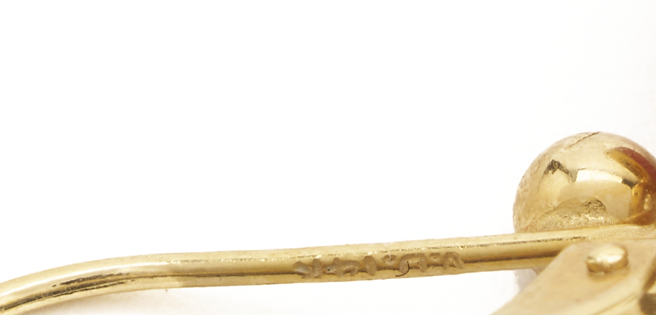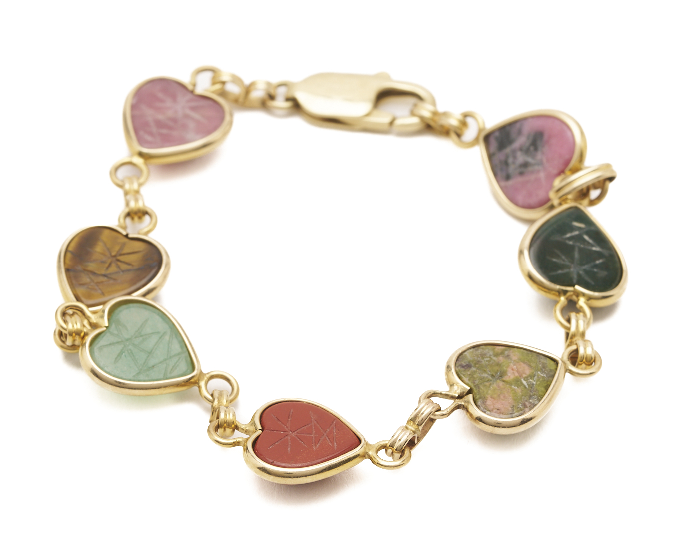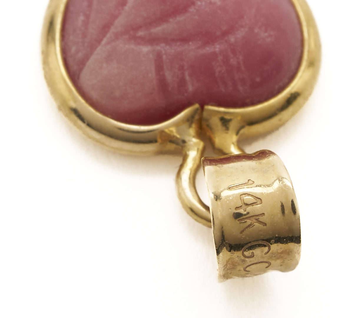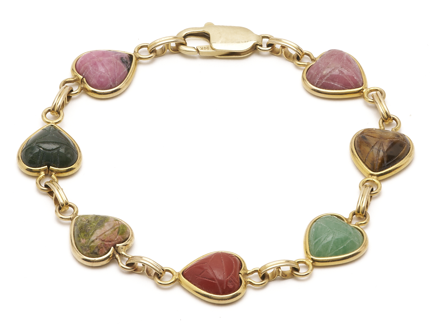 1st item: Ladies’ 14K yellow gold bracelet featuring two (2) rhodochrosite, one (1) nephrite jade, one (1) tiger’s eye, one (1) carnelian, one (1) jasper, and one (1) serpentinite all heart shaped cabochons with rune carvings. The bracelet is marked “14K” and XRF tests 14K gold. The bracelet is 7 in. L. and has a gross weight of 12.74 grams. 2nd item: Ladies’ 14K yellow gold pendant featuring one (1) heart shaped cabochon rhodochrosite with rune carvings. The pendant is marked “14K” and XRF tests 14K gold. The pendant is 3/4 in. x 3/8 in. and has a gross weight of 1.62 grams. 3rd item: Ladies’ 14K yellow gold pair of pierced back dangle earrings featuring two (2) heart shaped cabochon rhodochrosite with rune carvings. The earrings are marked “14K” and XRF test 14K gold. The earrings are 1 1/4 in. x 3/8 in. and have a gross weight of 3.61 grams. Gross weight of the lot is 17.97 grams.