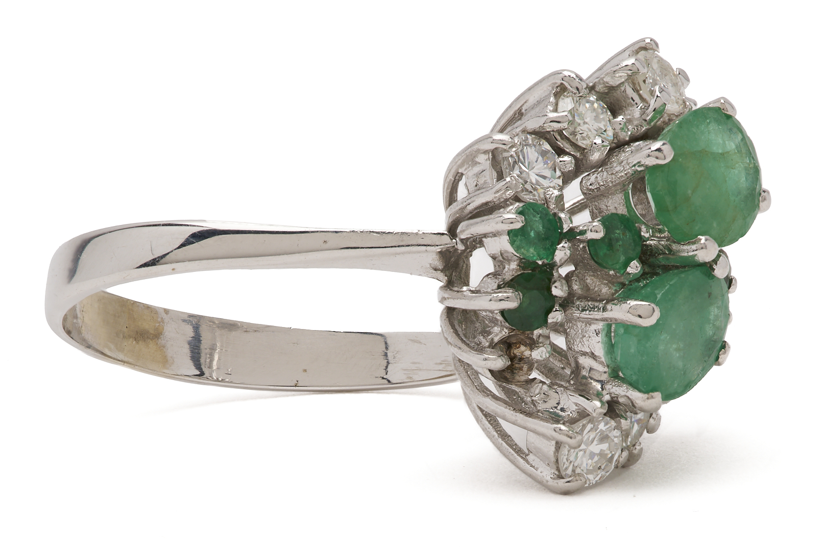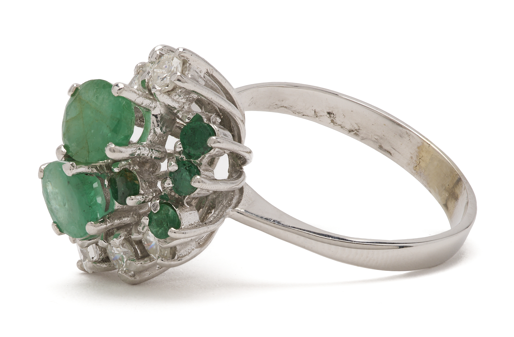Ladies’ 14K white gold cluster ring featuring nine (9) natural emeralds accented by six (6) round brilliant diamonds, approximately 0.84 carats together, Clarity-Si2, Color-H. The ring XRF tests 14K gold and is size 10 1/4. The gross weight of the ring is 7.33 grams.