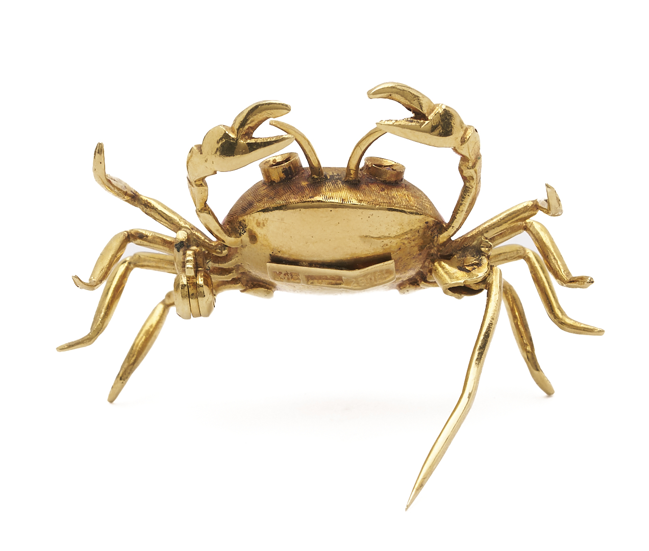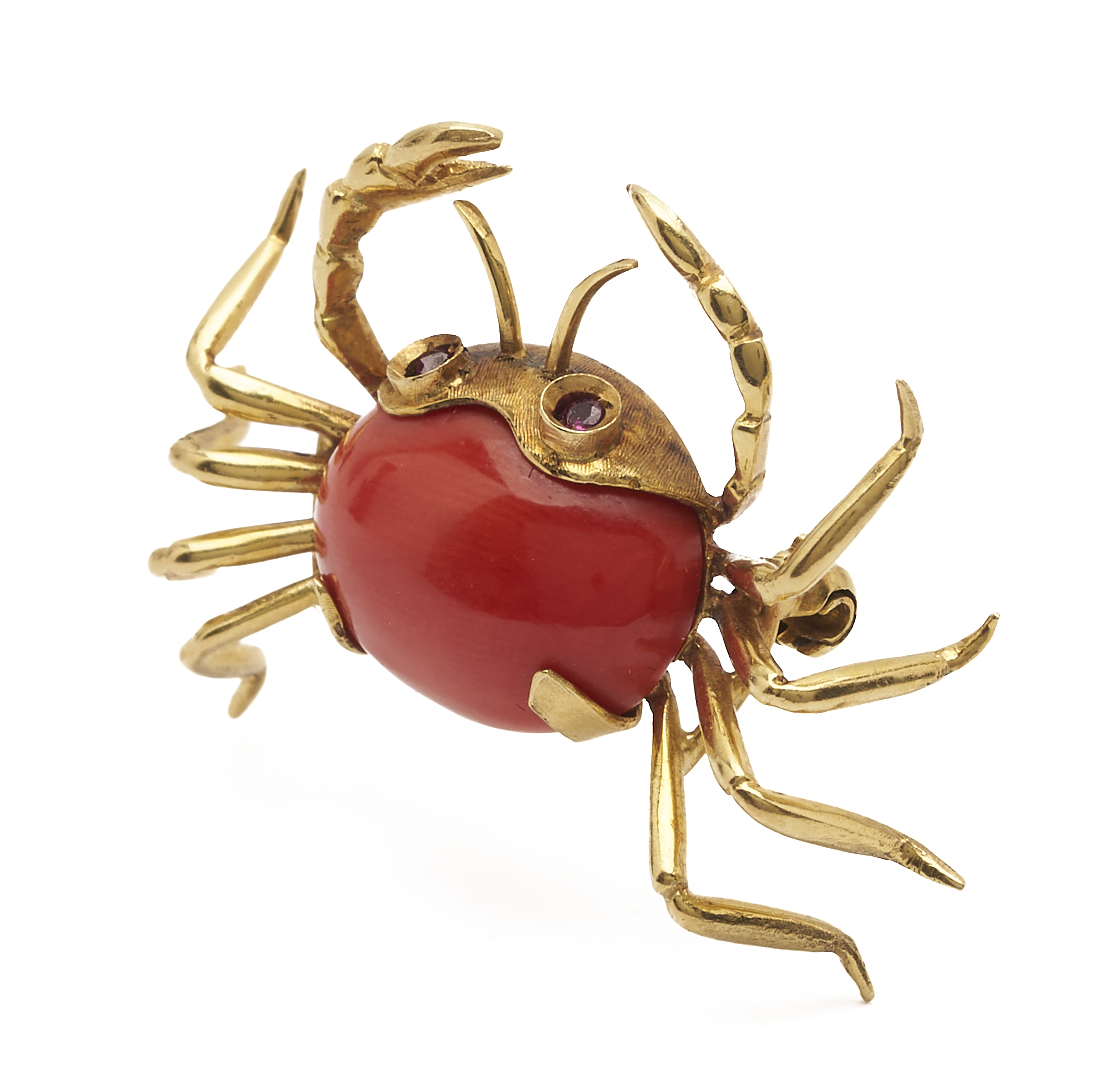 Ladies’ 18K yellow gold crab brooch featuring a natural cabochon coral. The brooch is marked “K18 Italy 260AL” and XRF tests 18K gold. The brooch is 1 1/4 in. x 1 in. and has a gross weight of 7.26 grams.