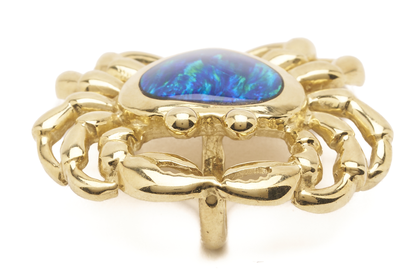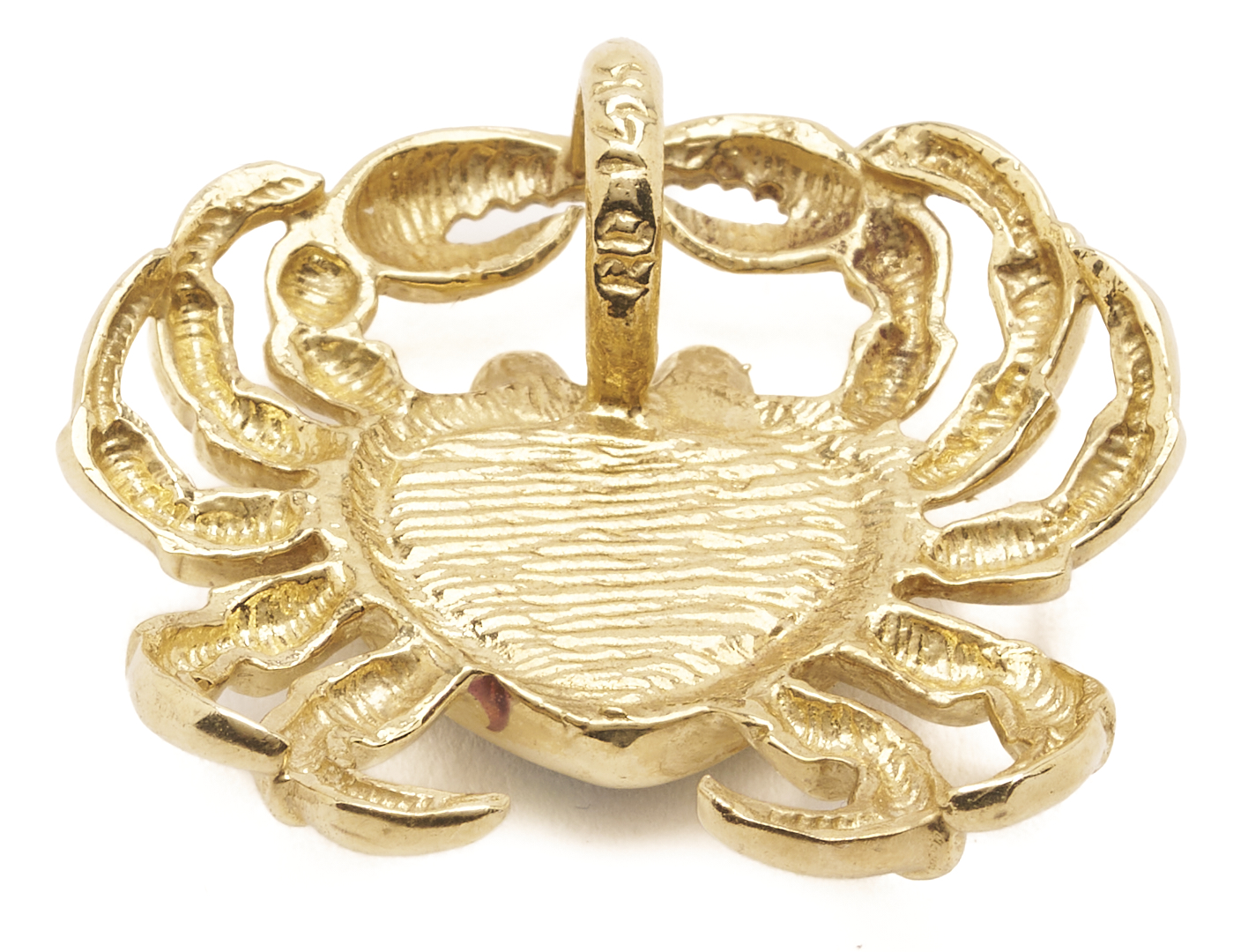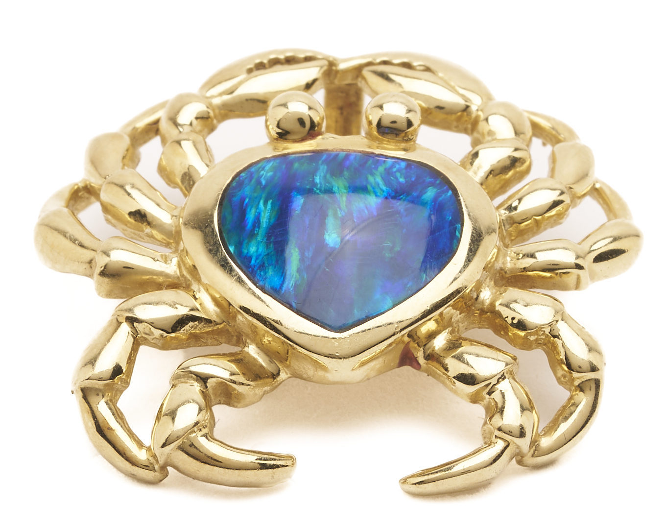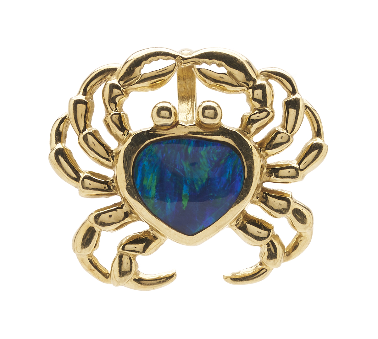 Ladies’ 14K yellow gold crab featuring one (1) free-form cut synthetic opal as the shell. The pendant is marked “RD 14K” and XRF tests 14K gold. The pendant is 1 in. x 1 1/4 in. and has a gross weight of 9.95 grams.