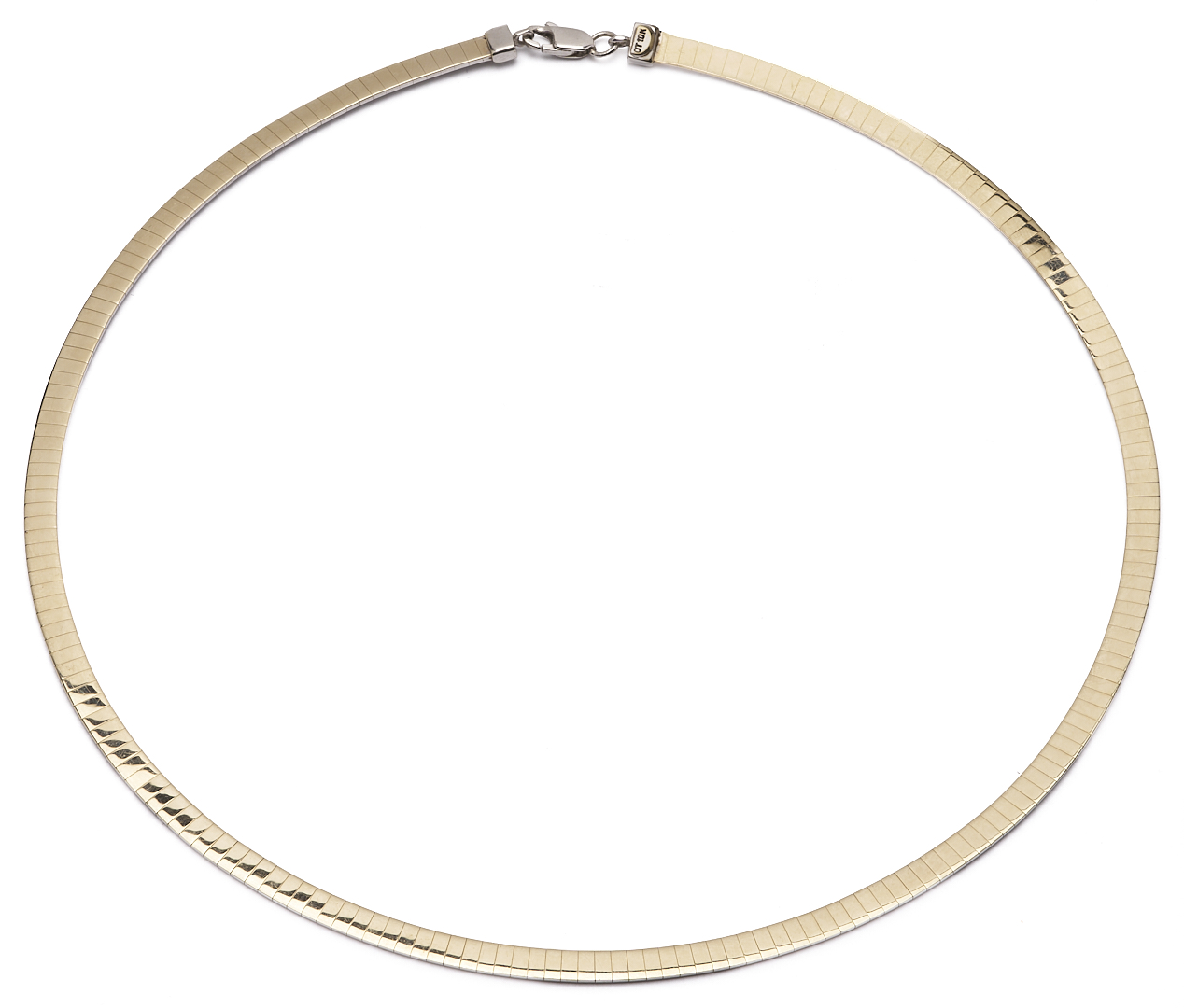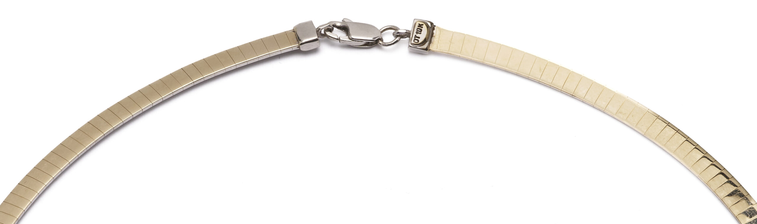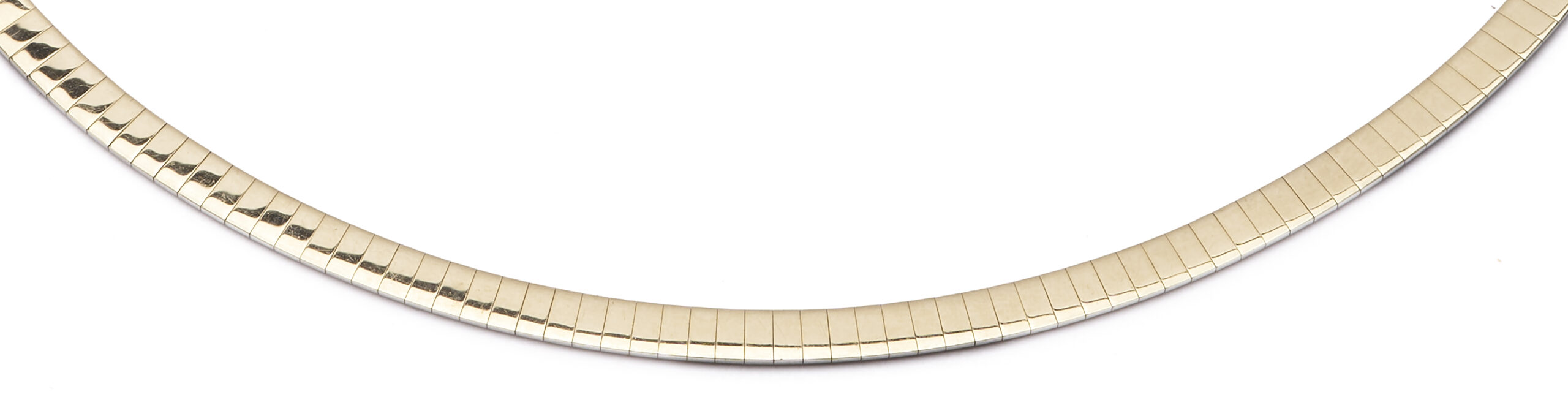 Ladies’ 10K yellow and white gold 4mm omega necklace. The necklace is marked “OT 10K” and XRF tests 10K gold. The necklace is 16″ L. and has a weight of 15.87 grams.