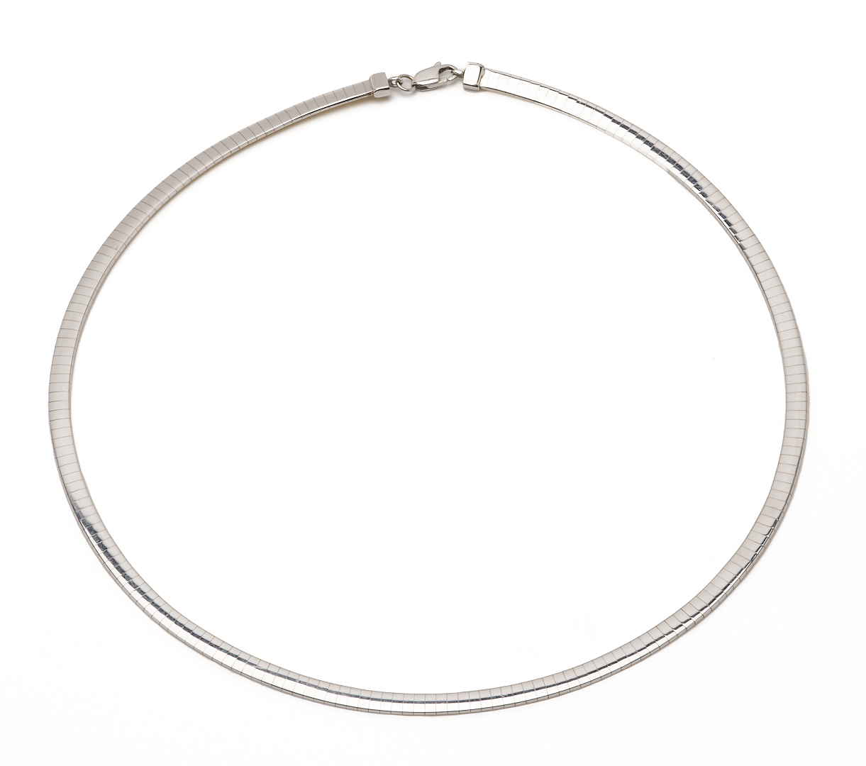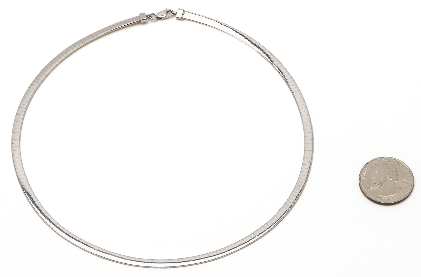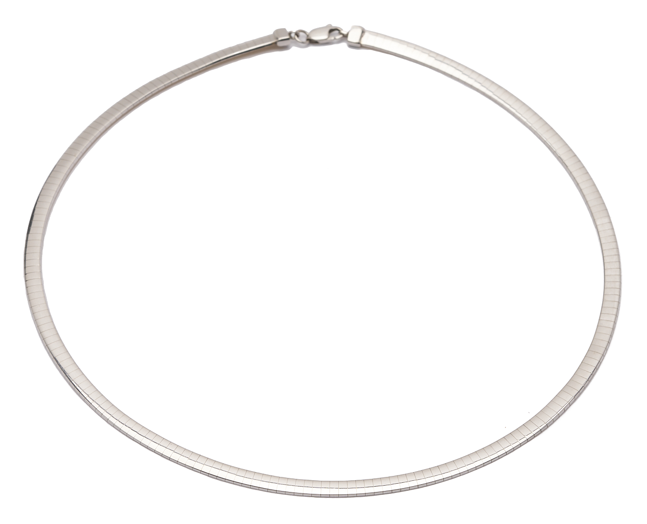 Ladies’ 10K yellow and white gold 4mm omega necklace. The necklace is marked “OT 10K” and XRF tests 10K gold. The necklace is 16″ L. and has a weight of 15.87 grams.