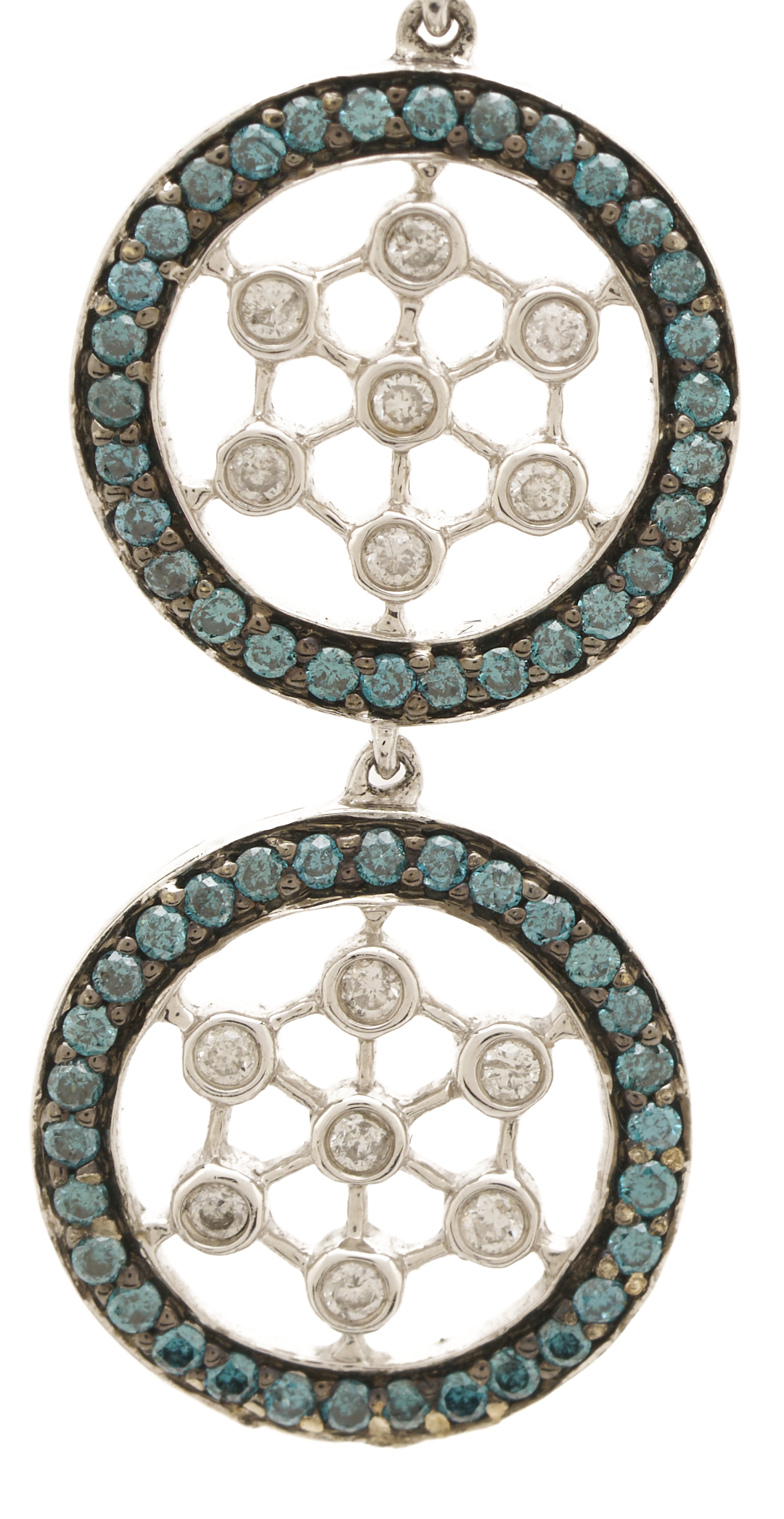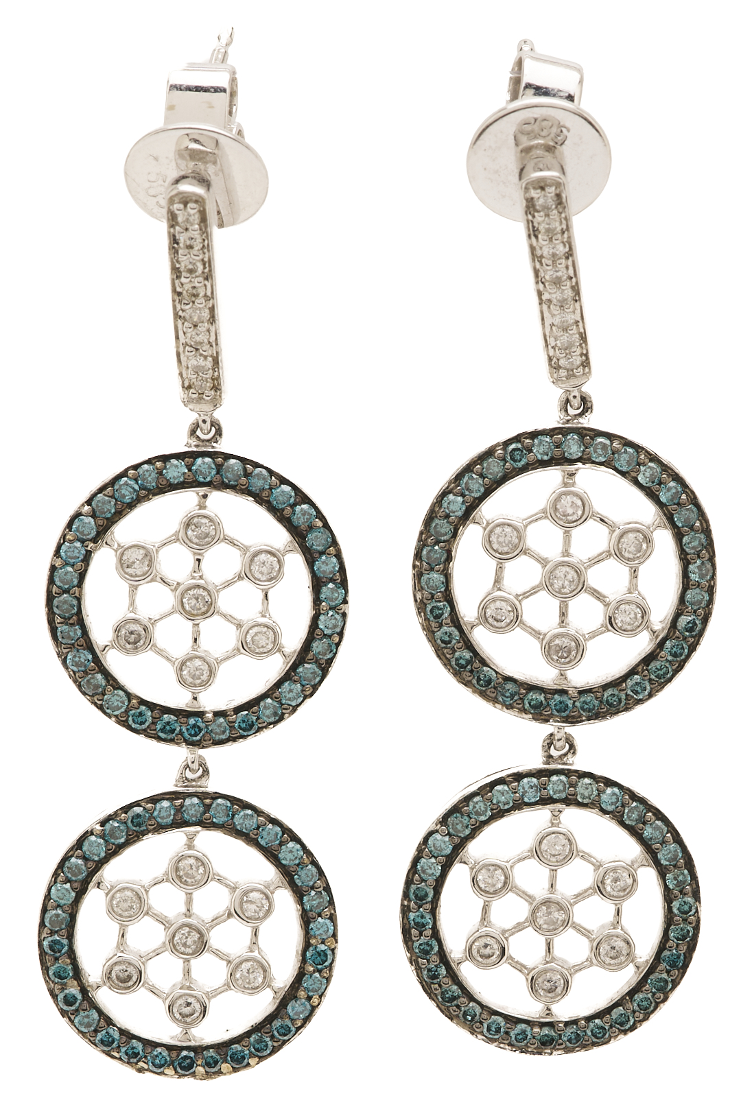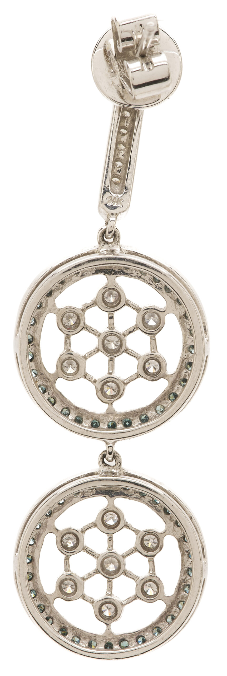 Ladies’ 14K white gold dangle earrings featuring forty-four (44) white melee diamonds and one hundred twenty (120) irradiated melee diamonds. The earrings are marked “585” and XRF test 14K gold. The earrings are 1 1/2 in. L. and have a gross weight of 7.41 grams.