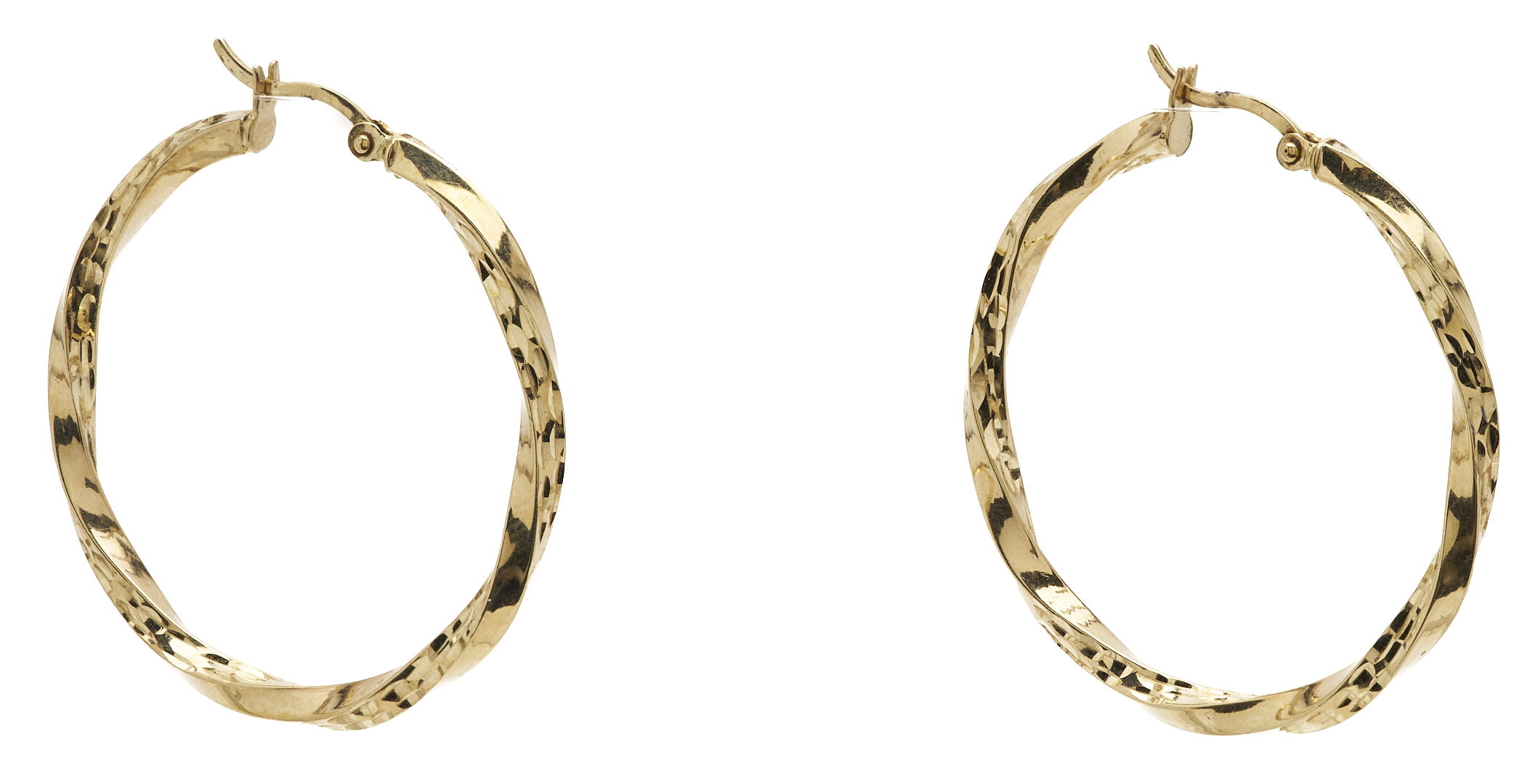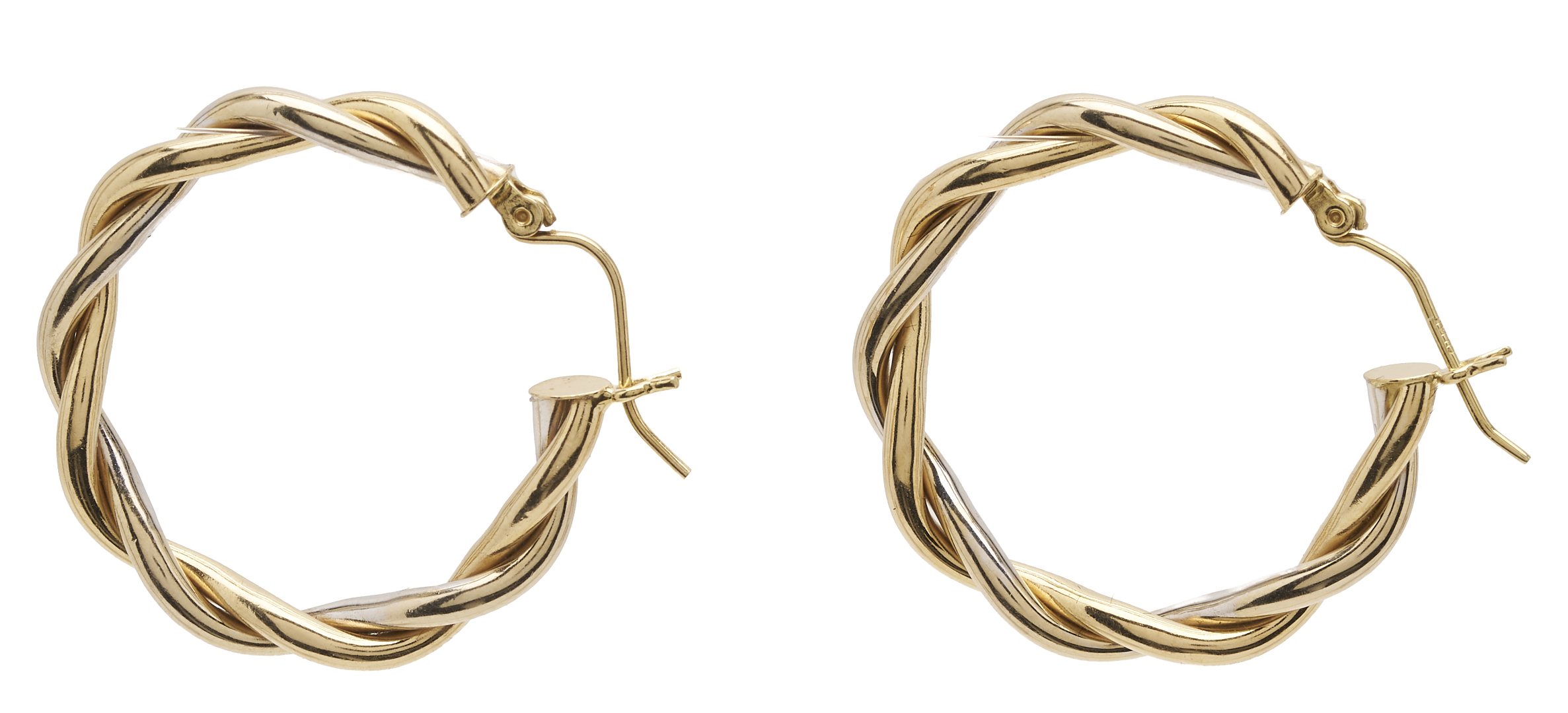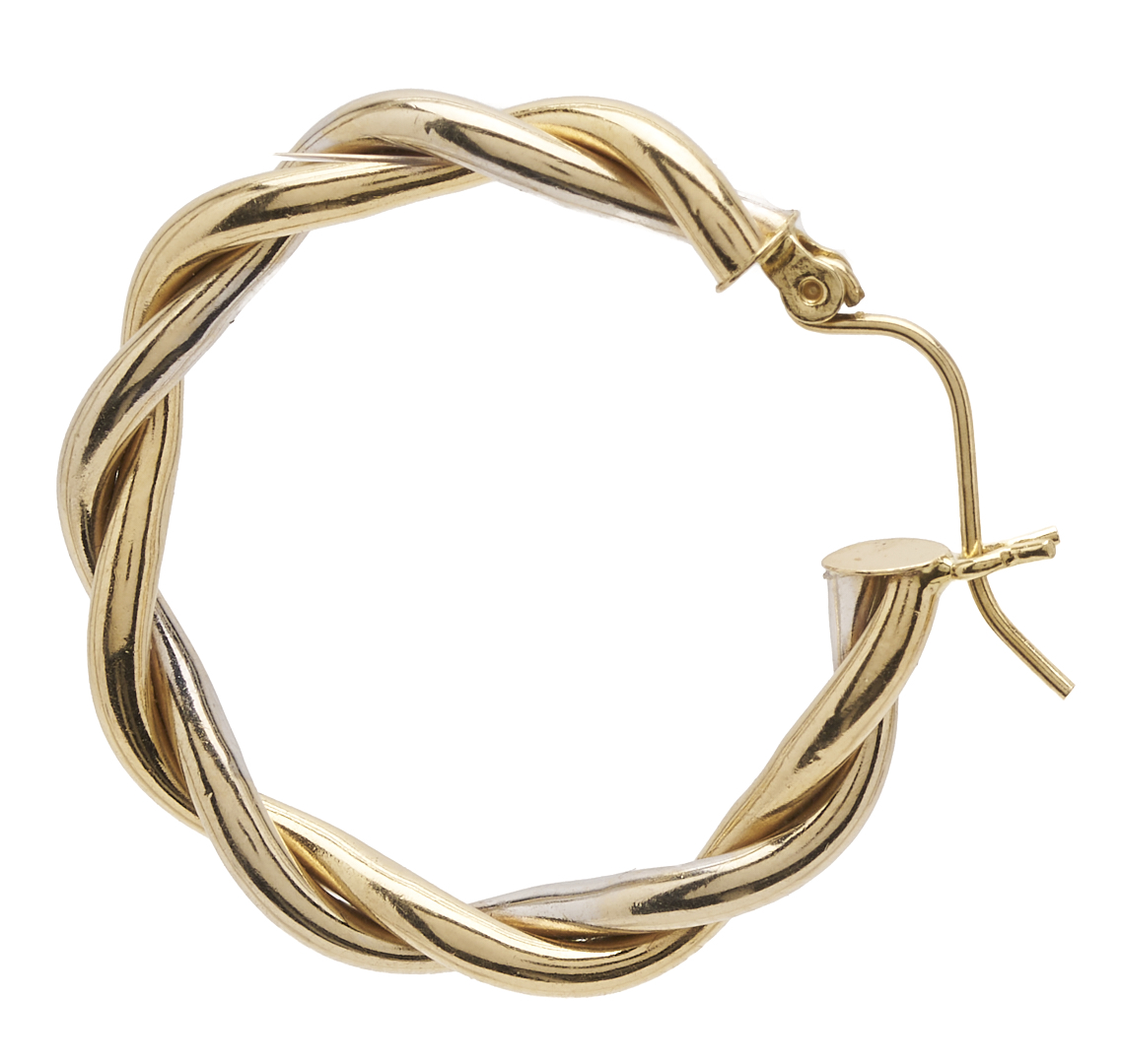 1st item: Ladies’ 14K yellow gold pierced back twisted hoop earrings. The earrings are marked “14K” and XRF test 14K gold. The earrings are 1 1/2 in. and have a gross weight of 5.62 grams. 2nd item: Ladies’ 14K yellow gold pierced back twisted hoop earrings. The earrings XRF test 14K gold. The earrings are 1 in. and have a gross weight of 3.53 grams. Gross weight of the lot is 9.15 grams.