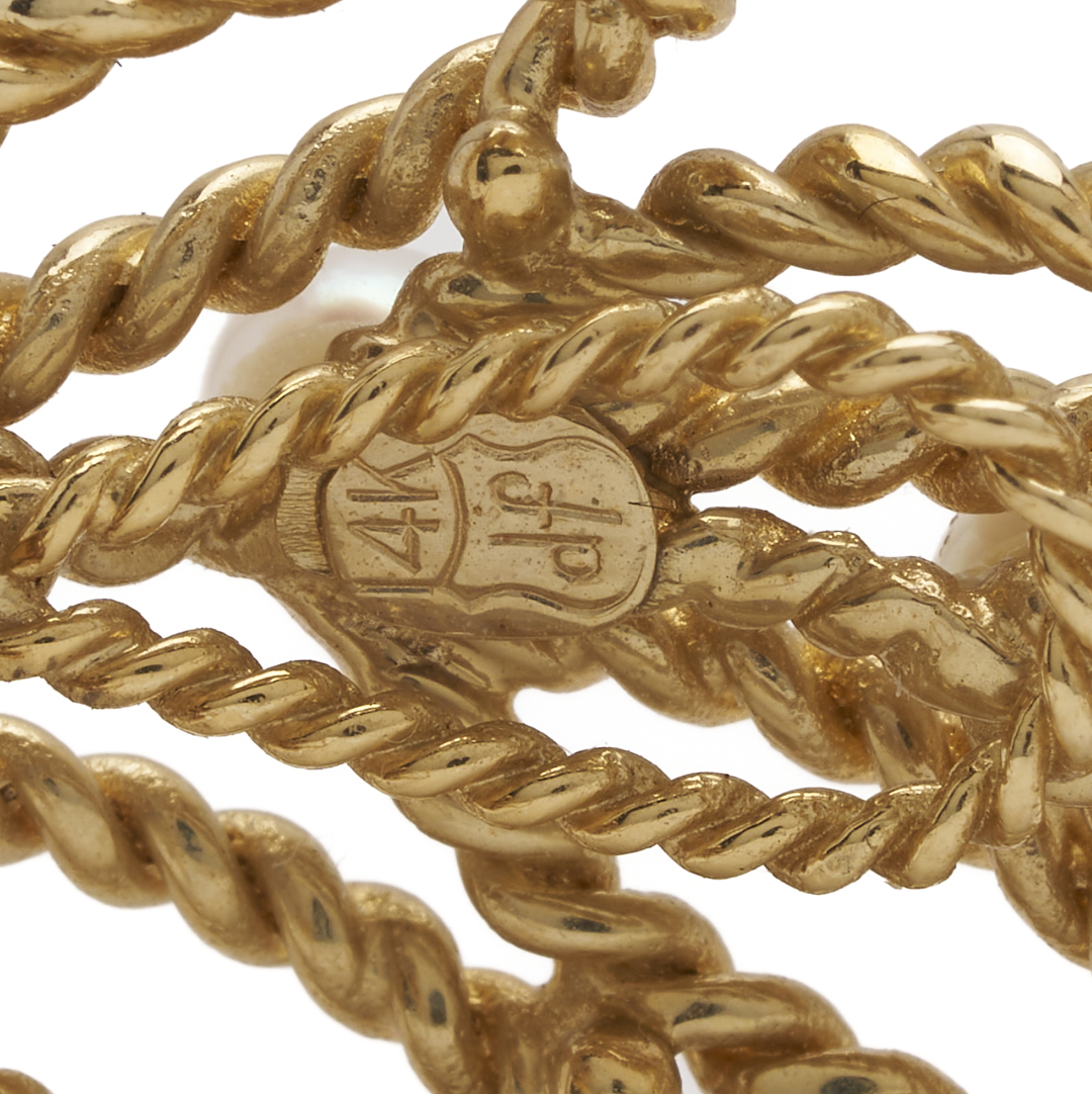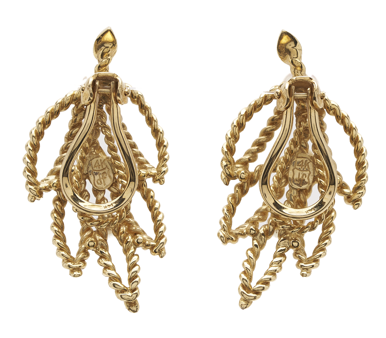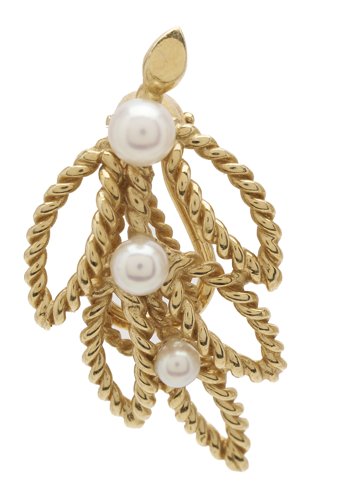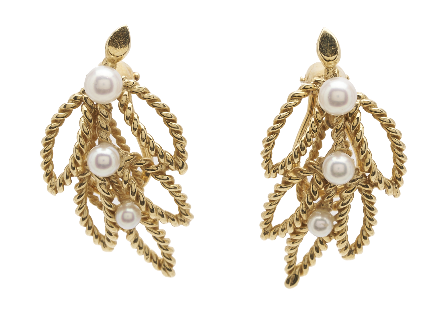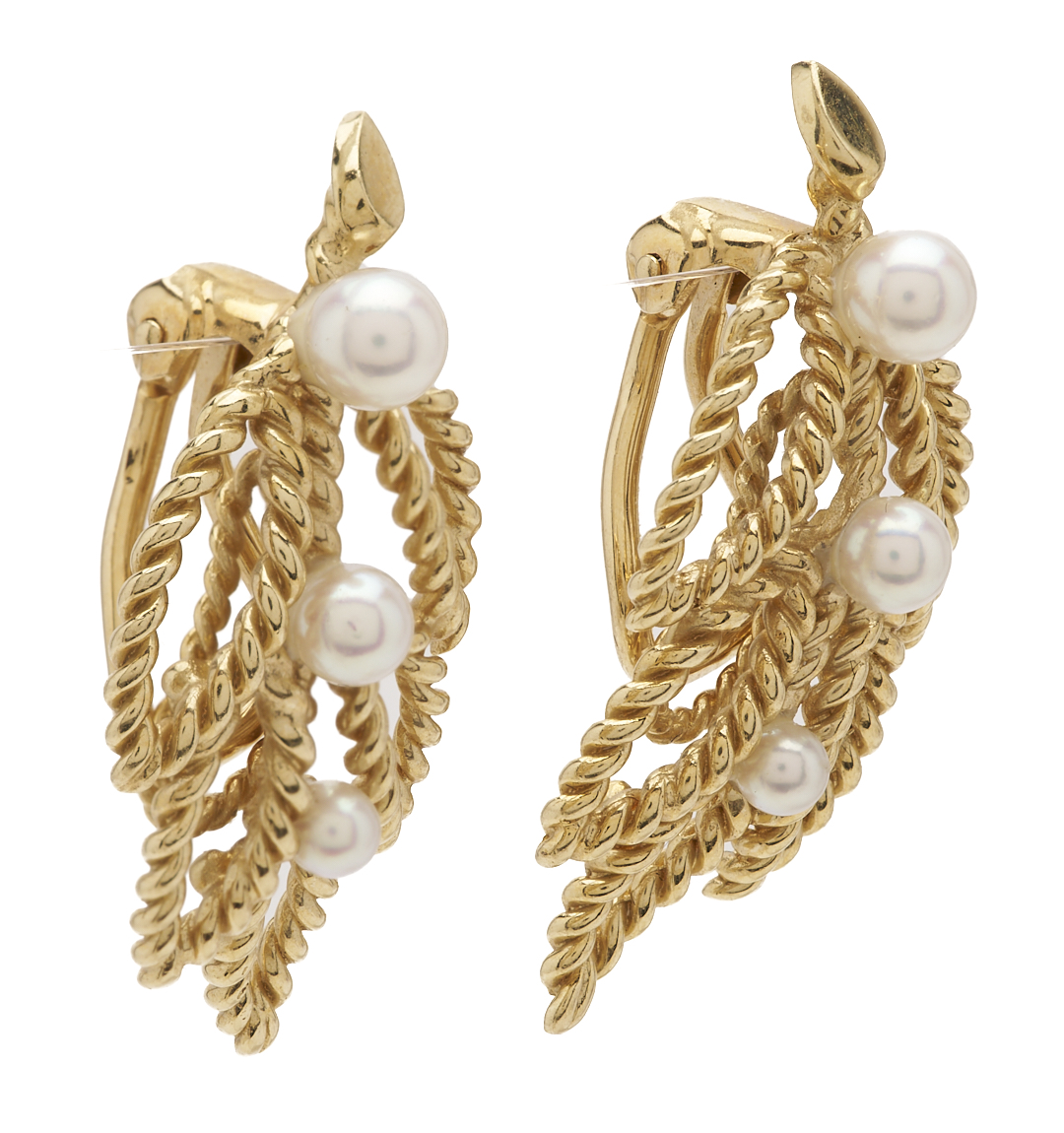 Ladies’ 14K yellow gold clip-on leaf earrings featuring six (6) cultured pearls. The earrings are marked “14K dF” and XRF test 14K. The earrings are 1 1/4 in. x 5/8 in. and have a gross weight of 9.12 grams.
