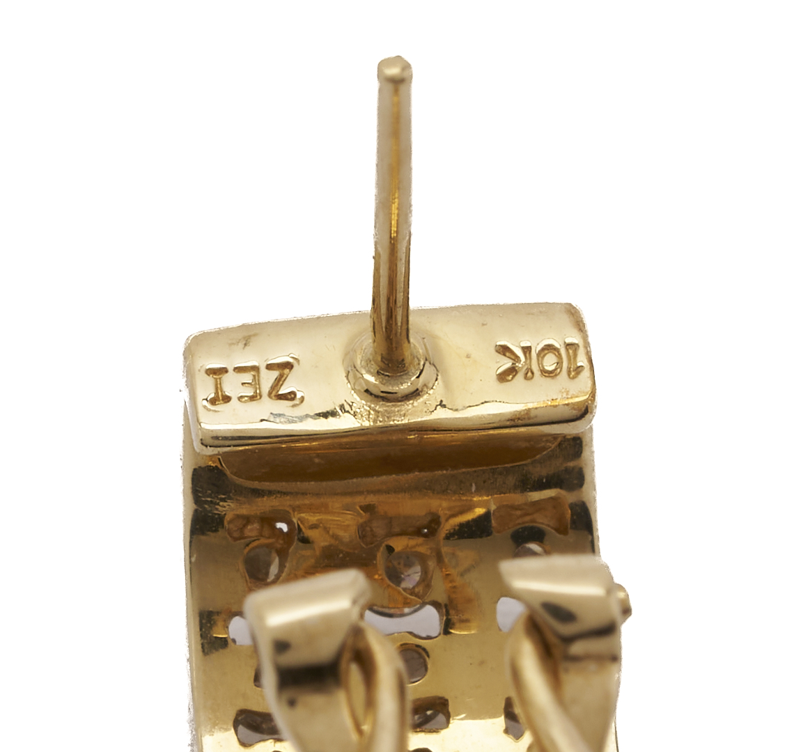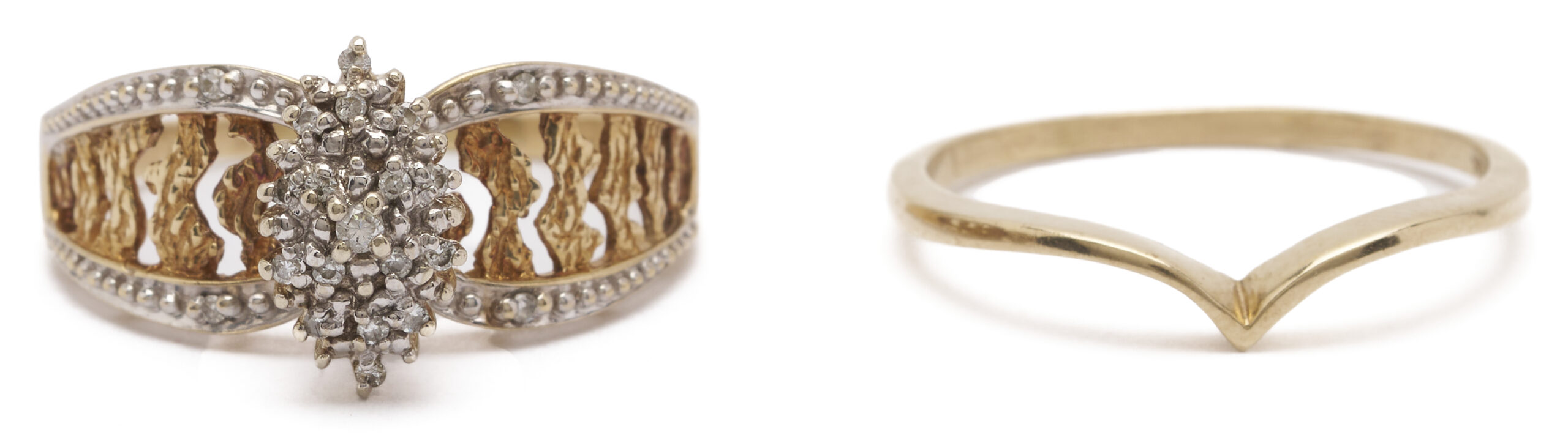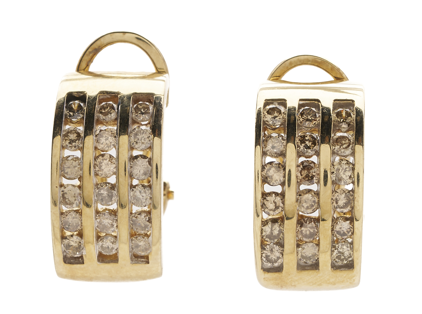 1st item: Ladies’ 10K yellow gold wedding set featuring seventeen (17) round brilliant cut melee diamonds. Both rings in the set are marked “10K” and XRF test 10K gold. Both rings are size 10 1/4 and the gross weight of the rings is 6.00 grams. 2nd item: Ladies’ 10K yellow gold pierced clip back earrings featuring thirty-six (36) round brilliant cut melee champagne diamonds. The earrings are marked “10K ZEI” and XRF test 10K gold. The earrings are 1/2 in. x 1/4 in. and have a gross weight of 5.77 grams. Gross weight of the lot is 11.77 grams.