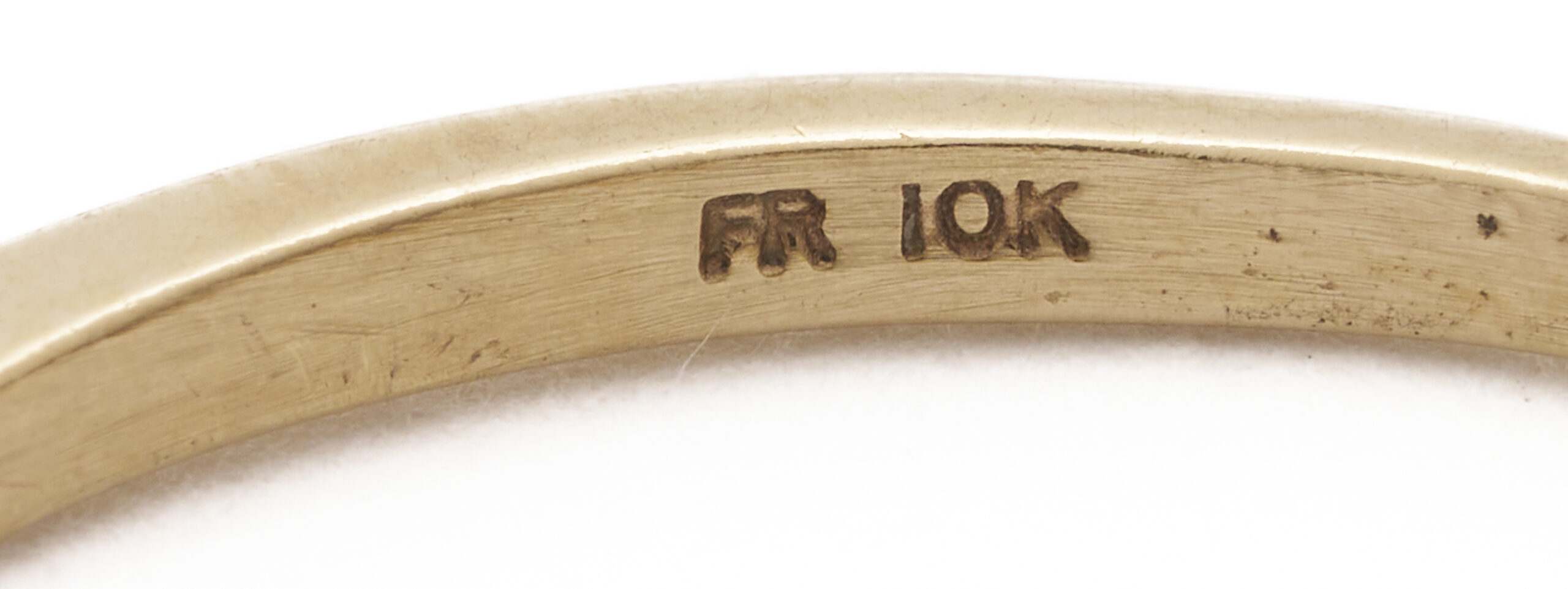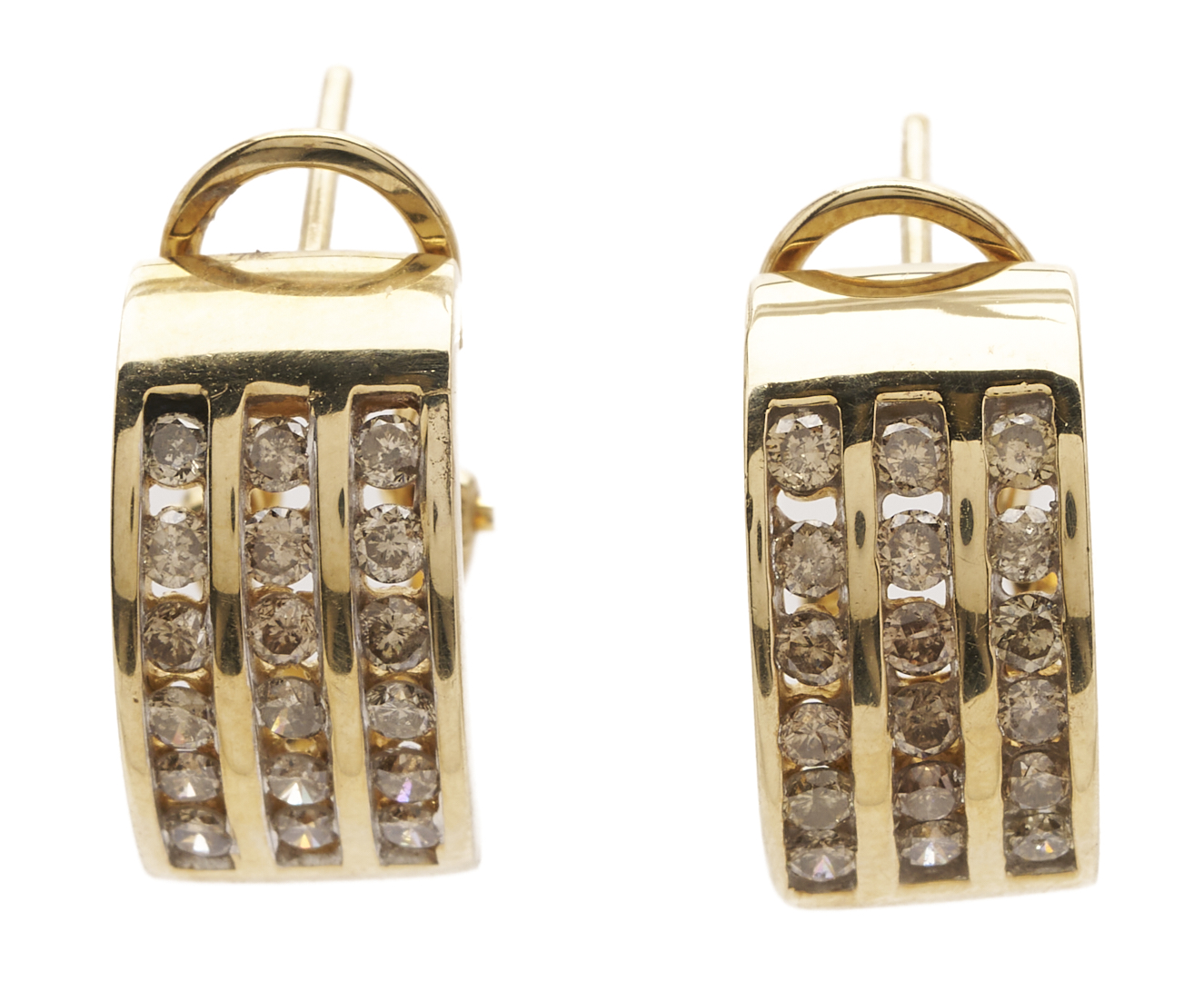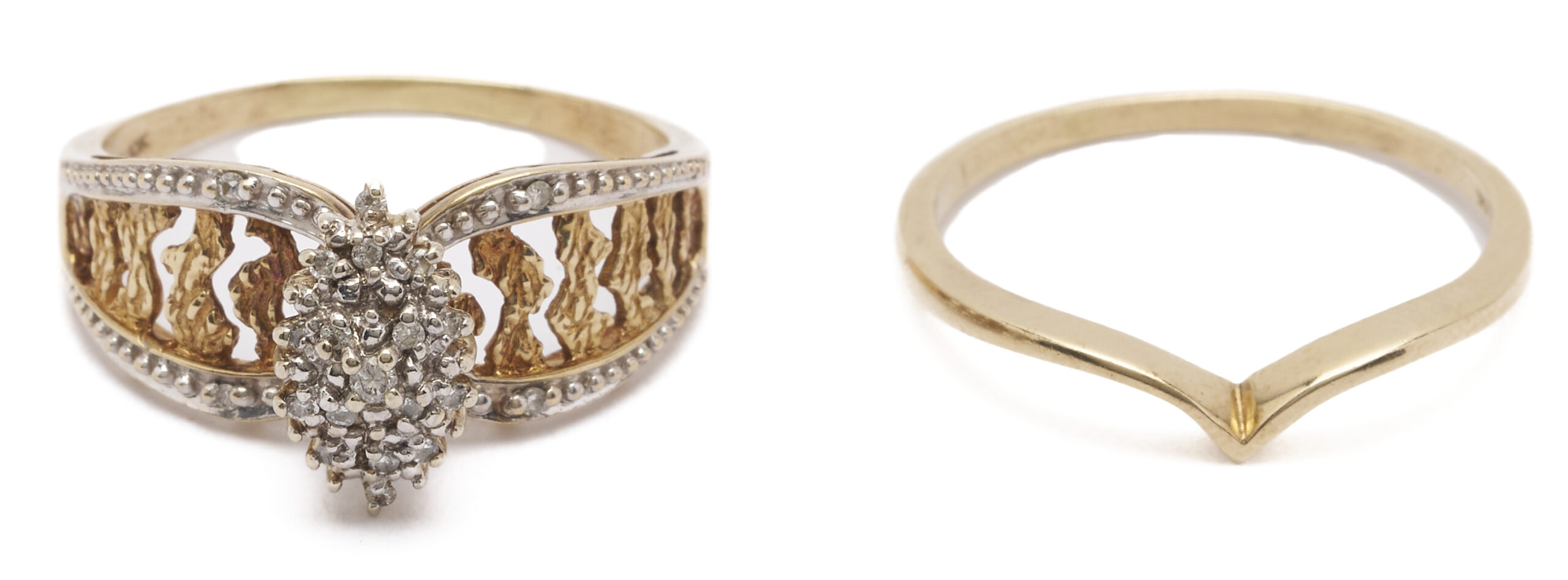 1st item: Ladies’ 10K yellow gold wedding set featuring seventeen (17) round brilliant cut melee diamonds. Both rings in the set are marked “10K” and XRF test 10K gold. Both rings are size 10 1/4 and the gross weight of the rings is 6.00 grams. 2nd item: Ladies’ 10K yellow gold pierced clip back earrings featuring thirty-six (36) round brilliant cut melee champagne diamonds. The earrings are marked “10K ZEI” and XRF test 10K gold. The earrings are 1/2 in. x 1/4 in. and have a gross weight of 5.77 grams. Gross weight of the lot is 11.77 grams.