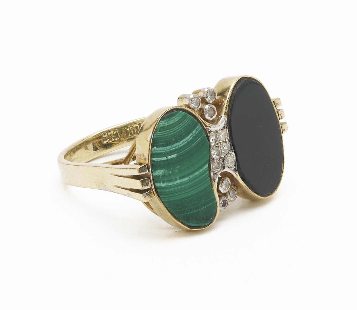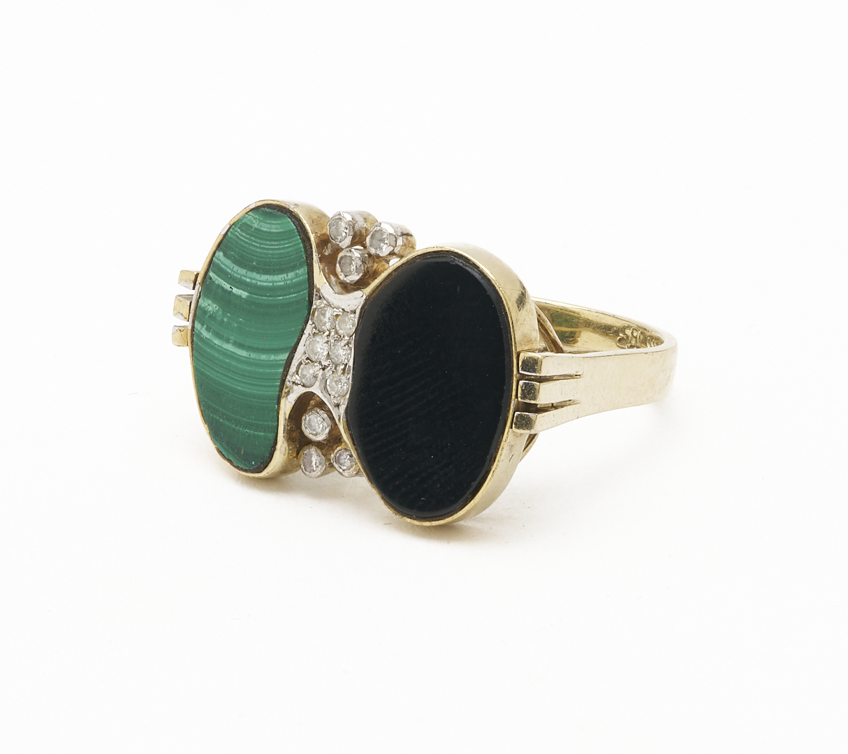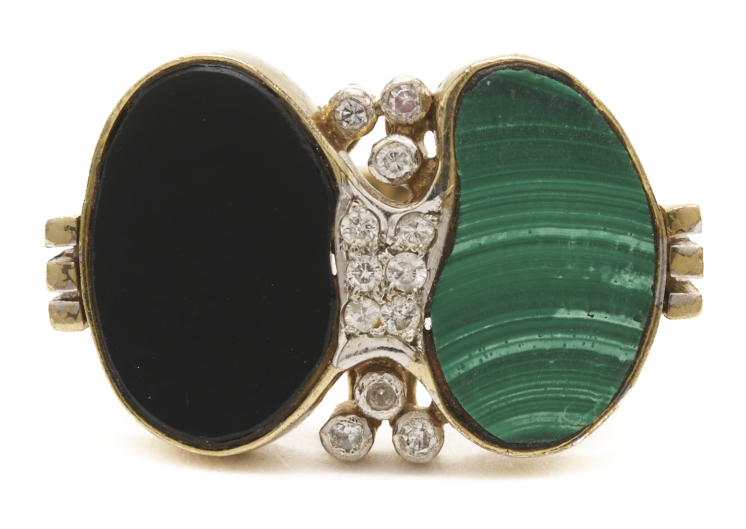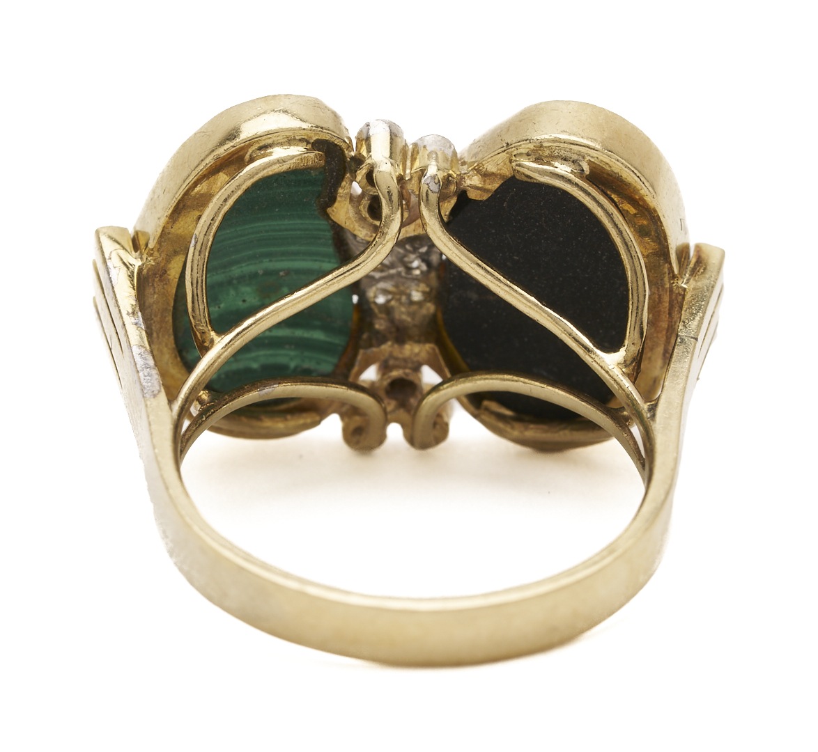 Ladies’ 14K yellow gold ring featuring one (1) black onyx, one (1) malachite, and twelve round brilliant cut melee diamonds. The ring is marked “14K 585” and XRF tests 14K gold. The ring is size 7 and has a gross weight of 5.84 grams.
