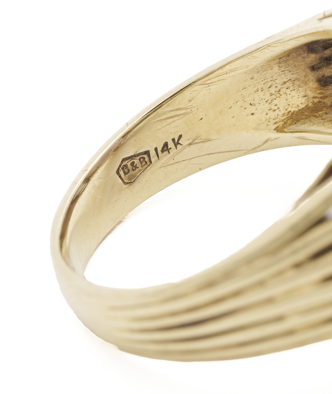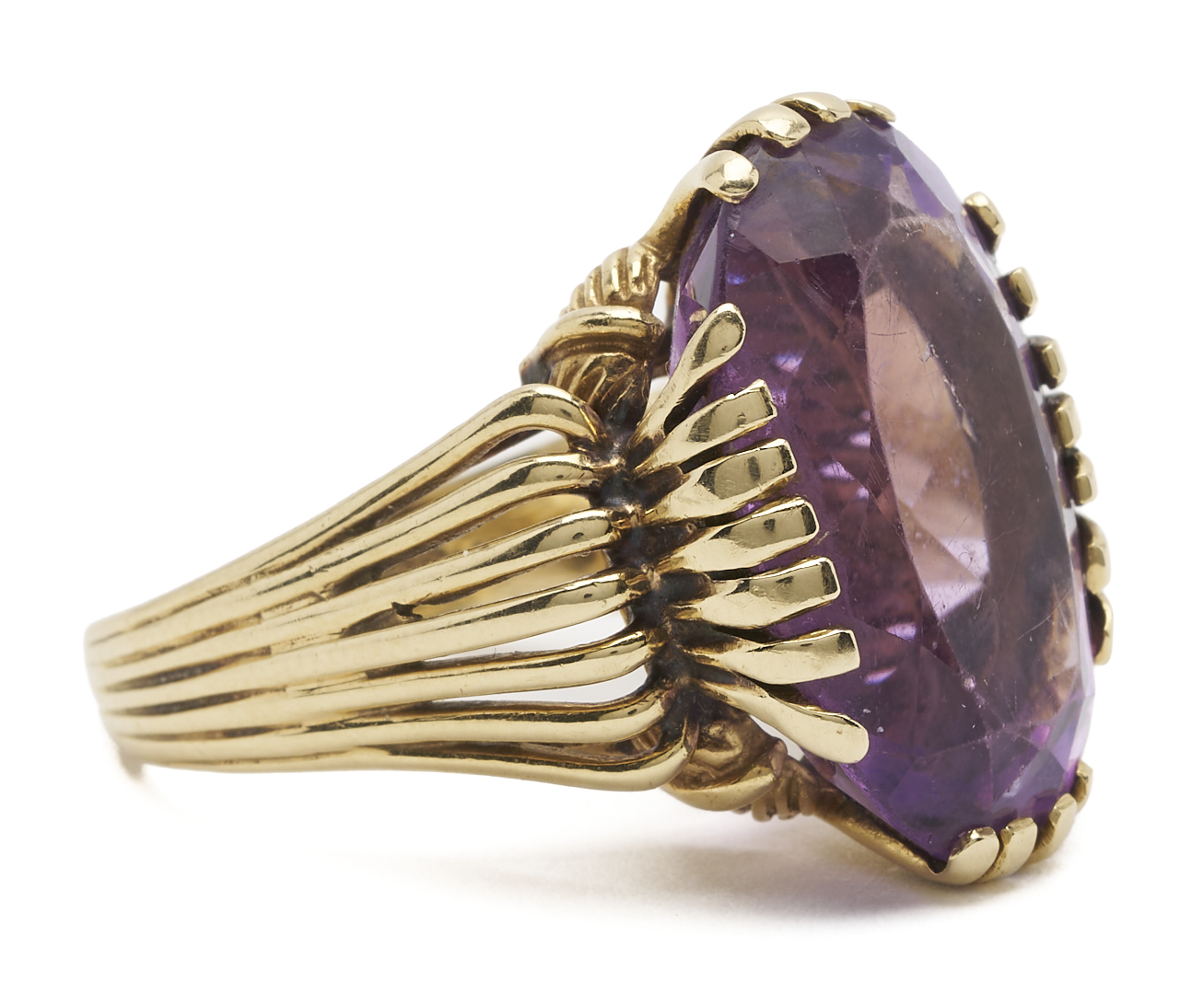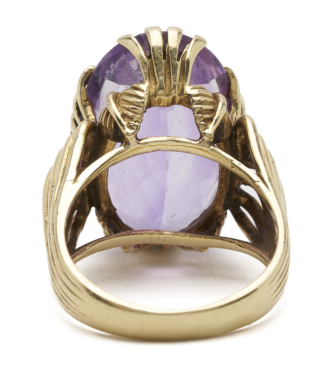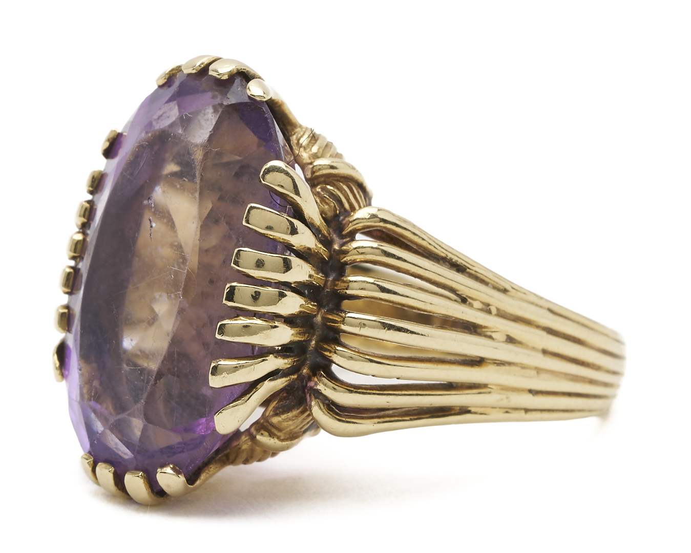 Ladies’ 14K yellow gold ring featuring one (1) oval amethyst. The ring is marked “B&B 14K” and XRF tests 14K gold. The ring is size 7 3/4 and has a gross weight of 12.25 grams.