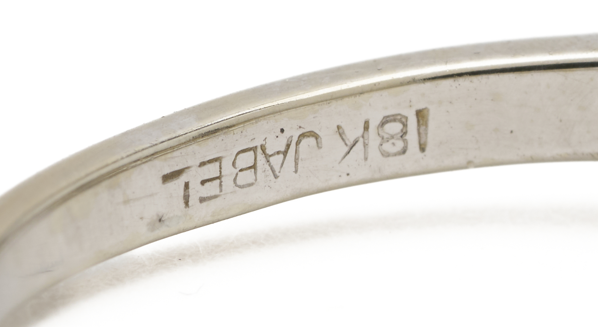 Ladies’ 18K white gold Jabel ring featuring three (3) mine cut diamonds, approximately 1.06 carats together, Clarity-I1, Color-H. The ring is marked “18K Jabel” and XRF tests 18K gold. The ring is size 6 1/4 and has a gross weight of 2.32 grams.