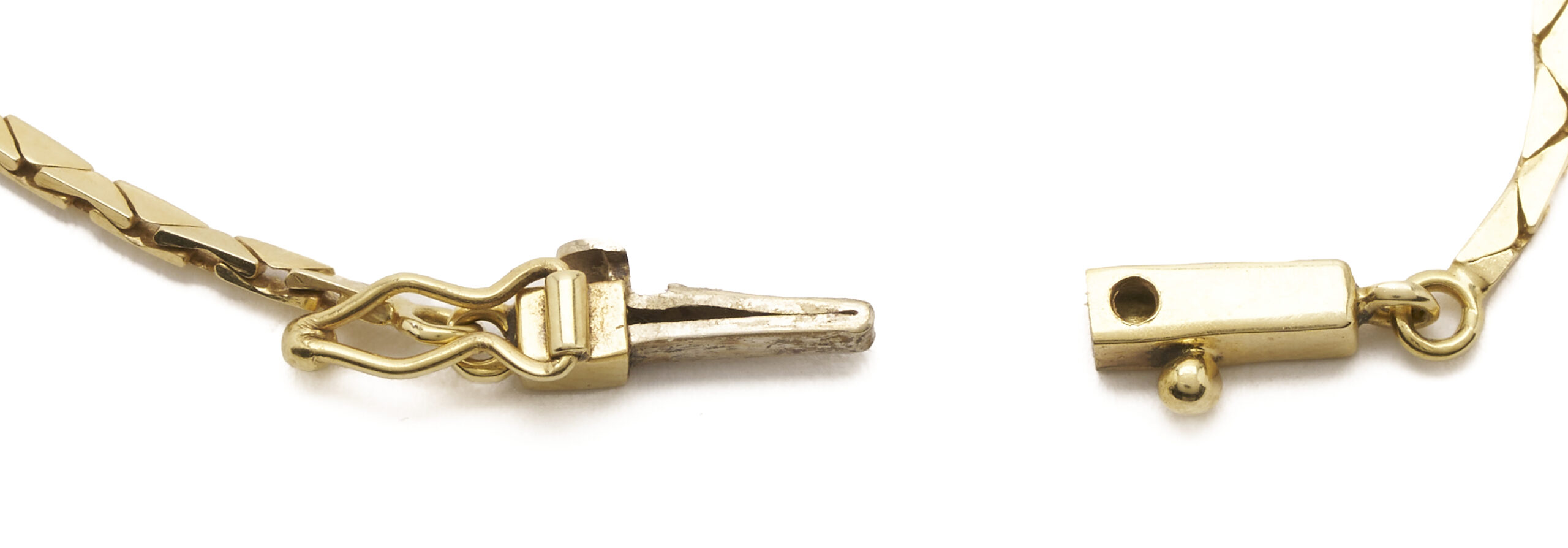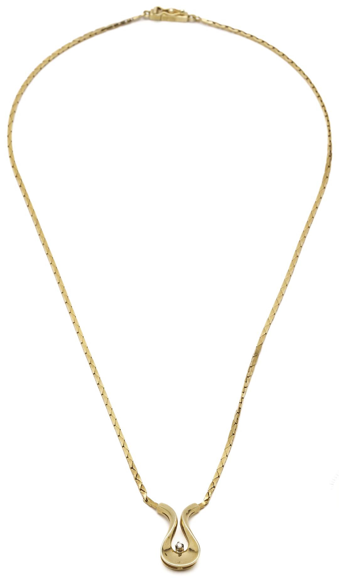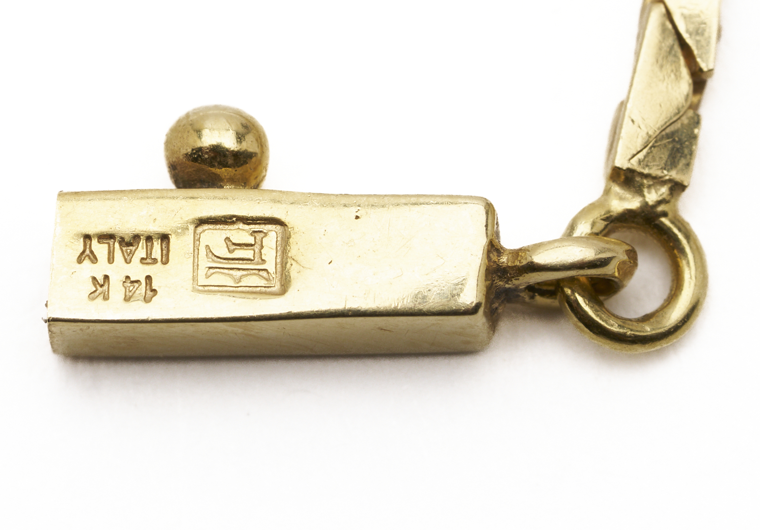 Ladies’ 14K yellow gold Italian designer box chain with pendant featuring one (1) round brilliant cut melee diamond. The pendant is marked “14K Italy” and XRF tests 14K gold. The necklace is 16 in. L. and has a gross weight of 9.85 grams.