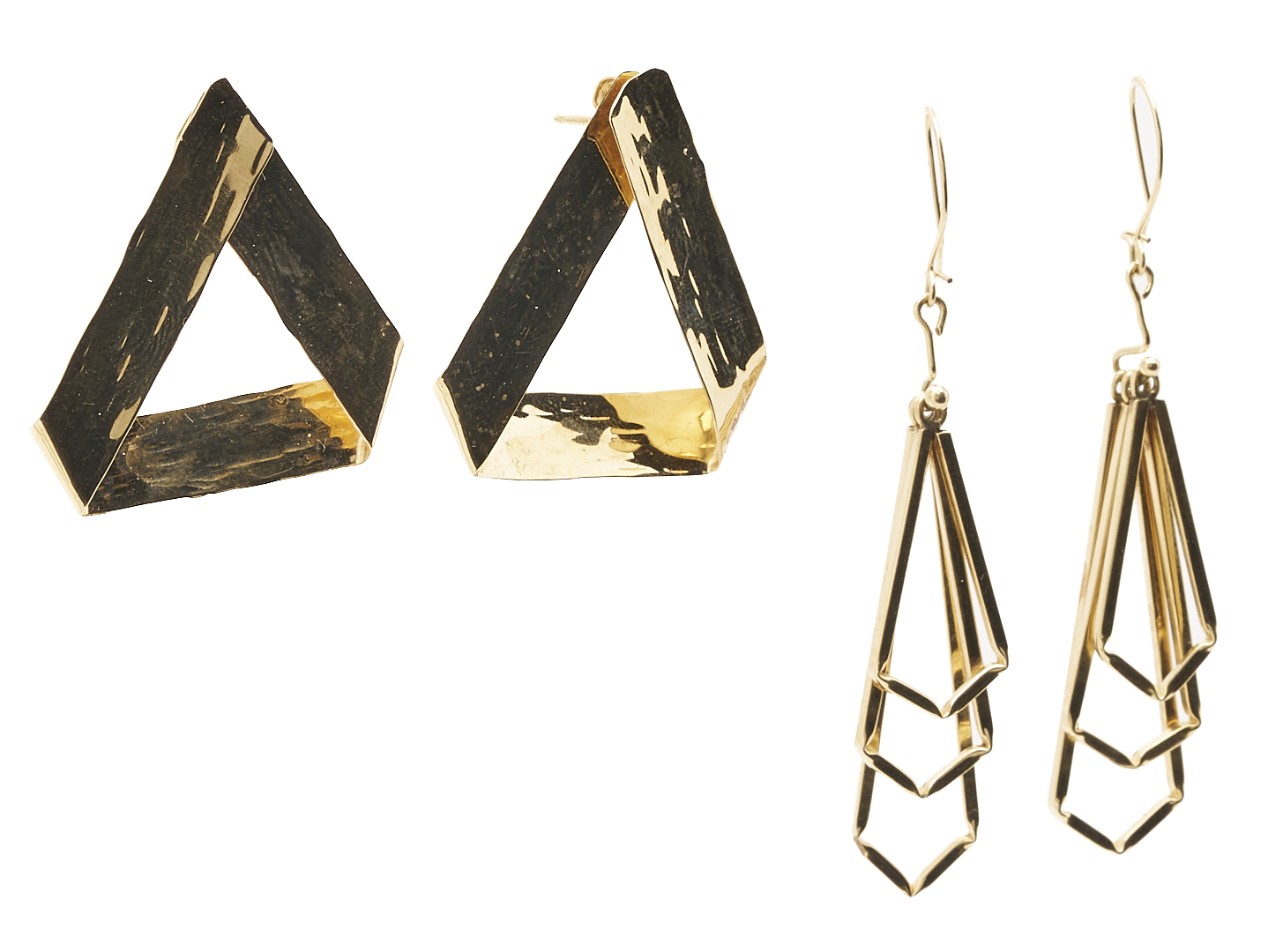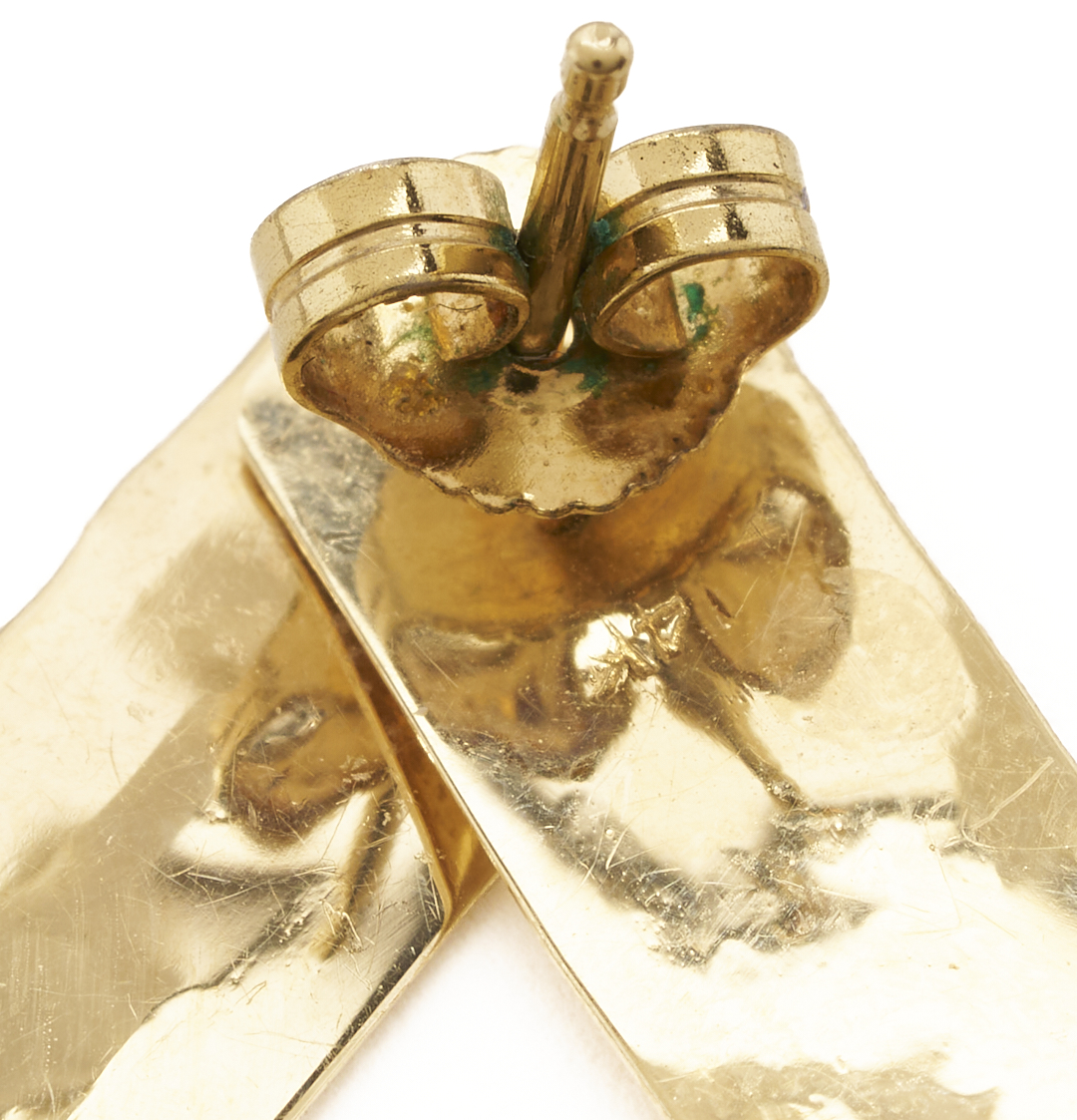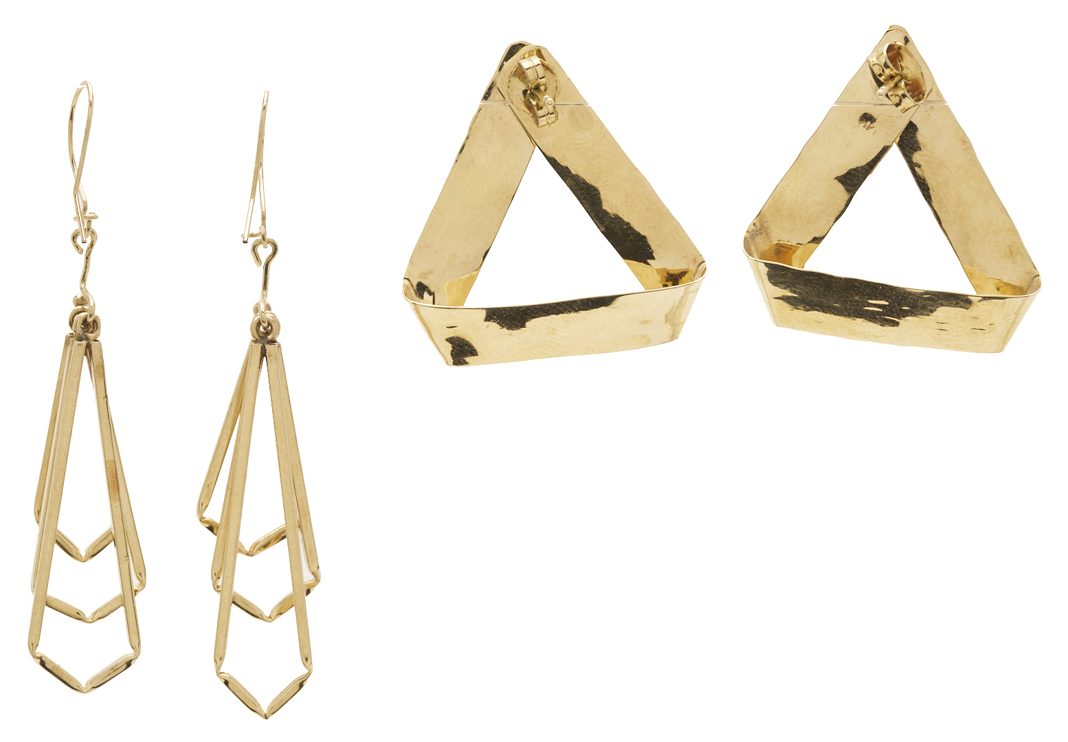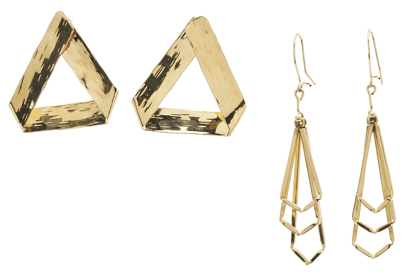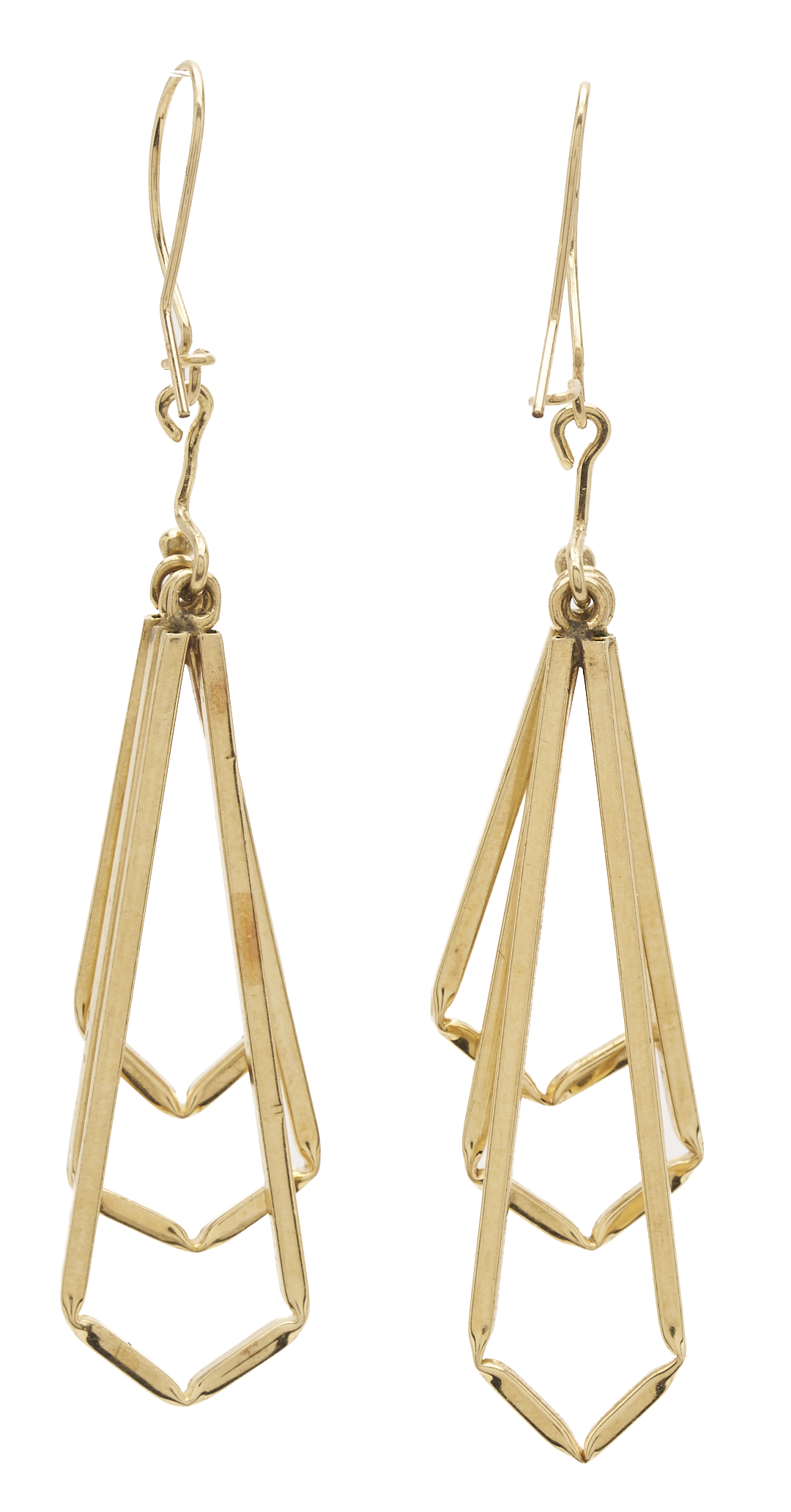 1st item: Ladies’ 14K yellow gold triangle pierced back dangle earrings. The earrings are marked “14K” and XRF test 14K gold. The earrings are 1 1/4 in. x 1 1/4 in. and have a gross weight of 4.03 grams. 2nd item: Ladies’ 14K yellow gold pierced back elongated triangular dangle earrings. The earrings XRF test 14K gold. The earrings are 2 1/4 in. x 3/4 in. and have a gross weight of 3.66 grams. Gross weight of the lot is 7.68 grams.