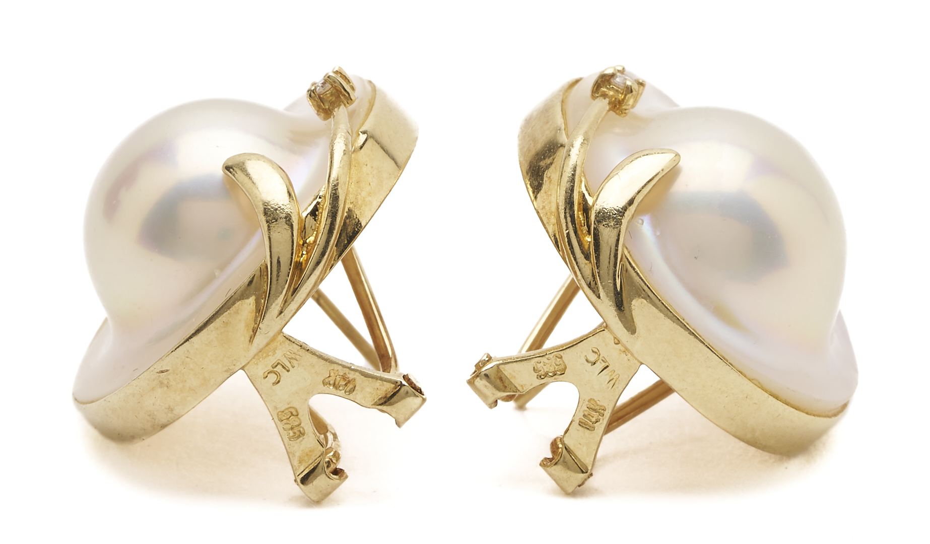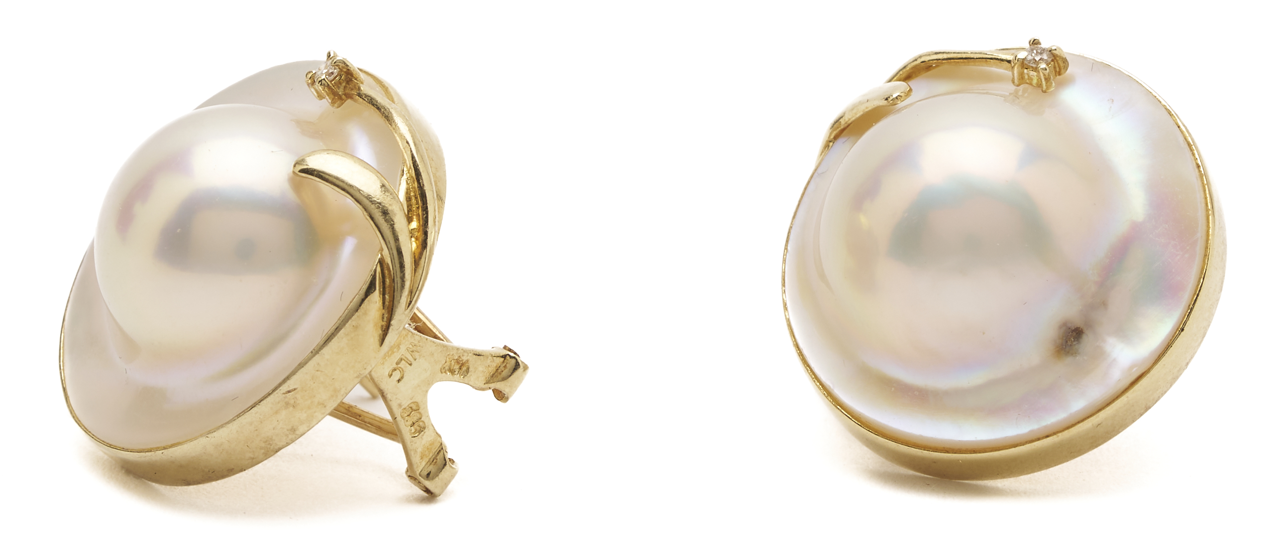 Ladies’ 14K yellow gold pierced clip back earrings featuring two (2) mabe pearls approximately 19mm each in size, accented by two (2) melee diamonds. The earrings are marked “14K 585 WLC” and XRF test 14K gold. The earrings are 3/4 in. x 3/4 in. and have a gross weight of 9.81 grams.