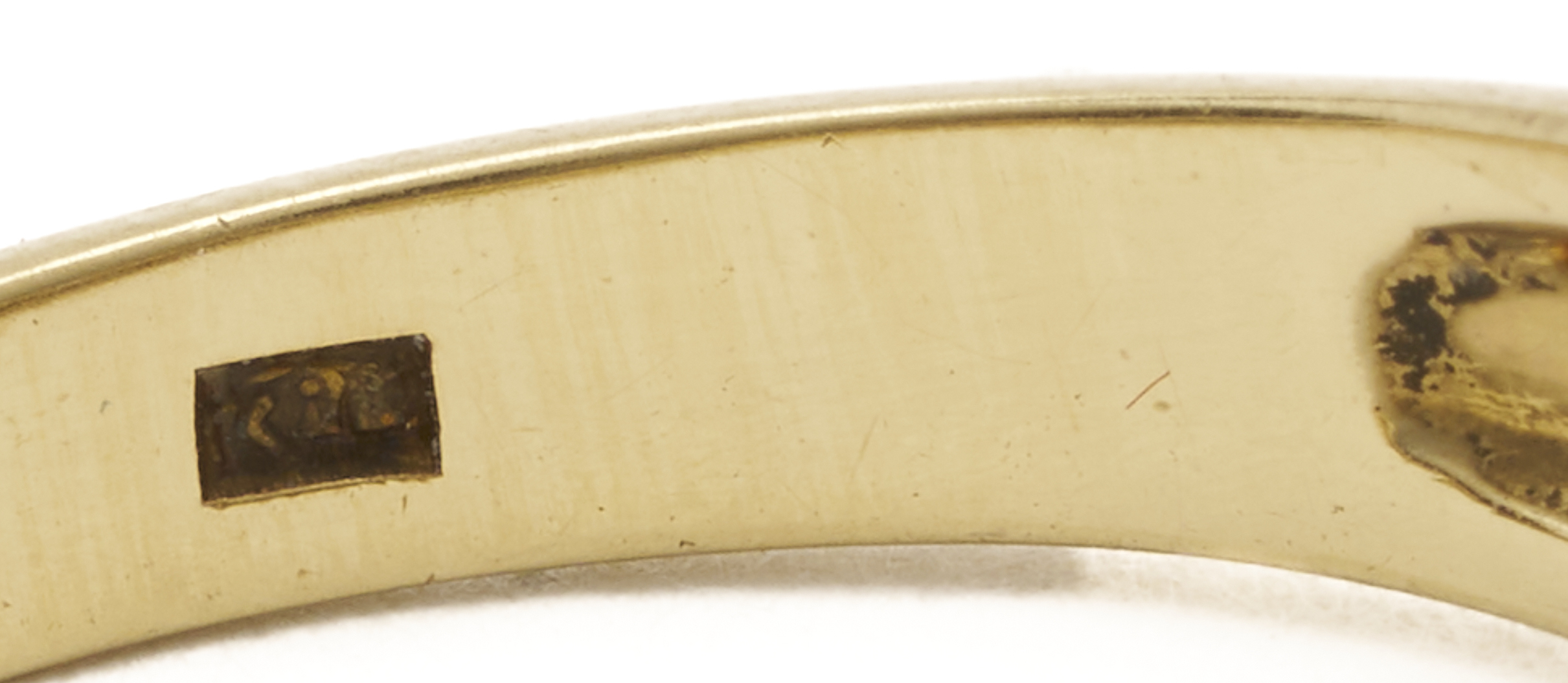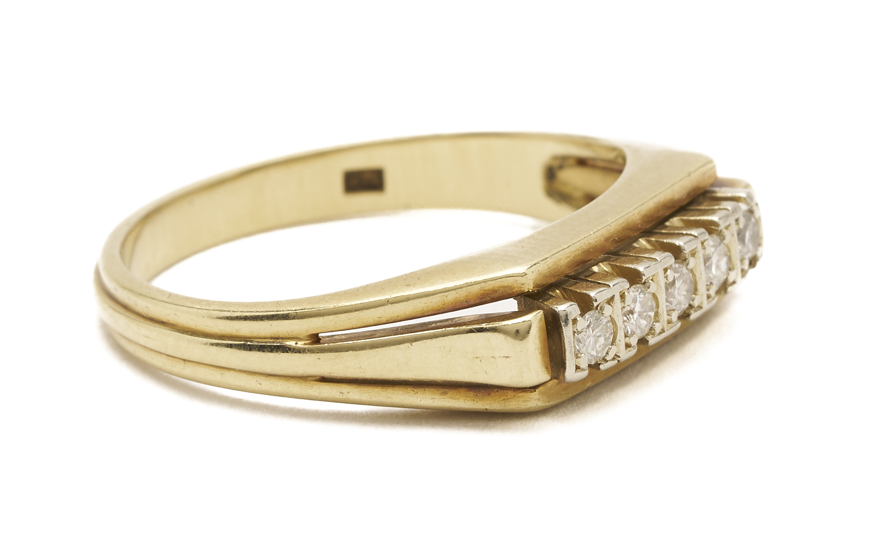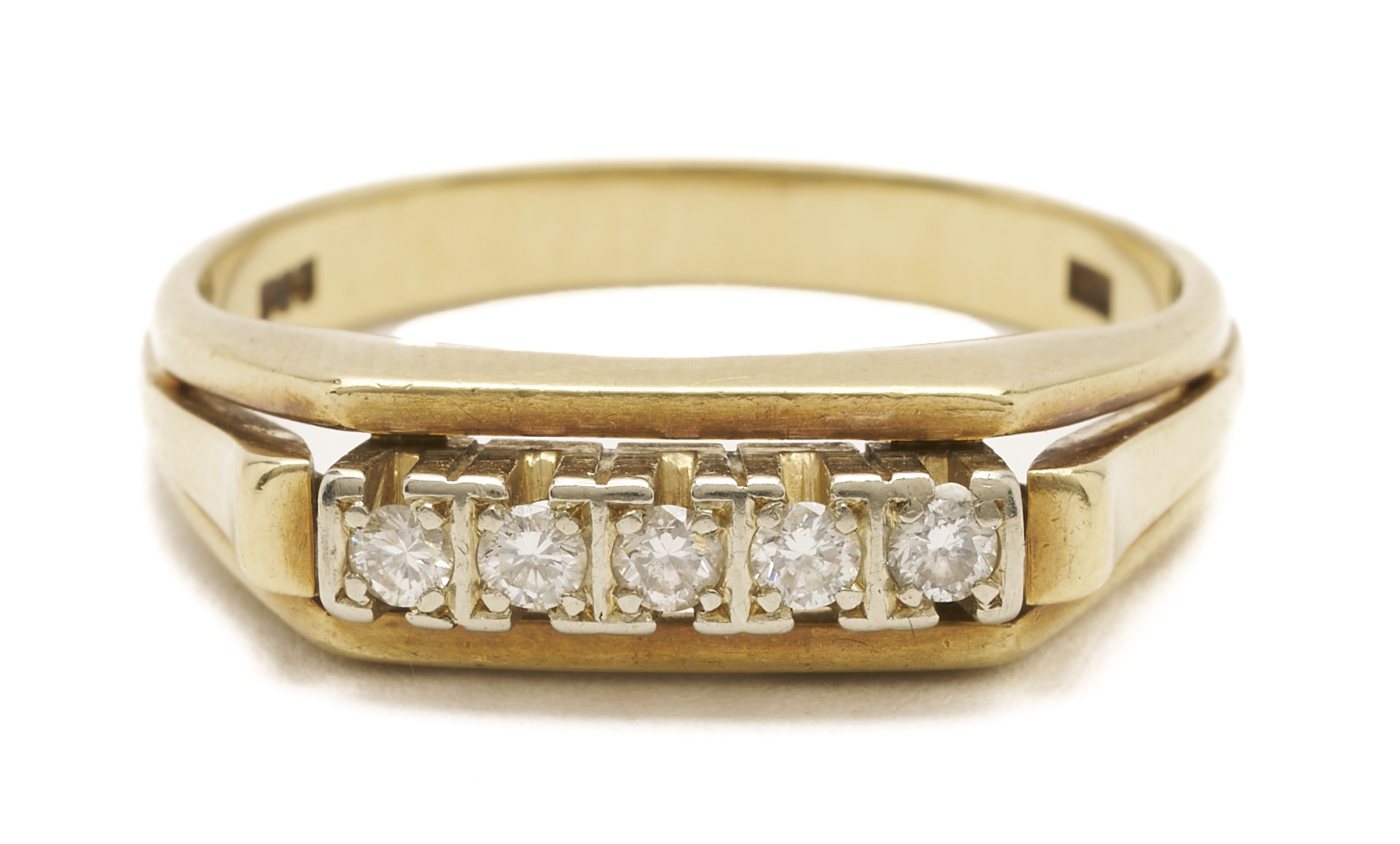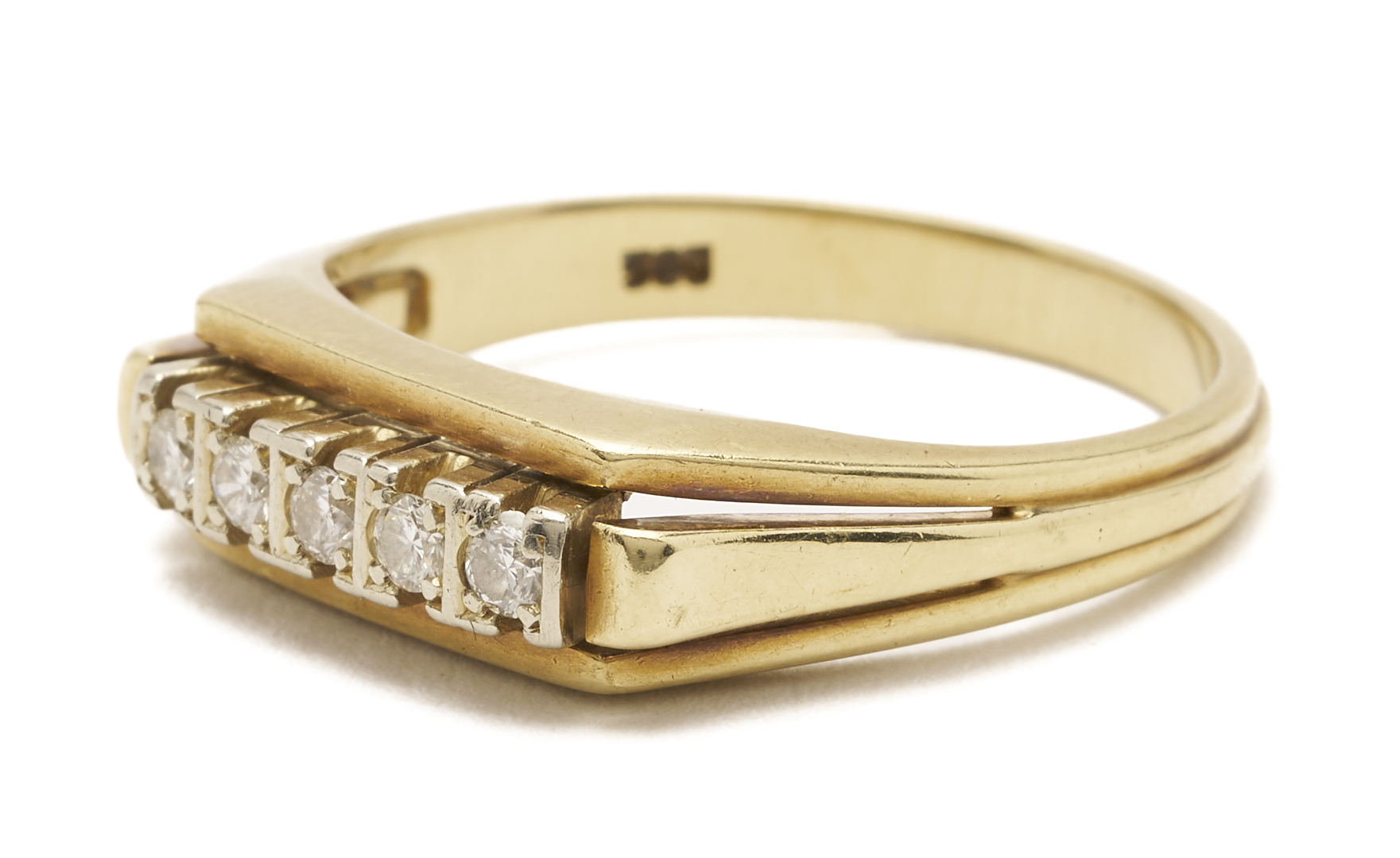 14K yellow gold ring featuring five (5) round brilliant cuts diamonds approximately 0.30 carats together, Clarity-SI1, Color-J. The ring is marked “585” and XRF tests 14K gold. The ring is size 10 1/4 and has a gross weight of 6.04 grams.