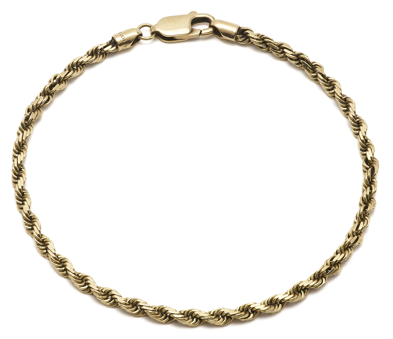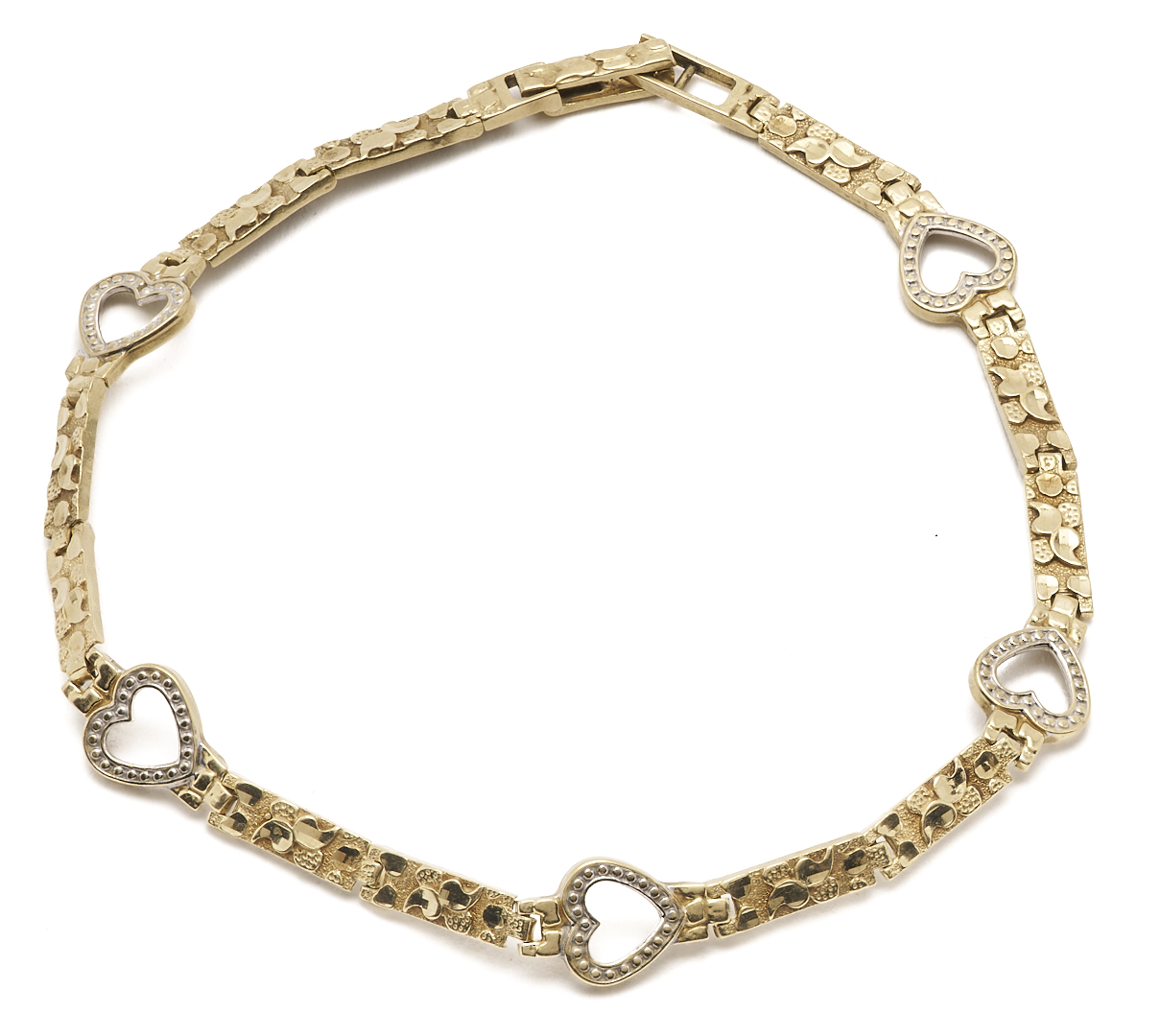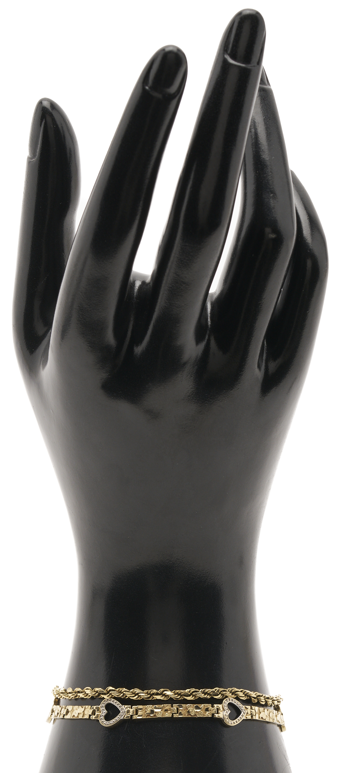 1st item: Ladies’ 10K yellow gold rope chain bracelet. The bracelet is marked “10K” and XRF tests 10K gold. The bracelet is 7 in. L. and weighs 4.86 grams. 2nd item: Ladies’ 10K yellow gold nugget and heart bracelet. The bracelet XRF tests 10K gold. The bracelet is 7 1/2 in. L. and weighs 4.69 grams. Gross weight of the lot is 9.55 grams.