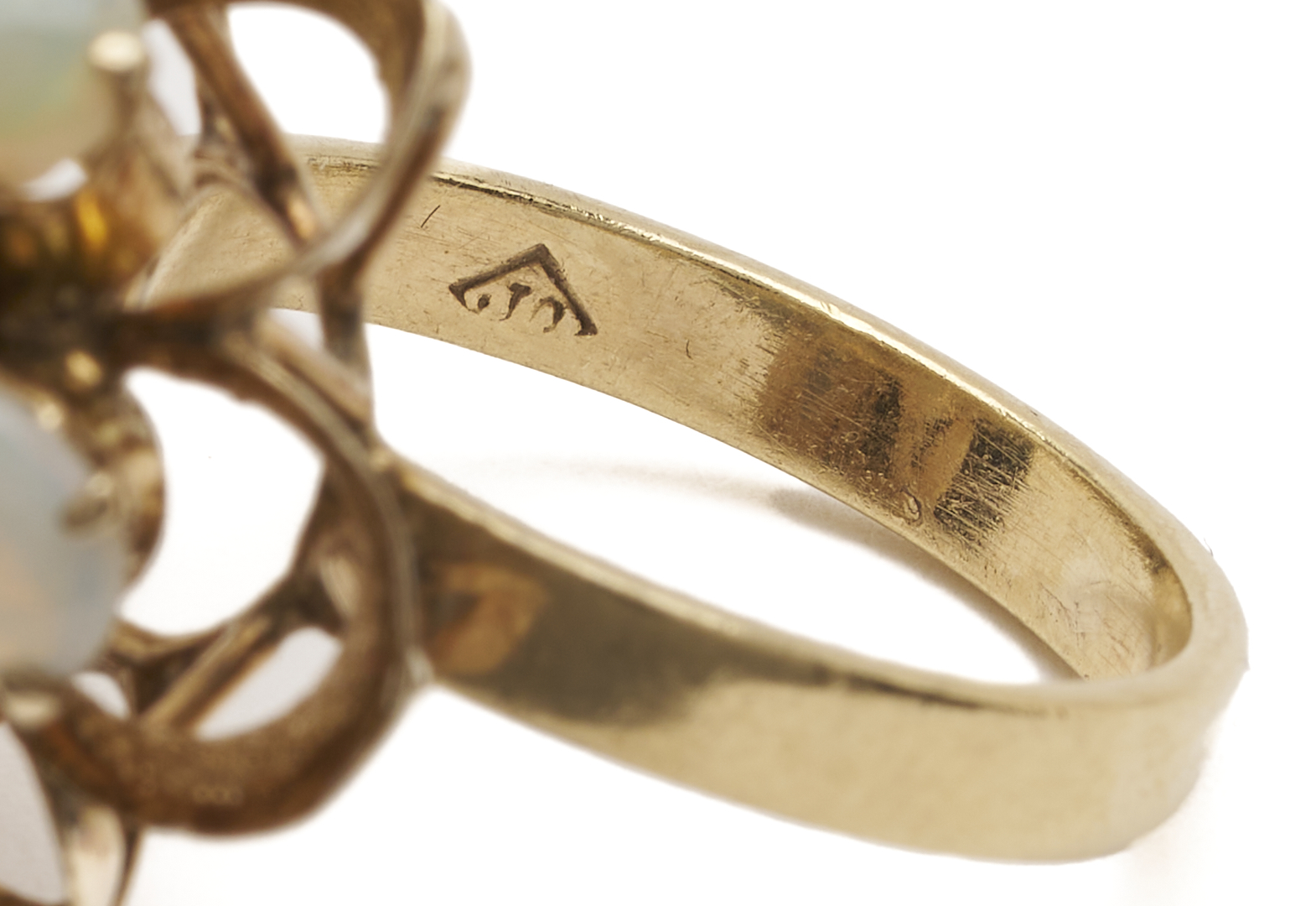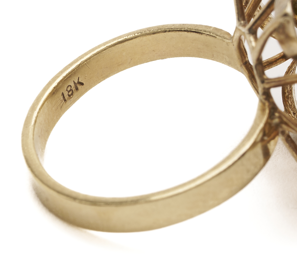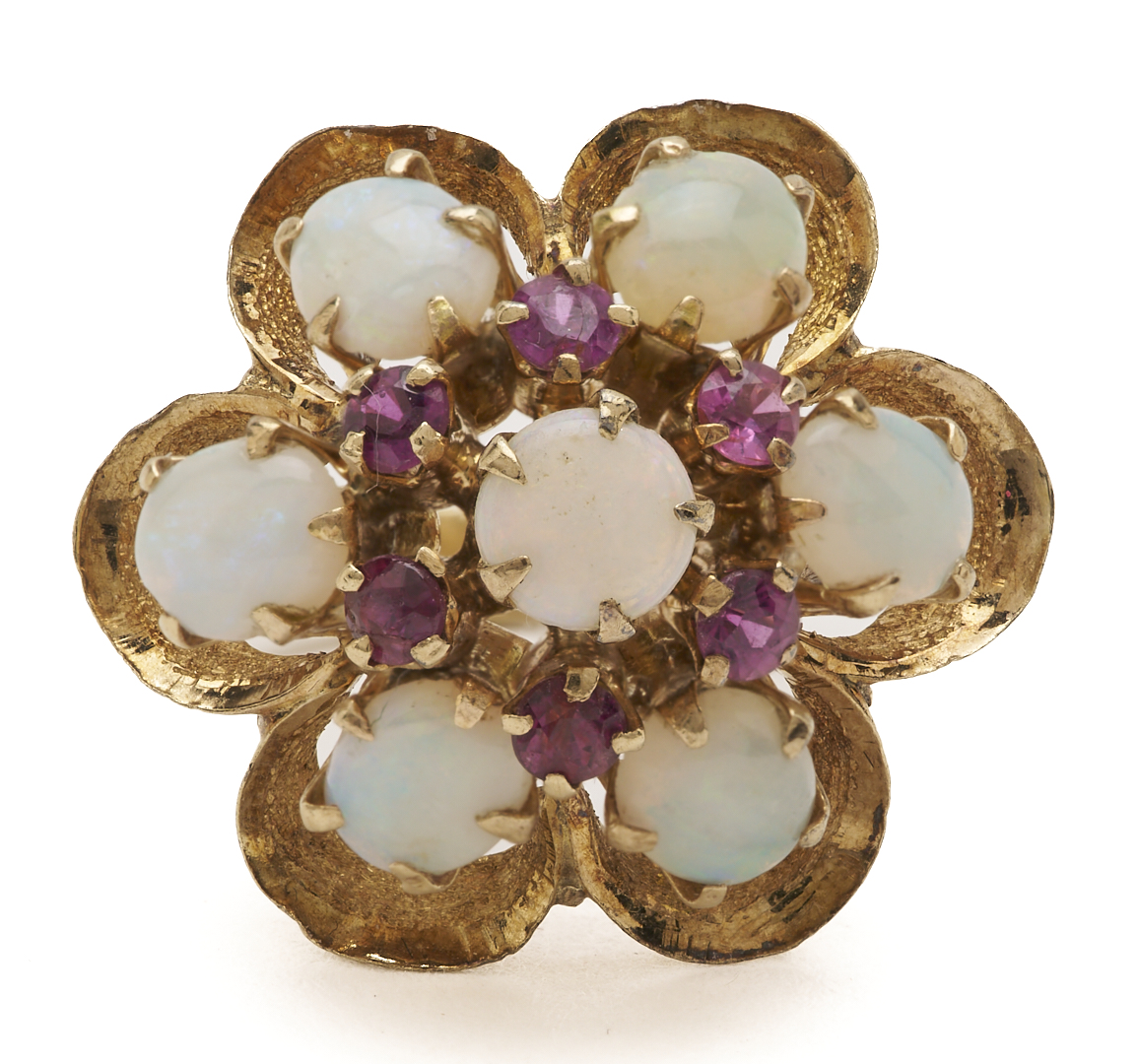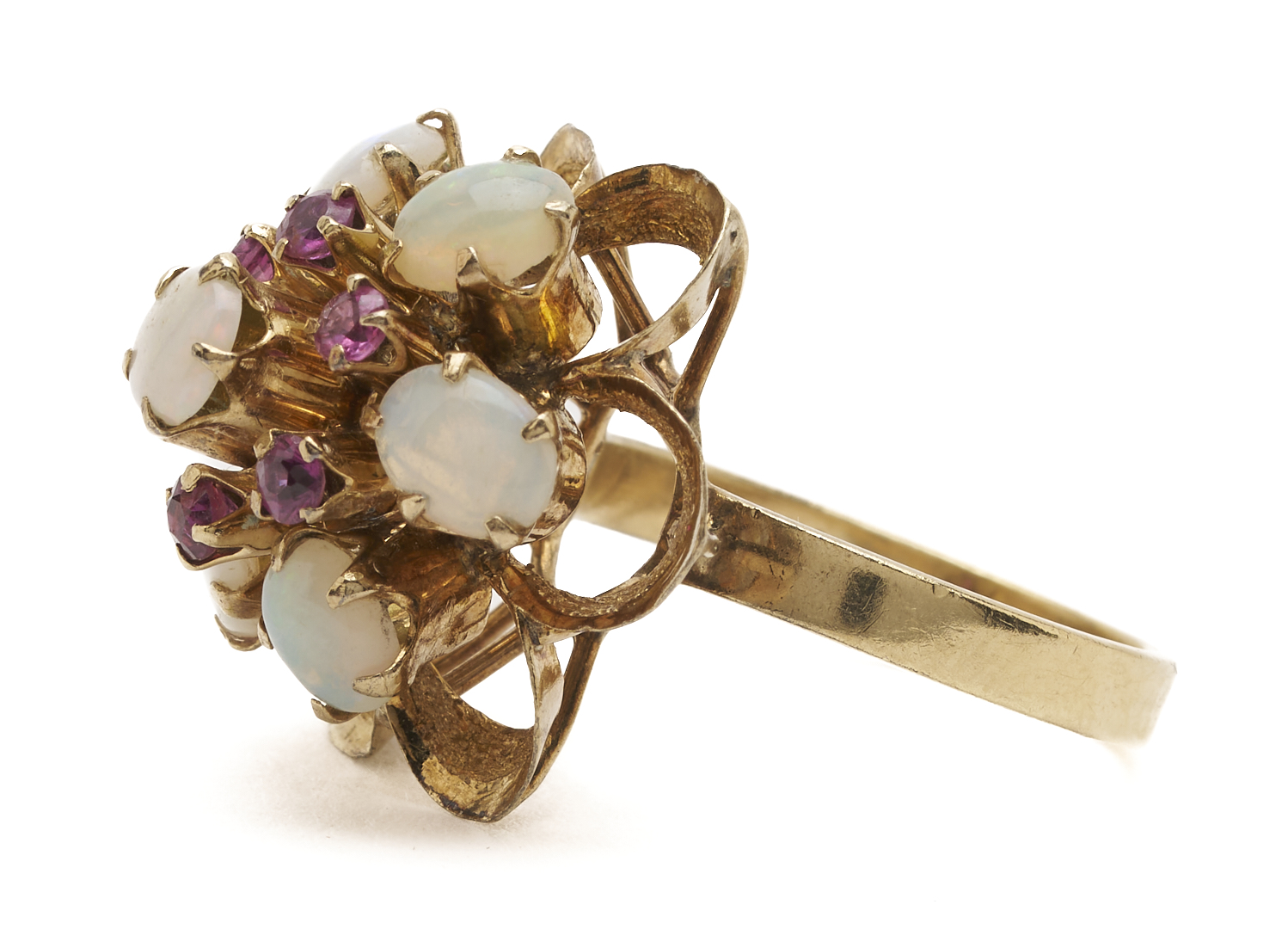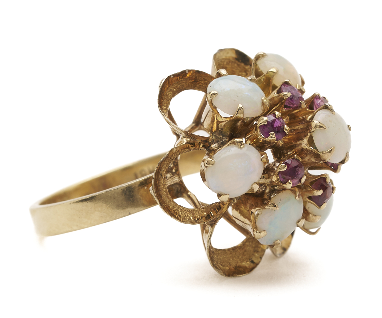 Ladies’ 18K yellow gold dinner ring featuring six (6) natural cabochon white opals and six (6) natural round cut rubies. The ring is marked “18K” and XRF tests 18K gold. The ring is size 6 3/4 and has a gross weight of 5.65 grams.