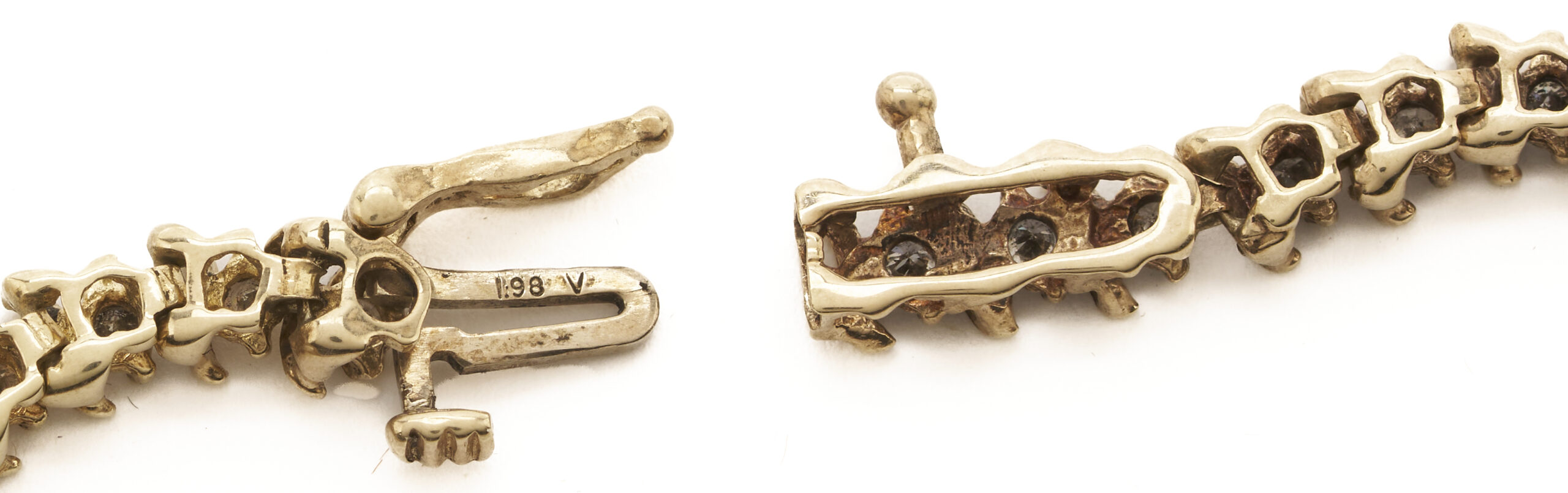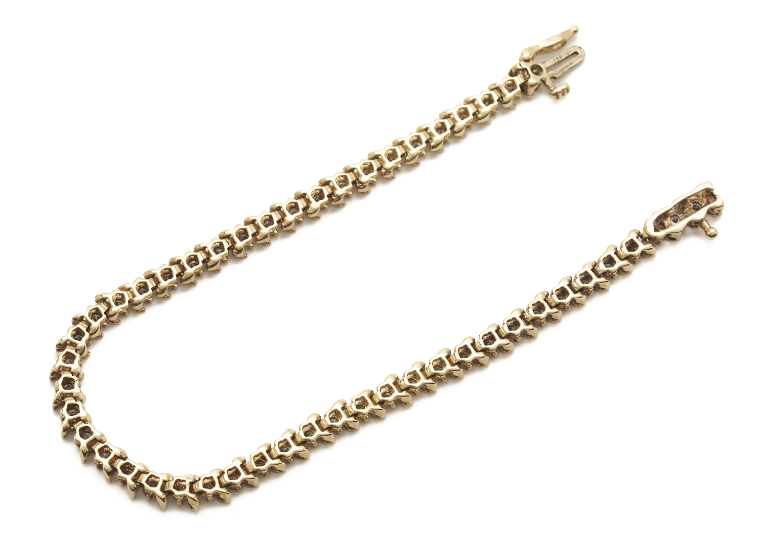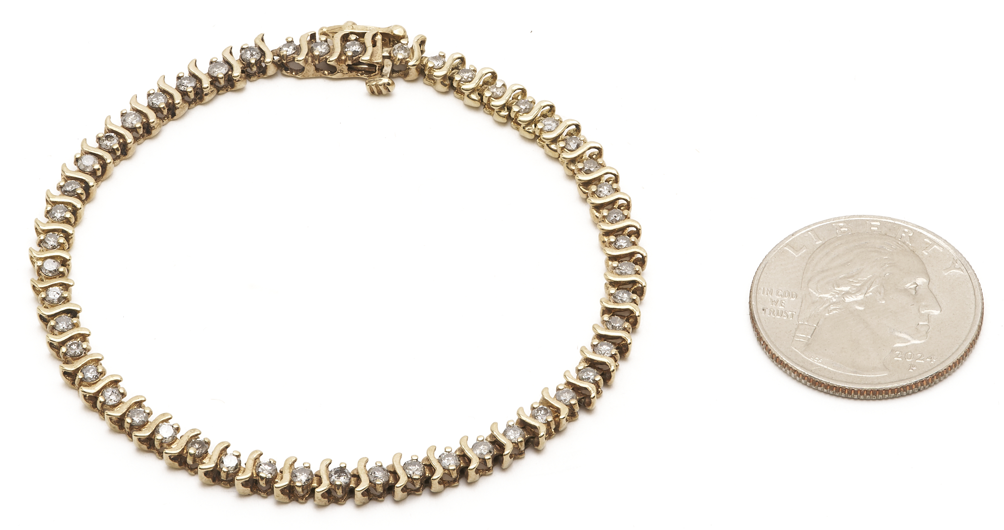 Ladies’ 10K yellow gold tennis bracelet featuring forty-nine (49) round brilliant diamonds, approximately 1.98 carats together, Clarity-I1, Color-L. The bracelet is marked “10K 1.98 V” and XRF tests 10K gold. The bracelet is 7 1/2 in. L. and has a gross weight of 9.06 grams.