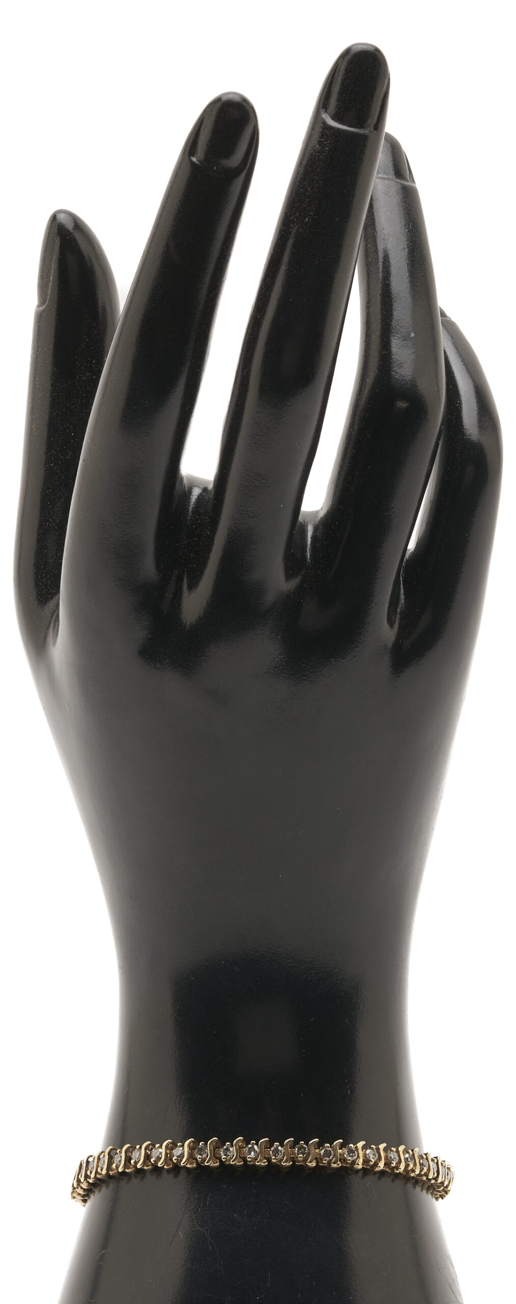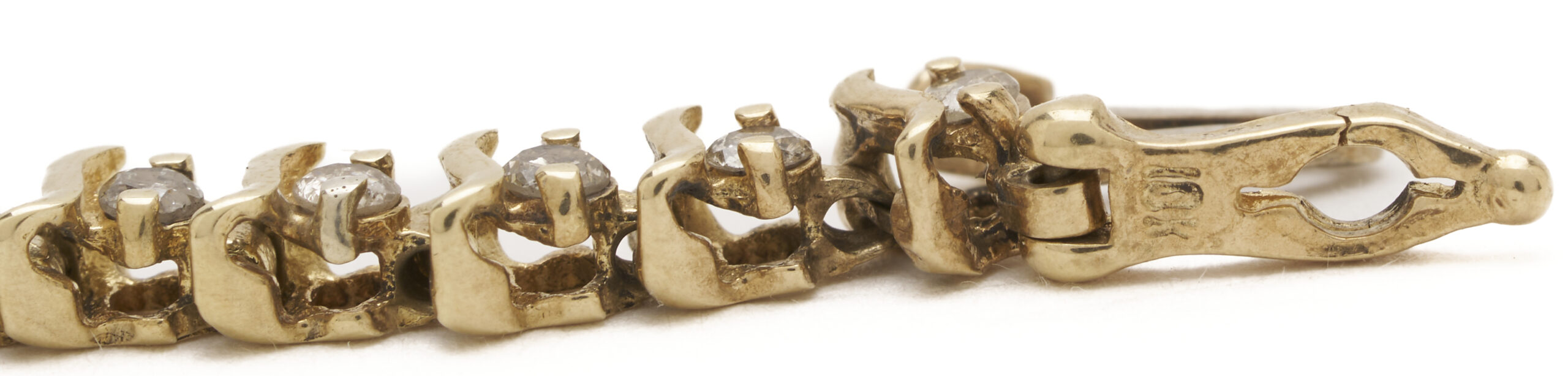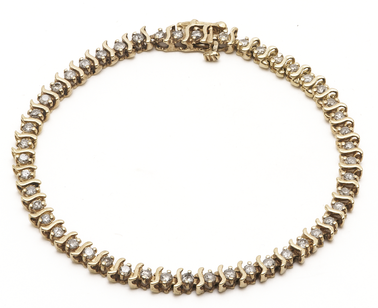Ladies’ 10K yellow gold tennis bracelet featuring forty-nine (49) round brilliant diamonds, approximately 1.98 carats together, Clarity-I1, Color-L. The bracelet is marked “10K 1.98 V” and XRF tests 10K gold. The bracelet is 7 1/2 in. L. and has a gross weight of 9.06 grams.