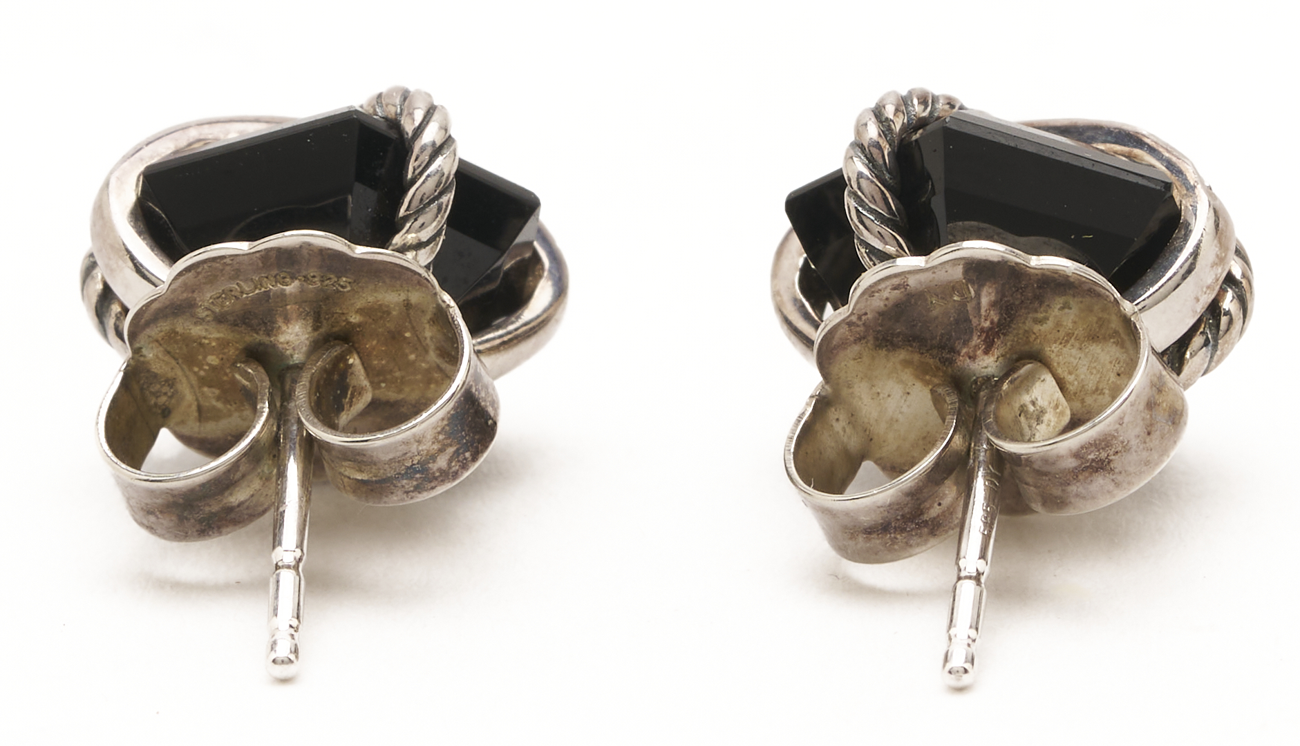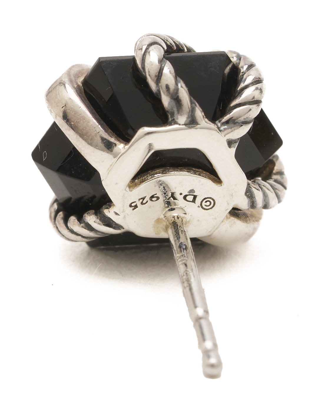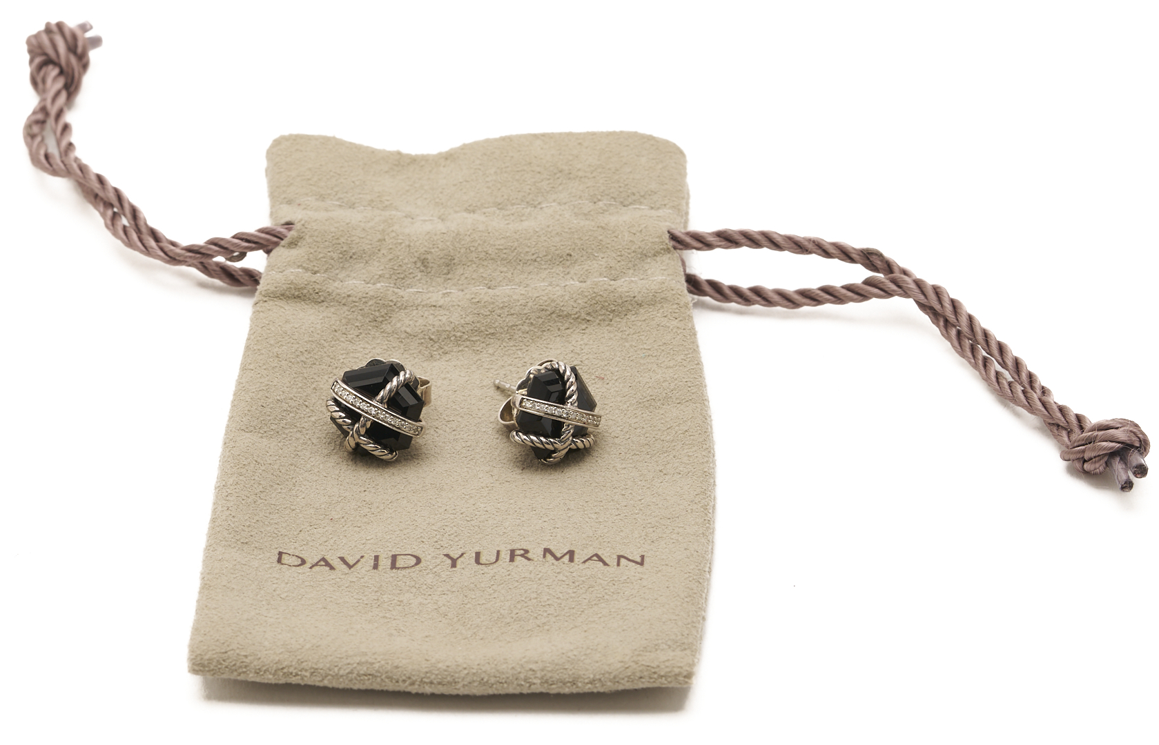David Yurman Cable Wrap stud earrings featuring black onyx stones with sterling cable and diamond overlays. Signed DY.925 on the stud backs and earring backs. Approximately 10mm dia.