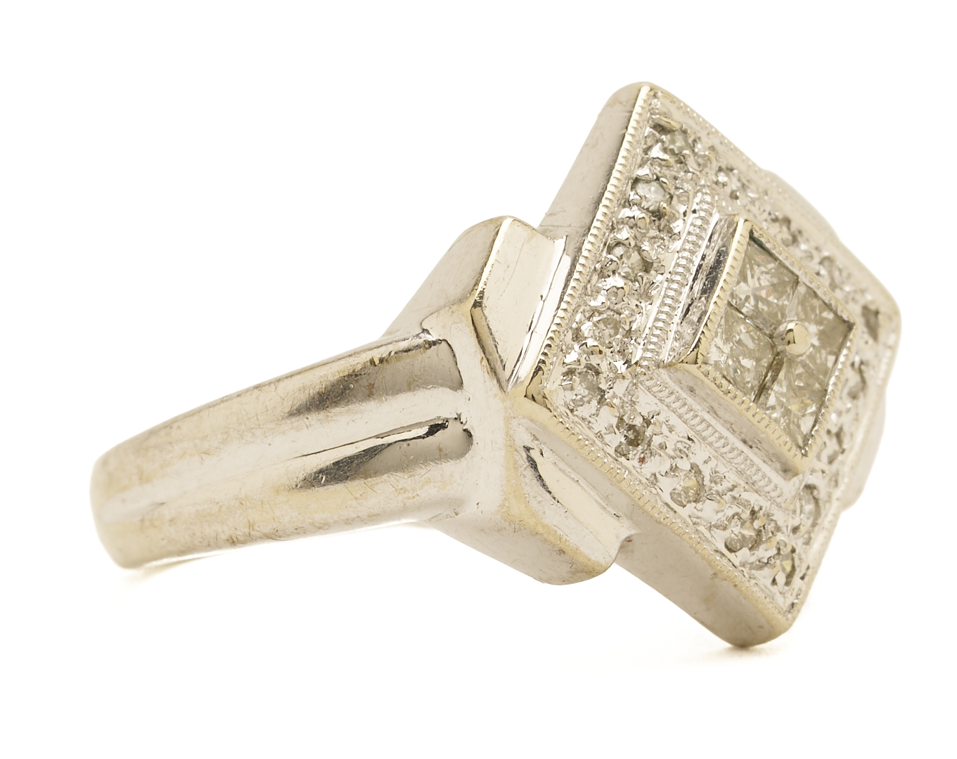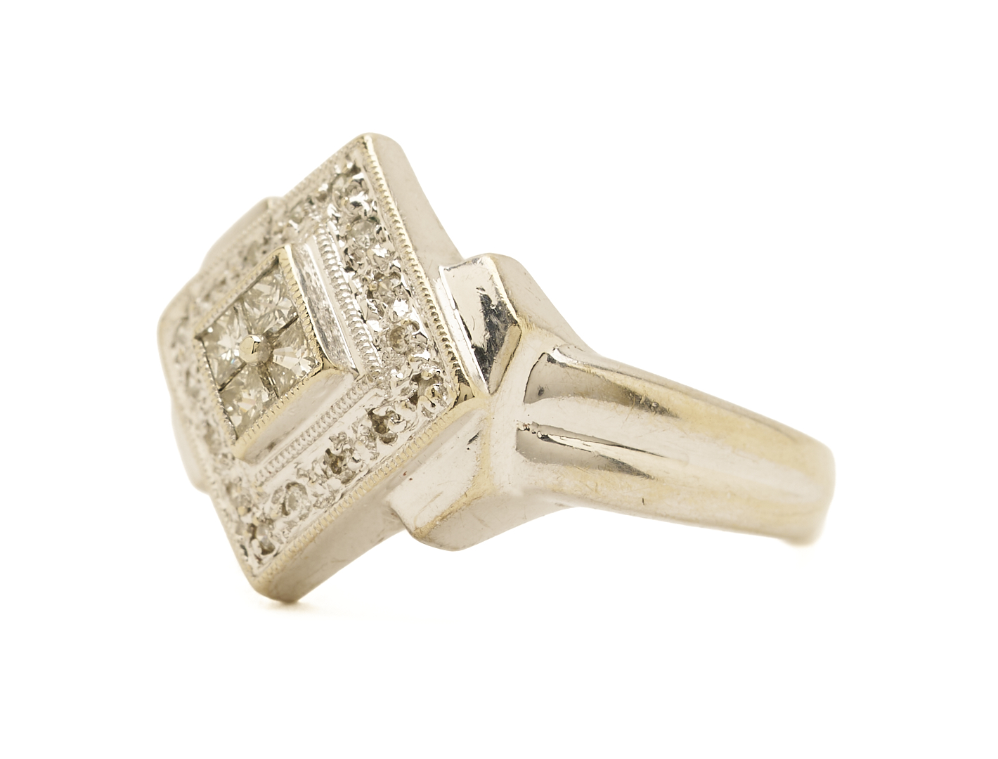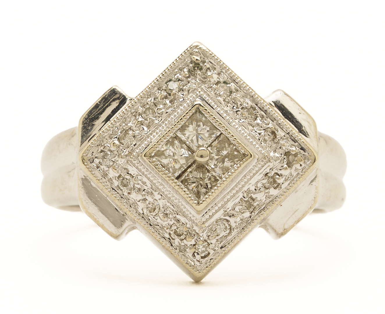 Ladies’ 14K white gold ring featuring four (4) princess cut diamonds approximately 0.60 carats together, Clarity-SI2, Color-H, accented by sixteen (16) single cut melee diamonds. The ring is marked “14K SJTans” and XRF tests 14K gold. The ring is size 7 1/4 and has a gross weight of 5.12 grams.