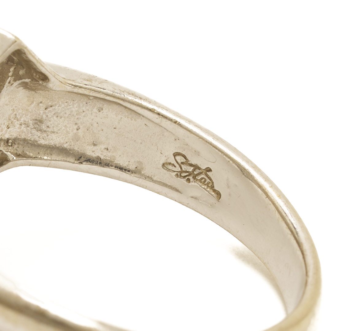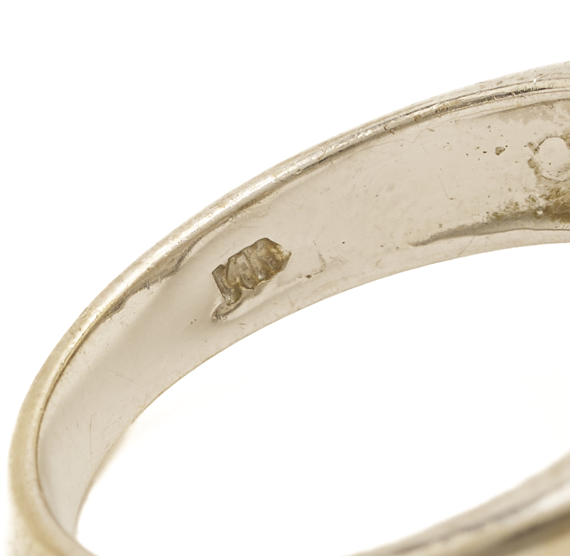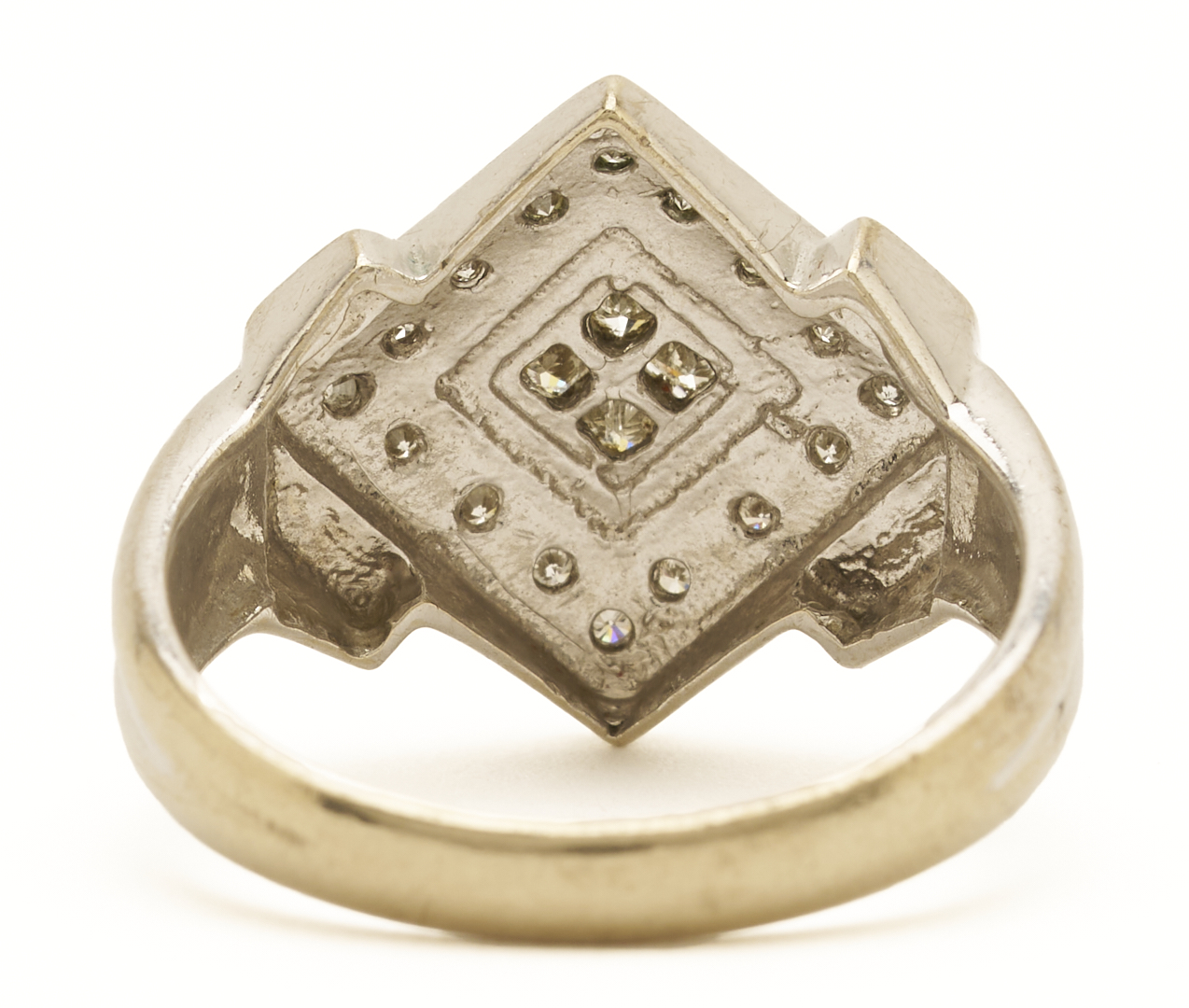 Ladies’ 14K white gold ring featuring four (4) princess cut diamonds approximately 0.60 carats together, Clarity-SI2, Color-H, accented by sixteen (16) single cut melee diamonds. The ring is marked “14K SJTans” and XRF tests 14K gold. The ring is size 7 1/4 and has a gross weight of 5.12 grams.