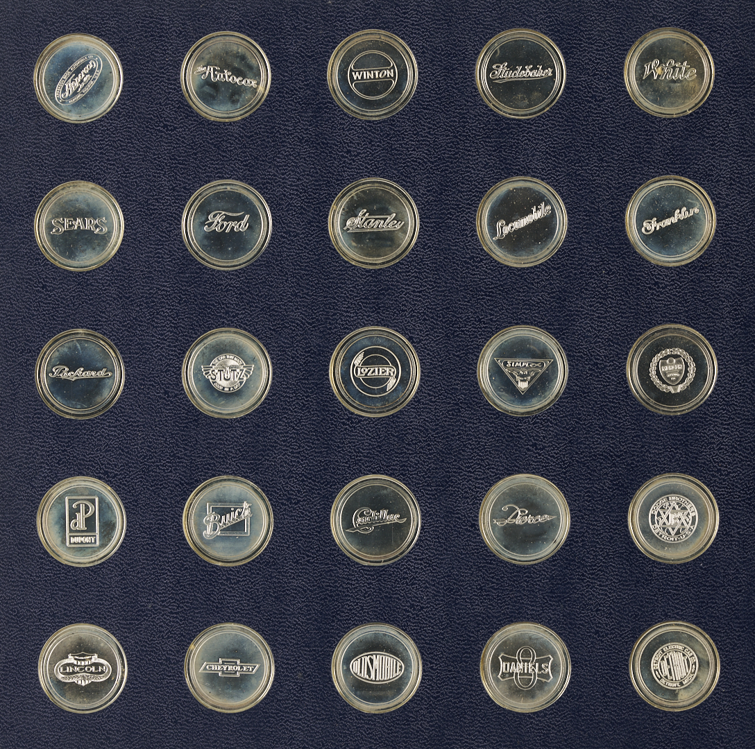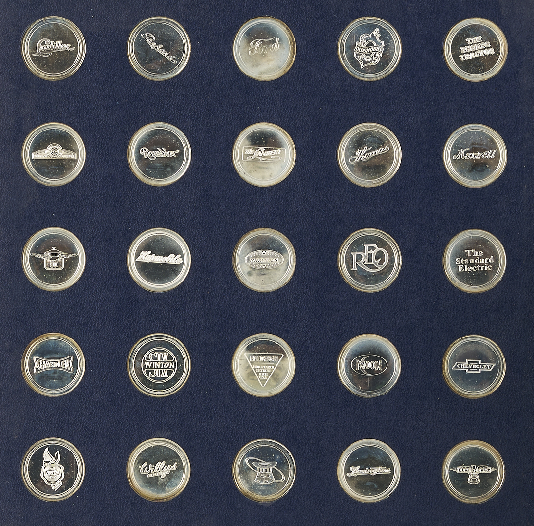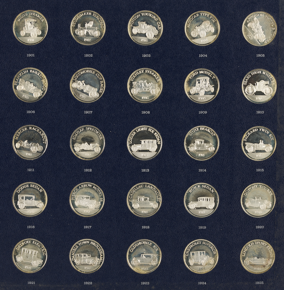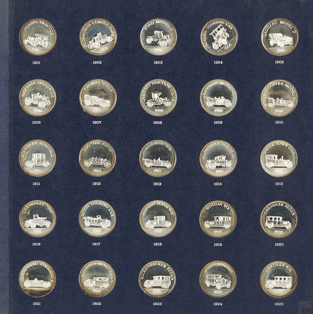 Two (2) Franklin Mint Antique Car Sterling Silver Coin Collections, Series I (1968) and Series II (1969), each housed in the original navy album. Coins depict automobiles from 1901–1925. Series I examples include Franklin Barrel Hood, Lozier Light Six Sedan, Buick Sedan, and Chevrolet Superior. Series II examples include Phelps Tractor, Lambert Friction Drive, White Town Car, and Duesenberg Straight 8. Each set contains twenty-five (25) coins, measuring approximately 1 in. dia., each coin weighing approximately 0.24 troy ounces, for an overall weight of about 6 troy ounces per album (12 troy ounces total). Both albums accompanied by books with detailed descriptions of each coin. Each album measures: 10 1/4 in. L x 10 3/8 in. W x 1 in. D.