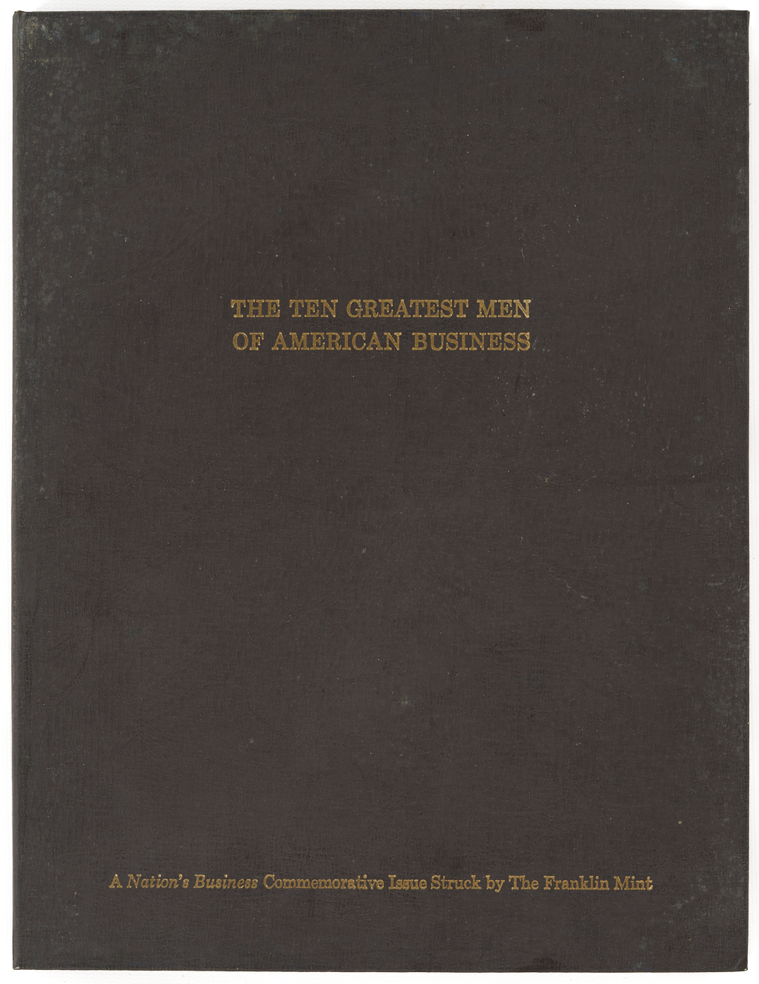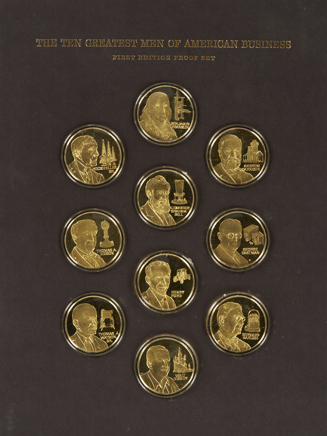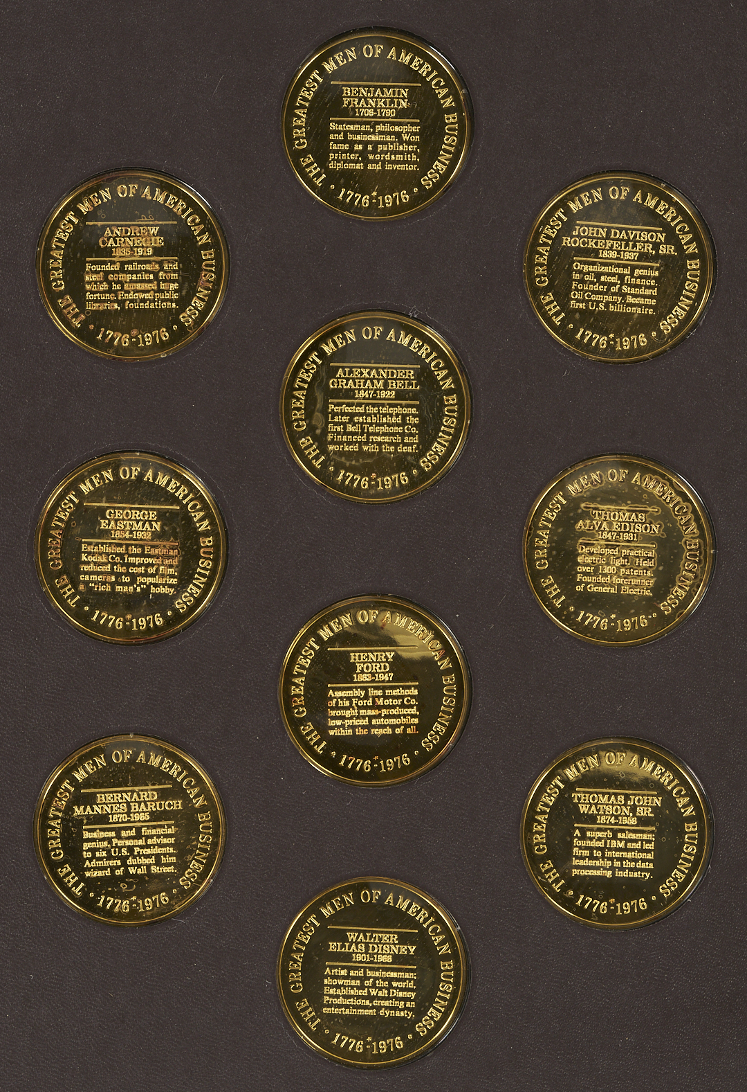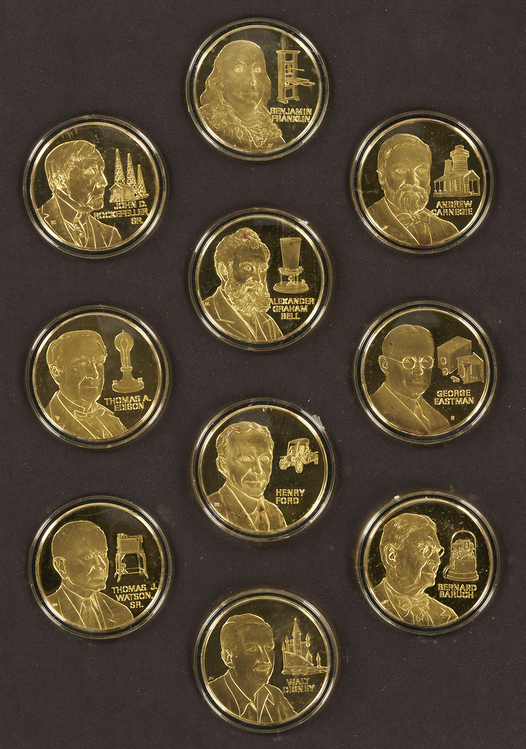 Ten (10) piece Franklin Mint American Business Leaders First Edition set, struck in sterling silver with 24K gold plating. Each coin weighs approximately 1.08 troy ounces and measures approximately 1 1/2 in. (40 mm) in dia., total weight approx. 10.8 troy ounces. Housed in a black hardcover case with pamphlet. Figures depicted: Benjamin Franklin, John D. Rockefeller Sr., Andrew Carnegie, Alexander Graham Bell, Thomas A. Edison, George Eastman, Henry Ford, Thomas J. Watson Sr., Bernard M. Baruch, and Walt Disney. Case measures: 12 1/2 in. L x 9 3/8 in. W x 3/4 in. D