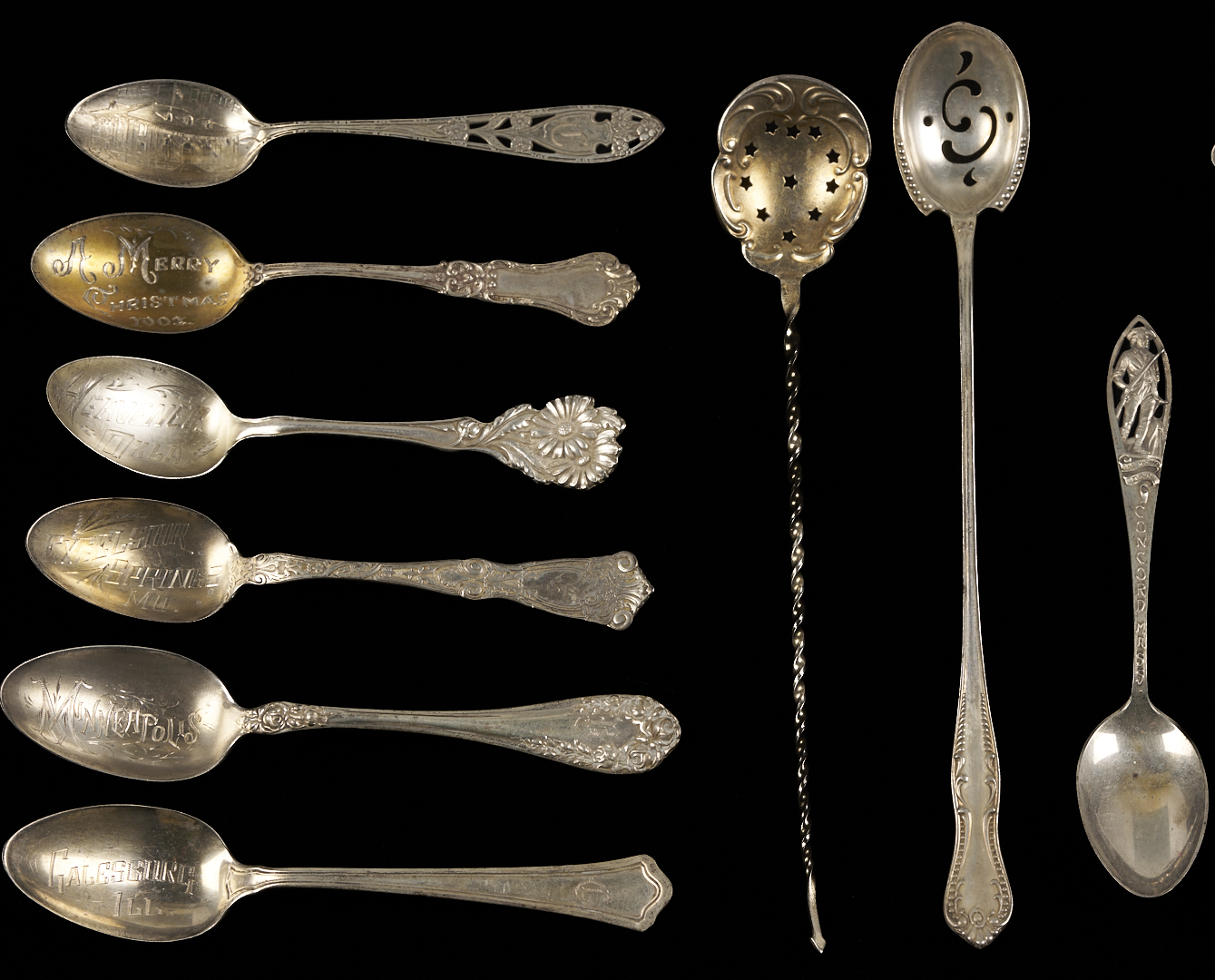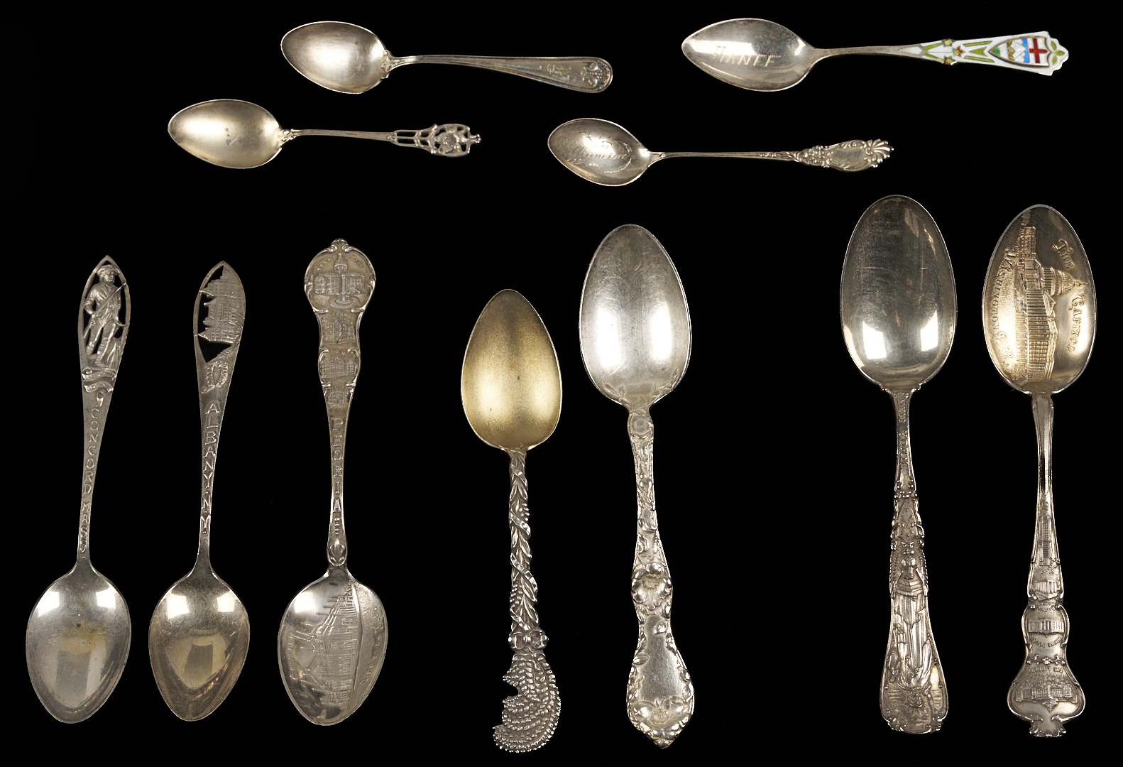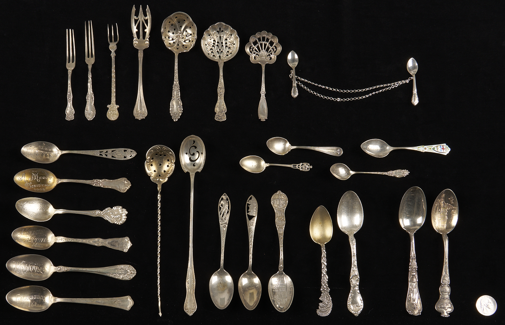 Twenty-seven (27) pieces of assorted sterling silver flatware including: twelve (12) souvenir spoons by various makers, including Tiffany, Watson, Shephard Manufacturing Inc, Roger Williams, CMR, and Meridian; four (4) demitasse spoons including 1 with an enameled handle; three (3) pierced bon bon spoons; two (2) pierced long handled cocktail spoons; two (2) cocktail forks; one (1) Towle sterling salad fork; one (1) Mexican sterling cocktail fork; one (1) Reed & Barton teaspoon; and one (1) sterling double miniature spoon pin. 14.33 total troy ounces.