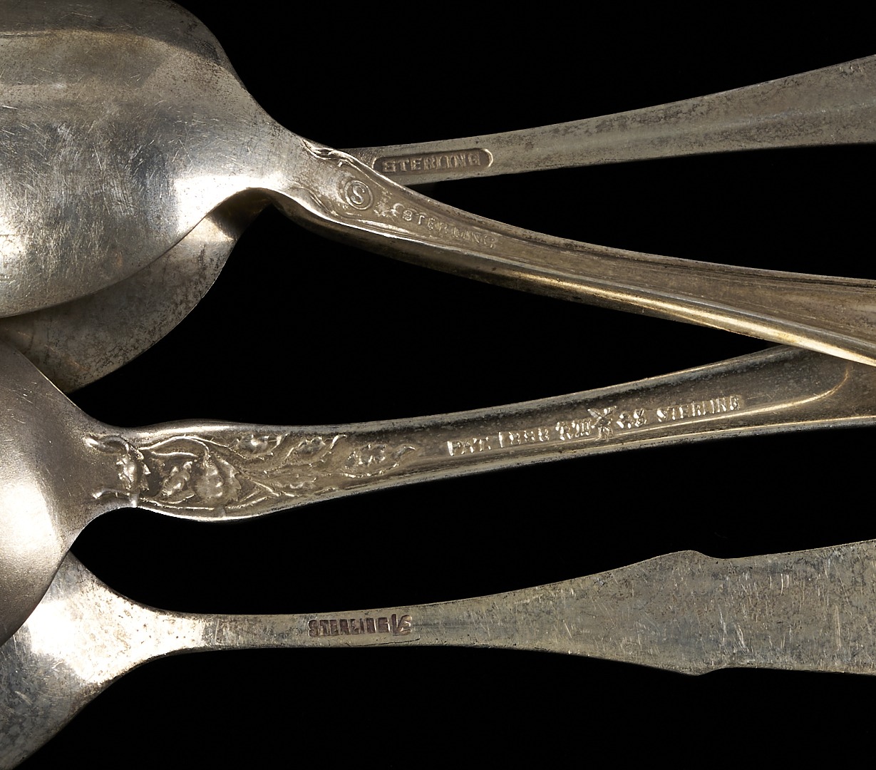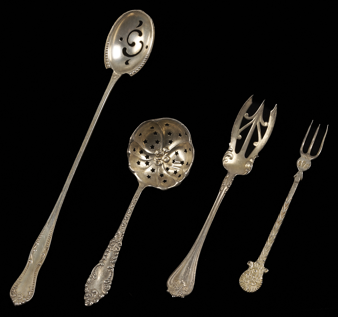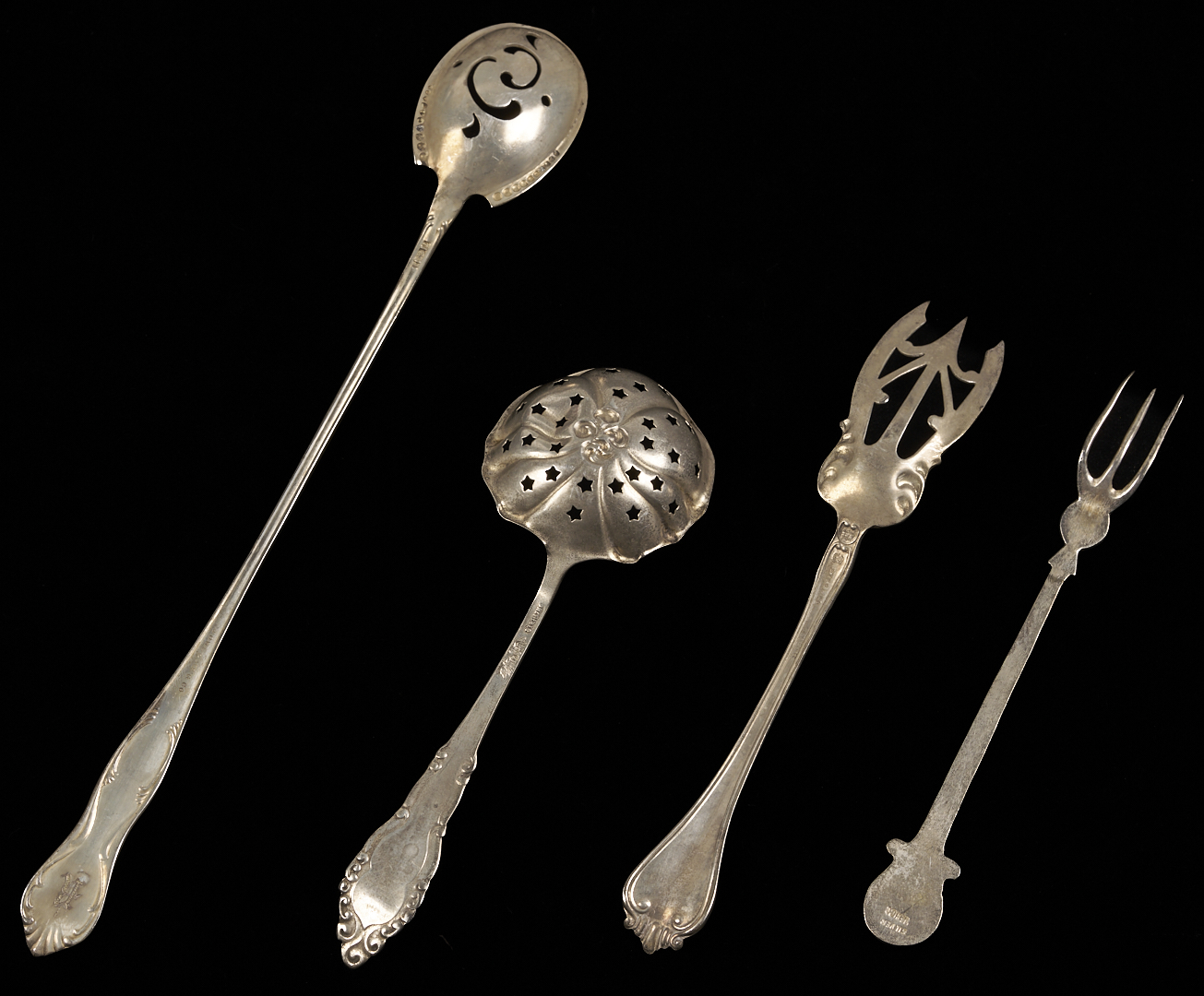 Twenty-seven (27) pieces of assorted sterling silver flatware including: twelve (12) souvenir spoons by various makers, including Tiffany, Watson, Shephard Manufacturing Inc, Roger Williams, CMR, and Meridian; four (4) demitasse spoons including 1 with an enameled handle; three (3) pierced bon bon spoons; two (2) pierced long handled cocktail spoons; two (2) cocktail forks; one (1) Towle sterling salad fork; one (1) Mexican sterling cocktail fork; one (1) Reed & Barton teaspoon; and one (1) sterling double miniature spoon pin. 14.33 total troy ounces.