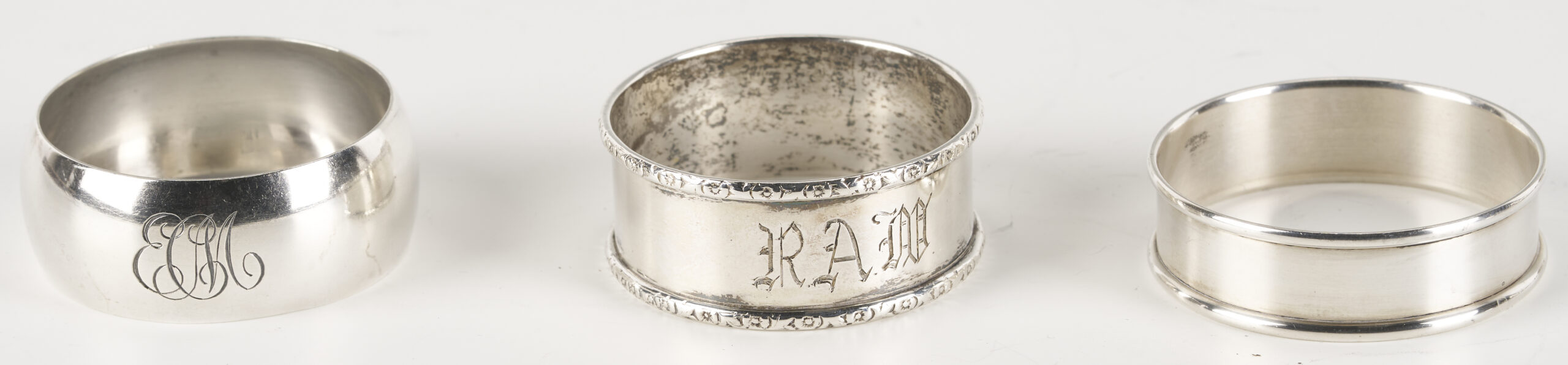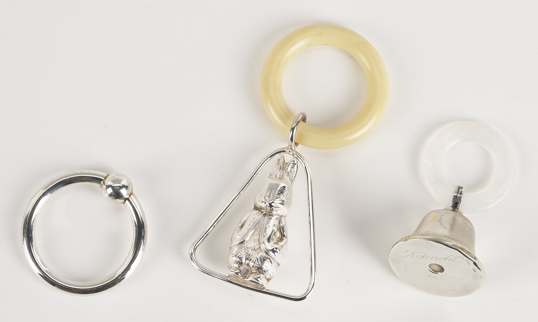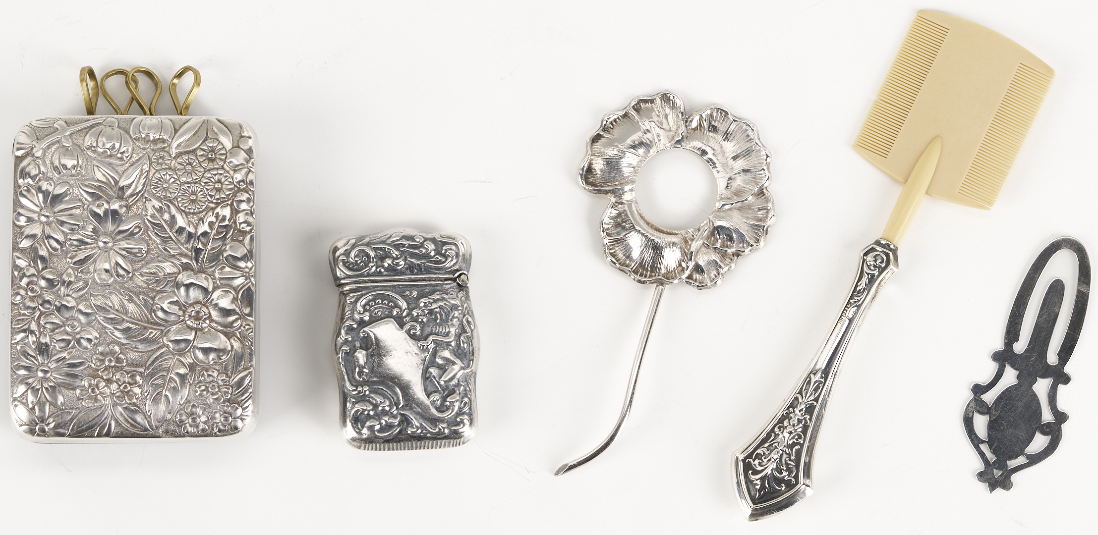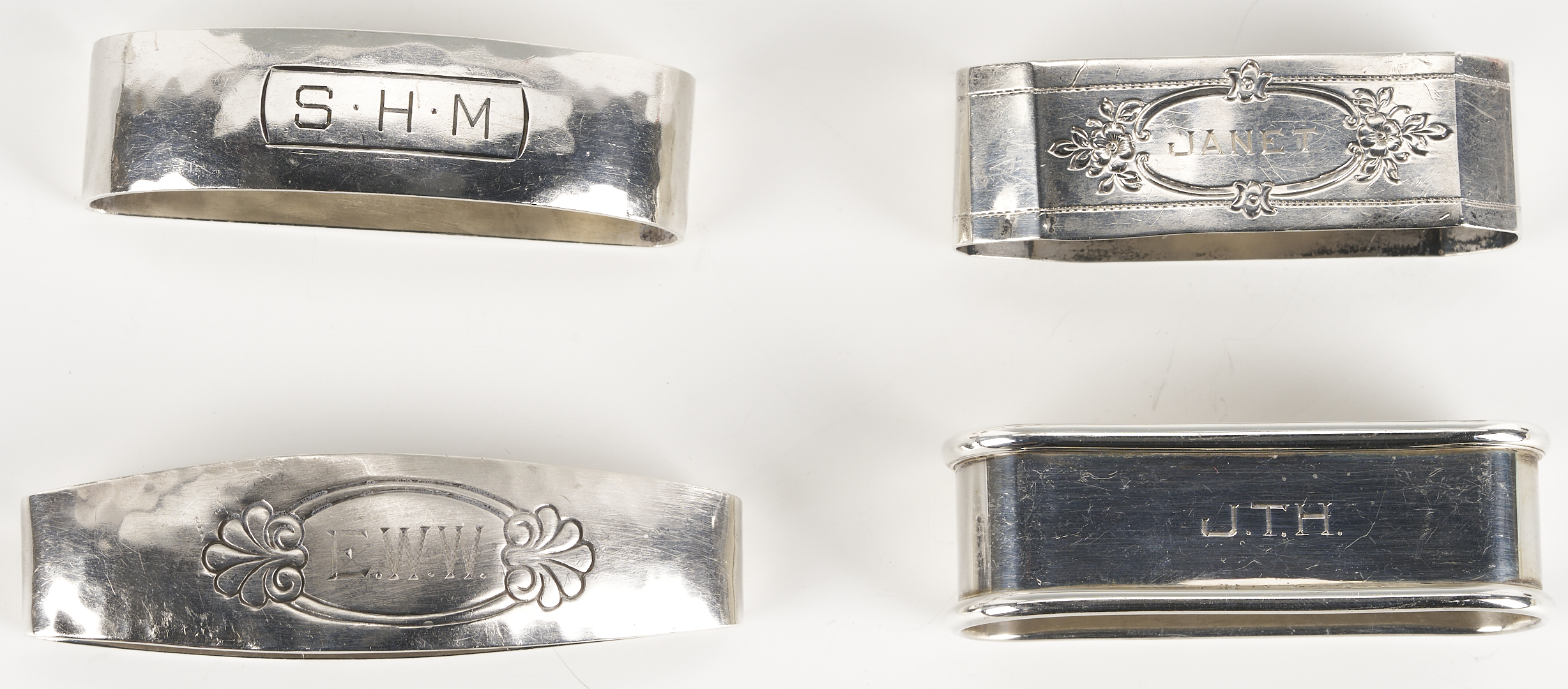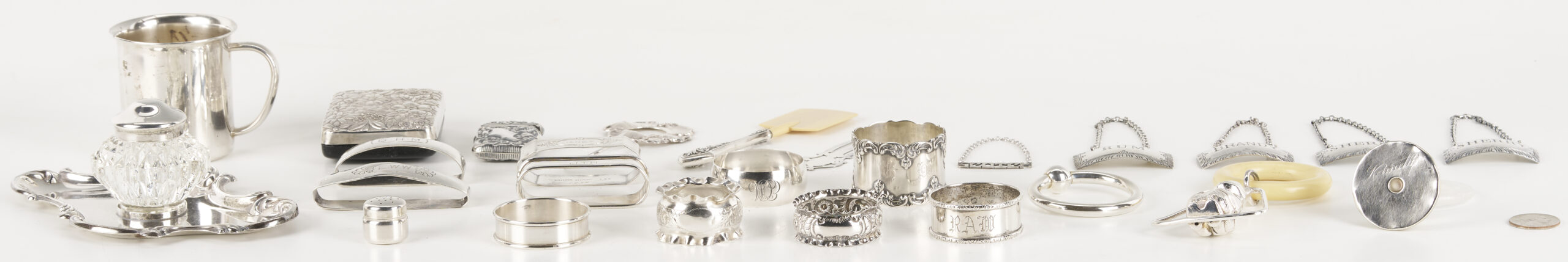 Group of 25 silver novelty items including 1 Tiffany sterling baby ring rattle; 2 unmarked baby rattles (rabbit and bell form, not weighed); 1 baby comb with sterling handle; 1 Towle sterling baby mug with clown design to bottom; 5 sterling liquor tags (4 are marked Stieff, from Colonial Willamsburg designs); 1 Apollo sterling floral form salt shaker; 1 Victorian repousse sterling match safe; 1 sterling inkwell with glass well; 1 Webster sterling bookmark; 1 key case with Gorham sterling cover; and 10 napkin rings (9 marked sterling, 1 not marked or weighed, all from various makers, eight monogrammed). Combined weighable sterling: 13.16 oz troy.