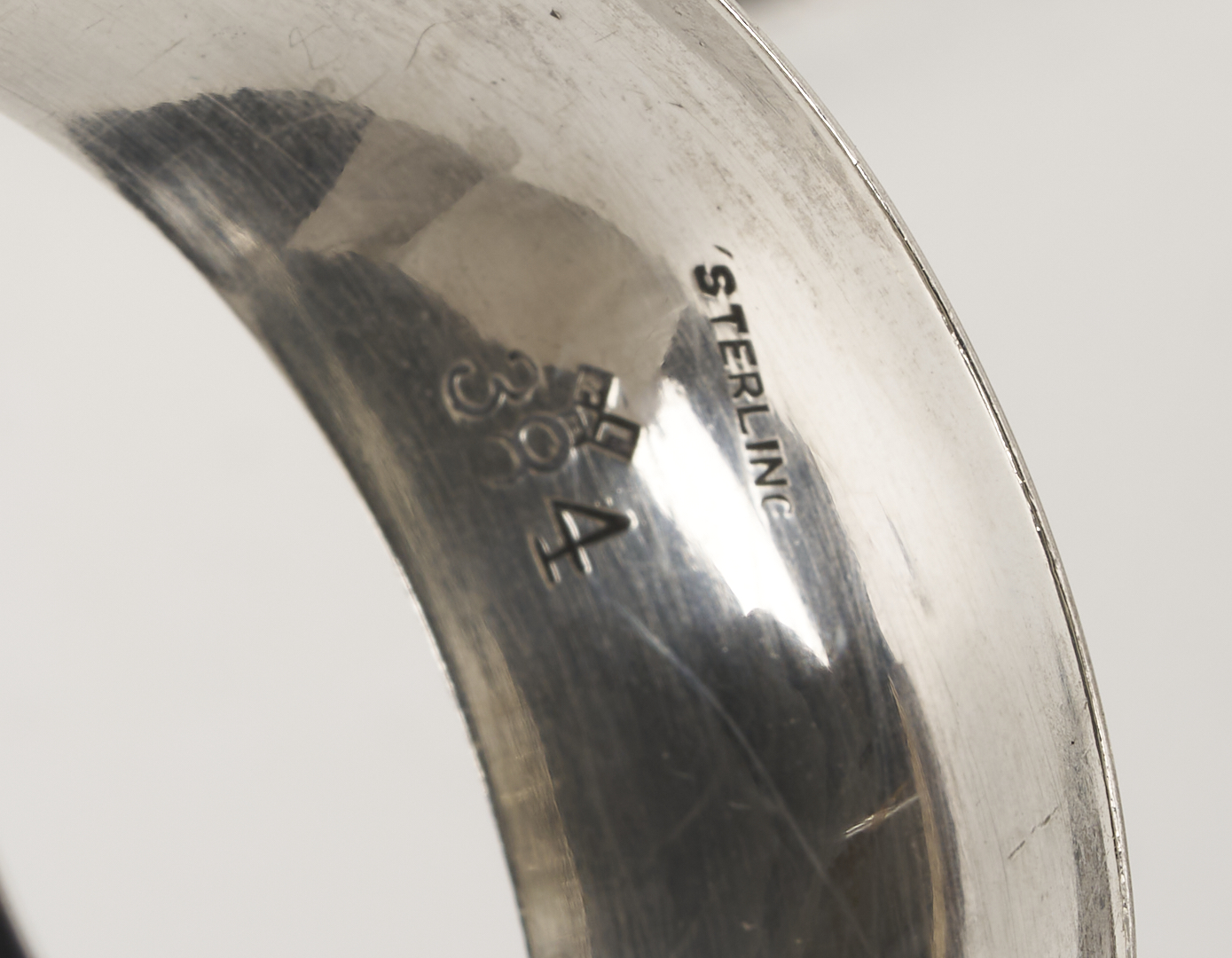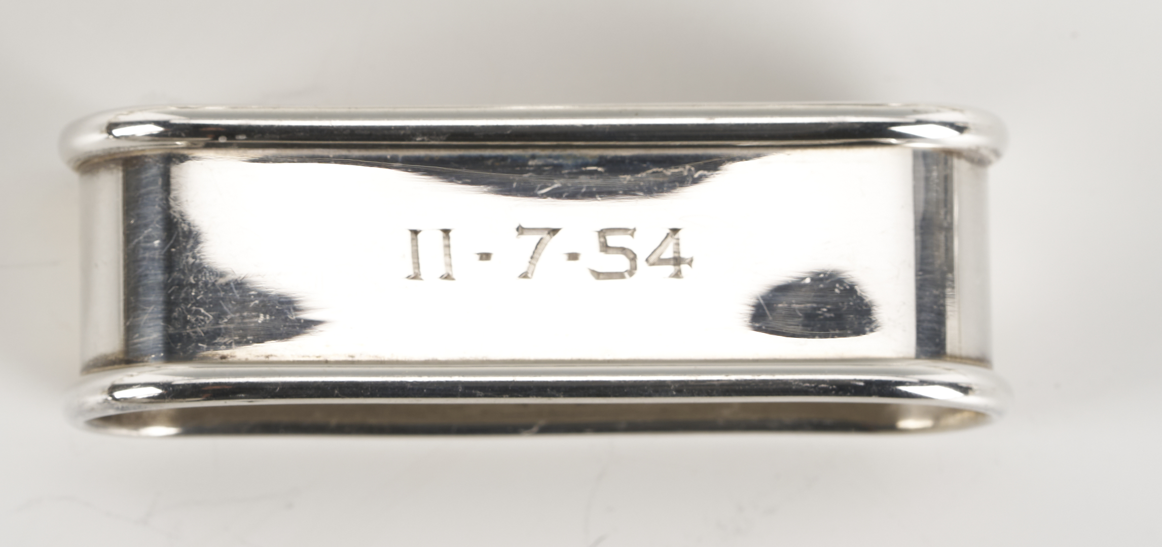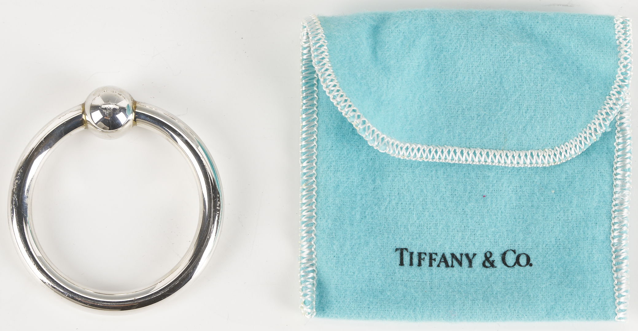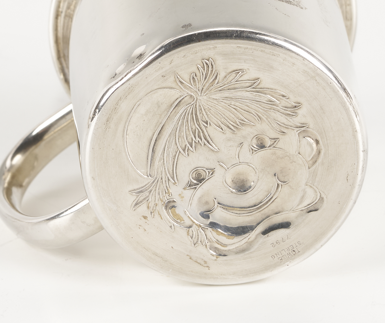 Group of 25 silver novelty items including 1 Tiffany sterling baby ring rattle; 2 unmarked baby rattles (rabbit and bell form, not weighed); 1 baby comb with sterling handle; 1 Towle sterling baby mug with clown design to bottom; 5 sterling liquor tags (4 are marked Stieff, from Colonial Willamsburg designs); 1 Apollo sterling floral form salt shaker; 1 Victorian repousse sterling match safe; 1 sterling inkwell with glass well; 1 Webster sterling bookmark; 1 key case with Gorham sterling cover; and 10 napkin rings (9 marked sterling, 1 not marked or weighed, all from various makers, eight monogrammed). Combined weighable sterling: 13.16 oz troy.