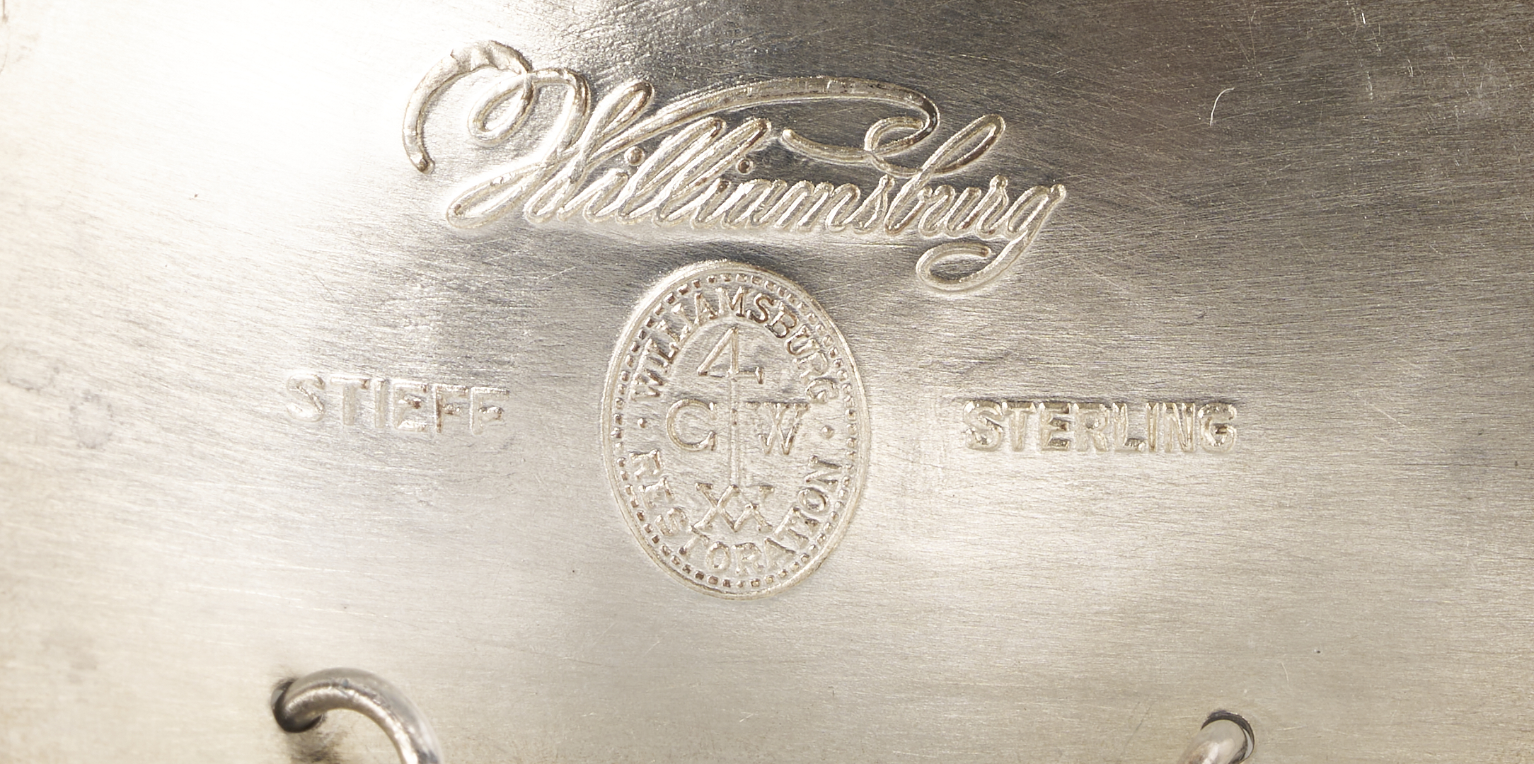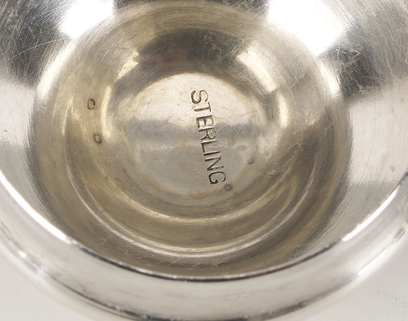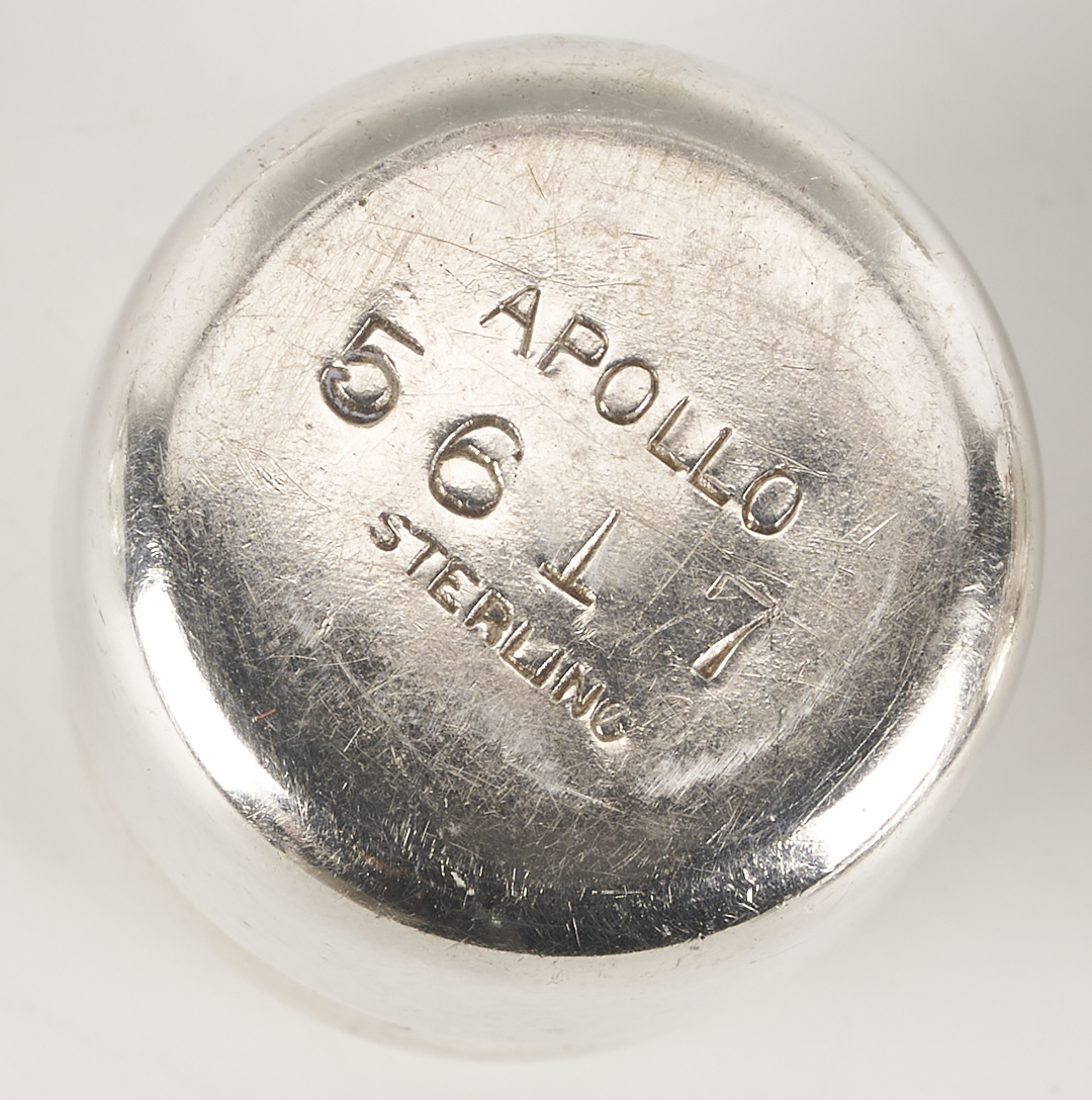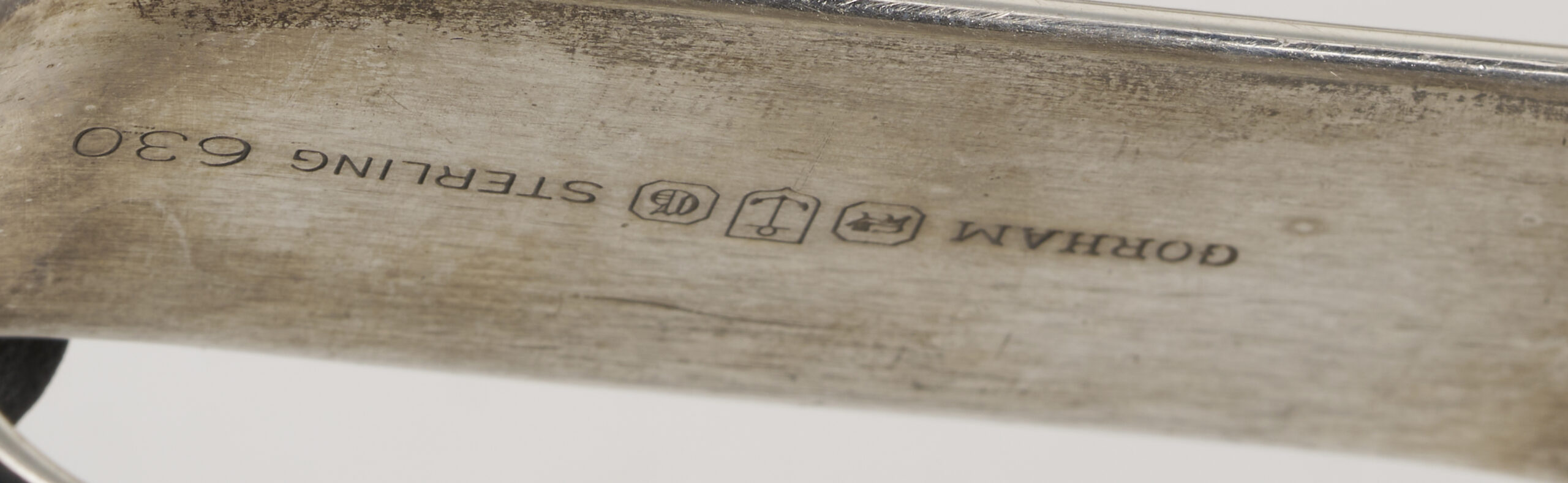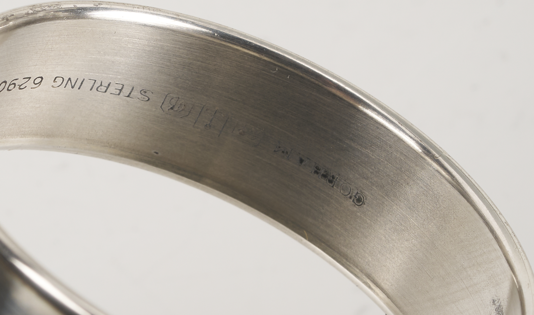 Group of 25 silver novelty items including 1 Tiffany sterling baby ring rattle; 2 unmarked baby rattles (rabbit and bell form, not weighed); 1 baby comb with sterling handle; 1 Towle sterling baby mug with clown design to bottom; 5 sterling liquor tags (4 are marked Stieff, from Colonial Willamsburg designs); 1 Apollo sterling floral form salt shaker; 1 Victorian repousse sterling match safe; 1 sterling inkwell with glass well; 1 Webster sterling bookmark; 1 key case with Gorham sterling cover; and 10 napkin rings (9 marked sterling, 1 not marked or weighed, all from various makers, eight monogrammed). Combined weighable sterling: 13.16 oz troy.