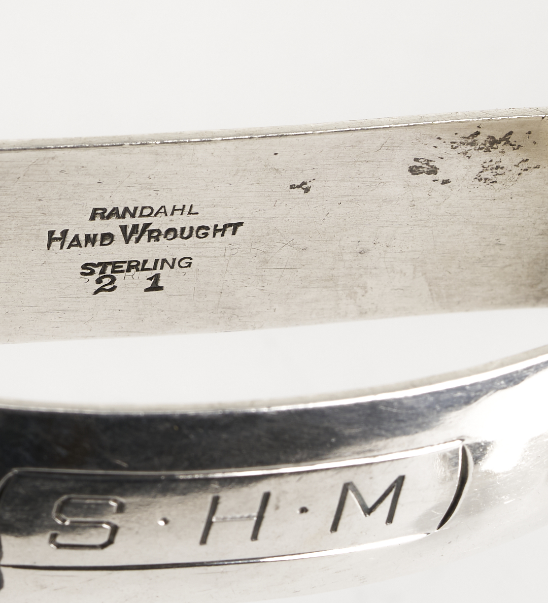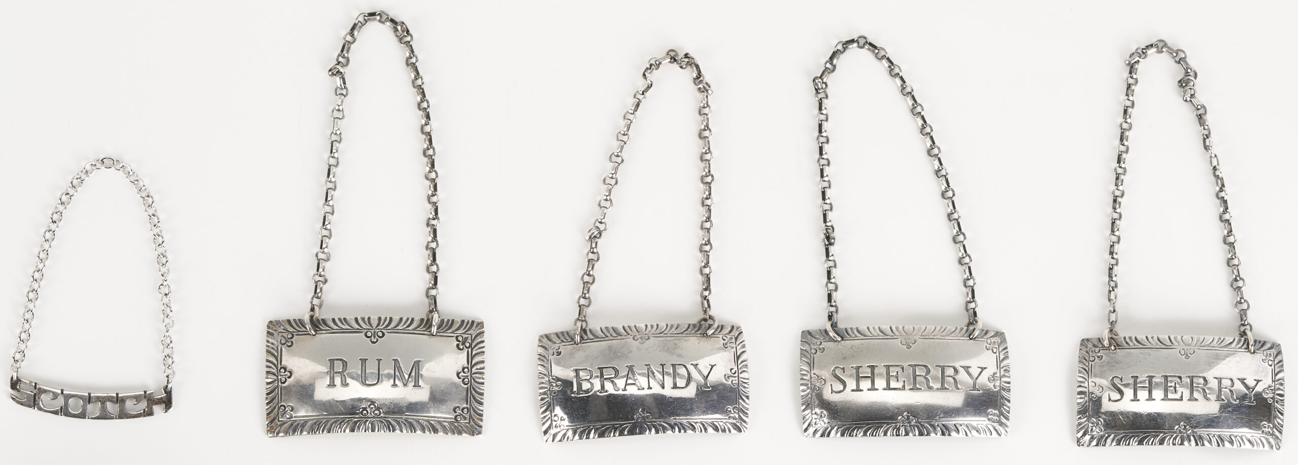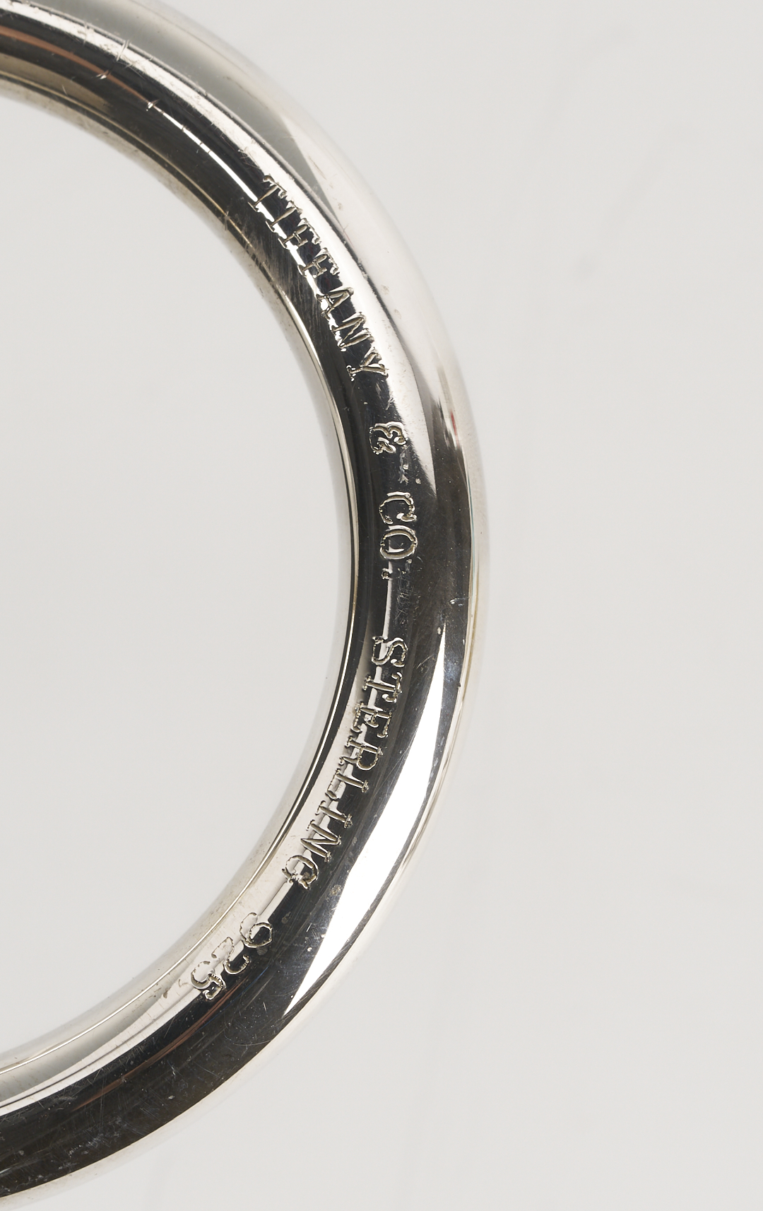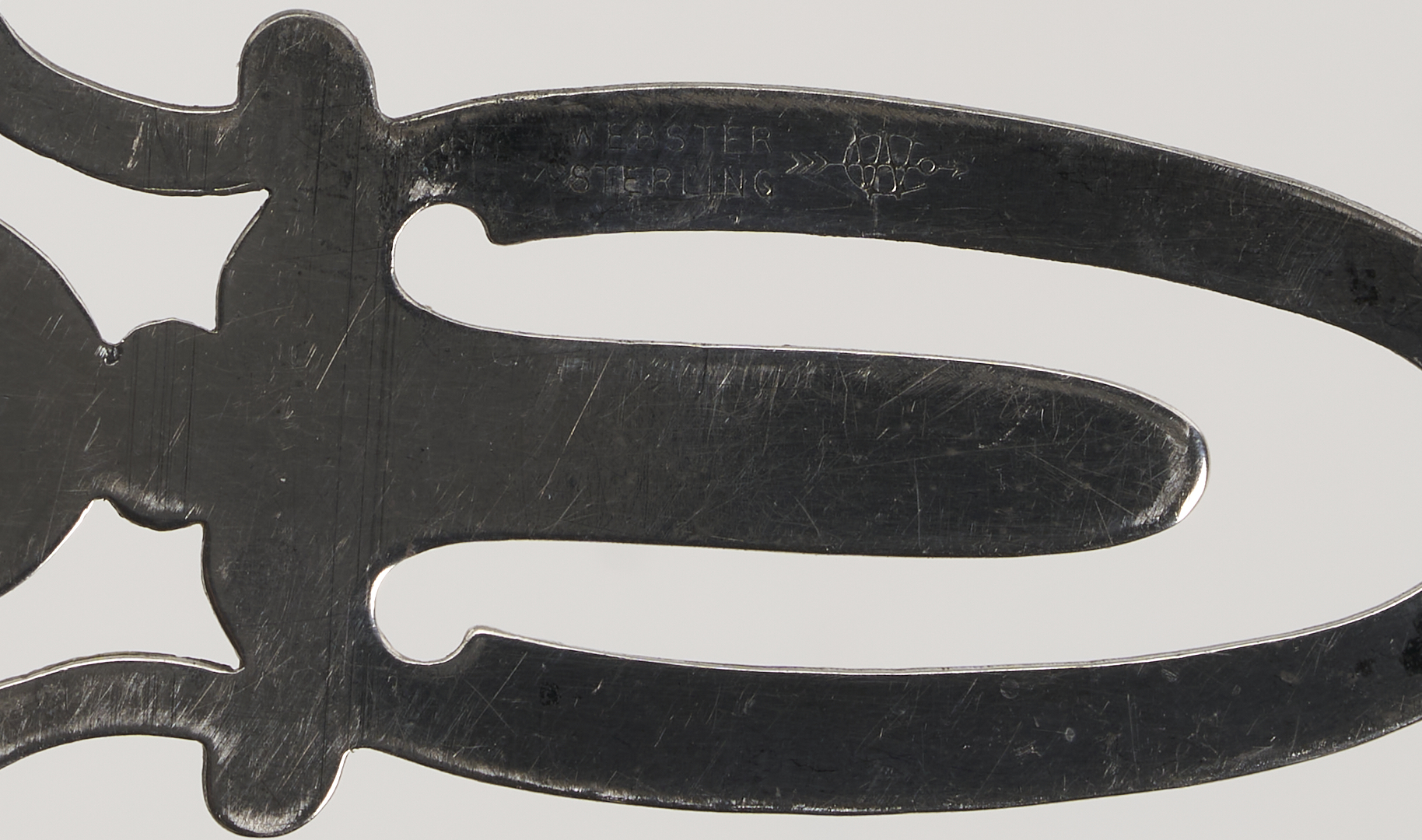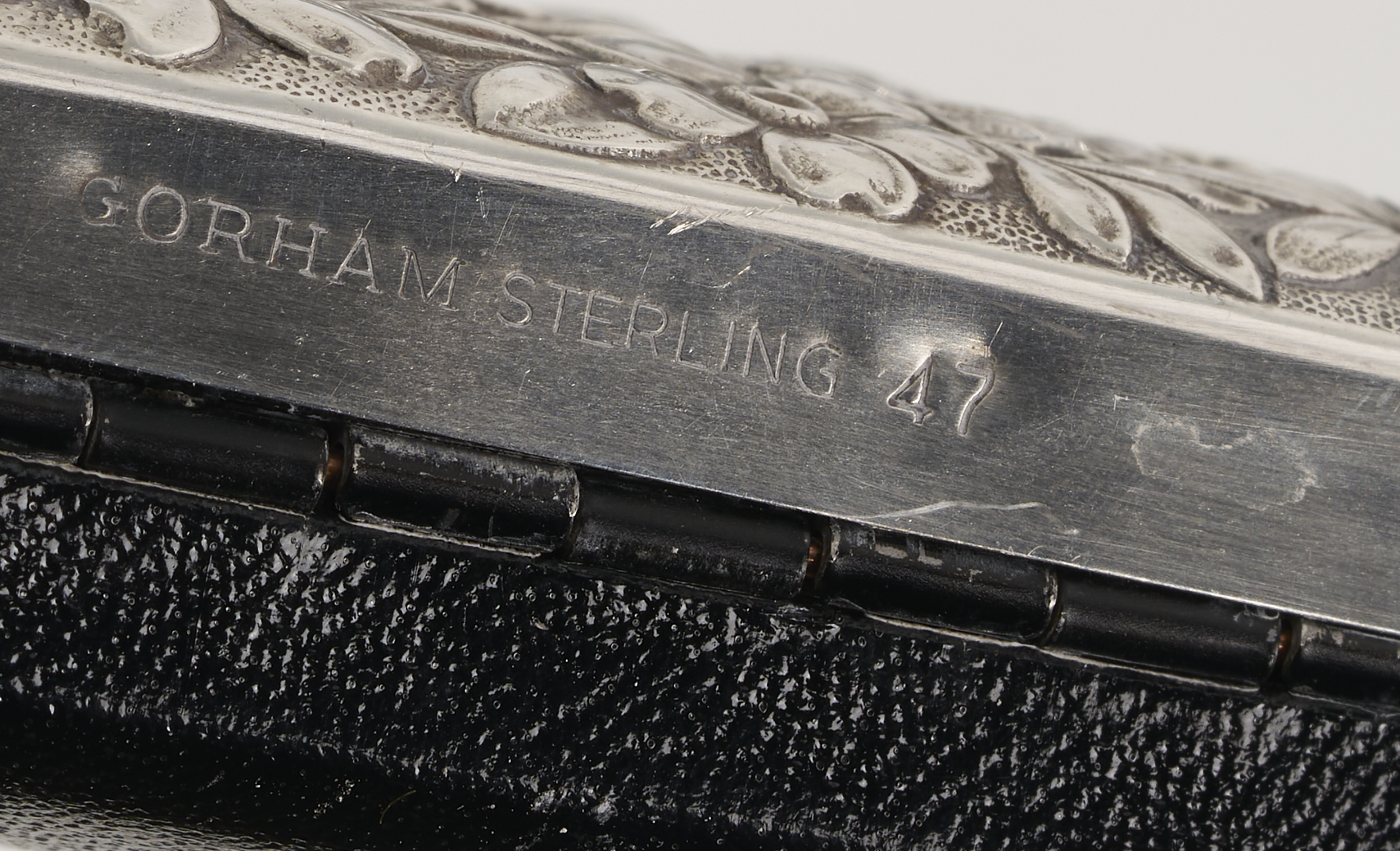 Group of 25 silver novelty items including 1 Tiffany sterling baby ring rattle; 2 unmarked baby rattles (rabbit and bell form, not weighed); 1 baby comb with sterling handle; 1 Towle sterling baby mug with clown design to bottom; 5 sterling liquor tags (4 are marked Stieff, from Colonial Willamsburg designs); 1 Apollo sterling floral form salt shaker; 1 Victorian repousse sterling match safe; 1 sterling inkwell with glass well; 1 Webster sterling bookmark; 1 key case with Gorham sterling cover; and 10 napkin rings (9 marked sterling, 1 not marked or weighed, all from various makers, eight monogrammed). Combined weighable sterling: 13.16 oz troy.