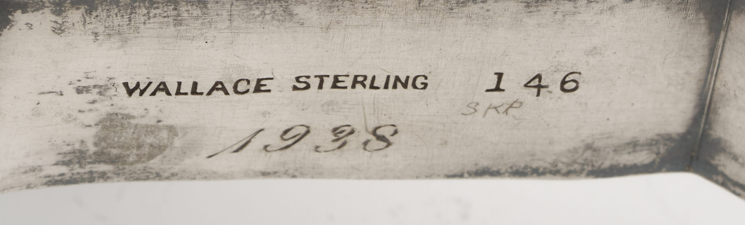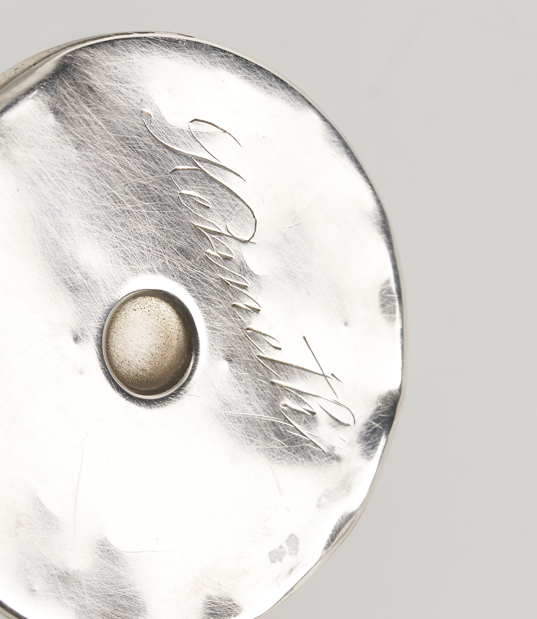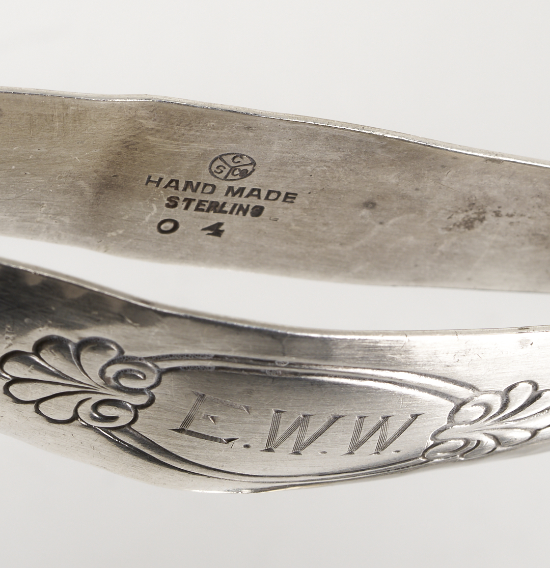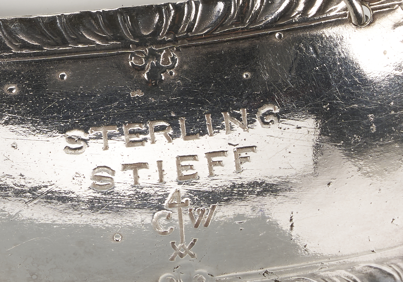 Group of 25 silver novelty items including 1 Tiffany sterling baby ring rattle; 2 unmarked baby rattles (rabbit and bell form, not weighed); 1 baby comb with sterling handle; 1 Towle sterling baby mug with clown design to bottom; 5 sterling liquor tags (4 are marked Stieff, from Colonial Willamsburg designs); 1 Apollo sterling floral form salt shaker; 1 Victorian repousse sterling match safe; 1 sterling inkwell with glass well; 1 Webster sterling bookmark; 1 key case with Gorham sterling cover; and 10 napkin rings (9 marked sterling, 1 not marked or weighed, all from various makers, eight monogrammed). Combined weighable sterling: 13.16 oz troy.