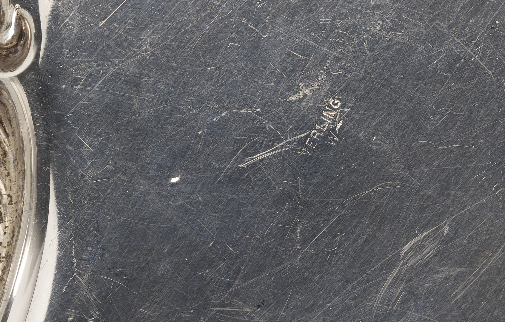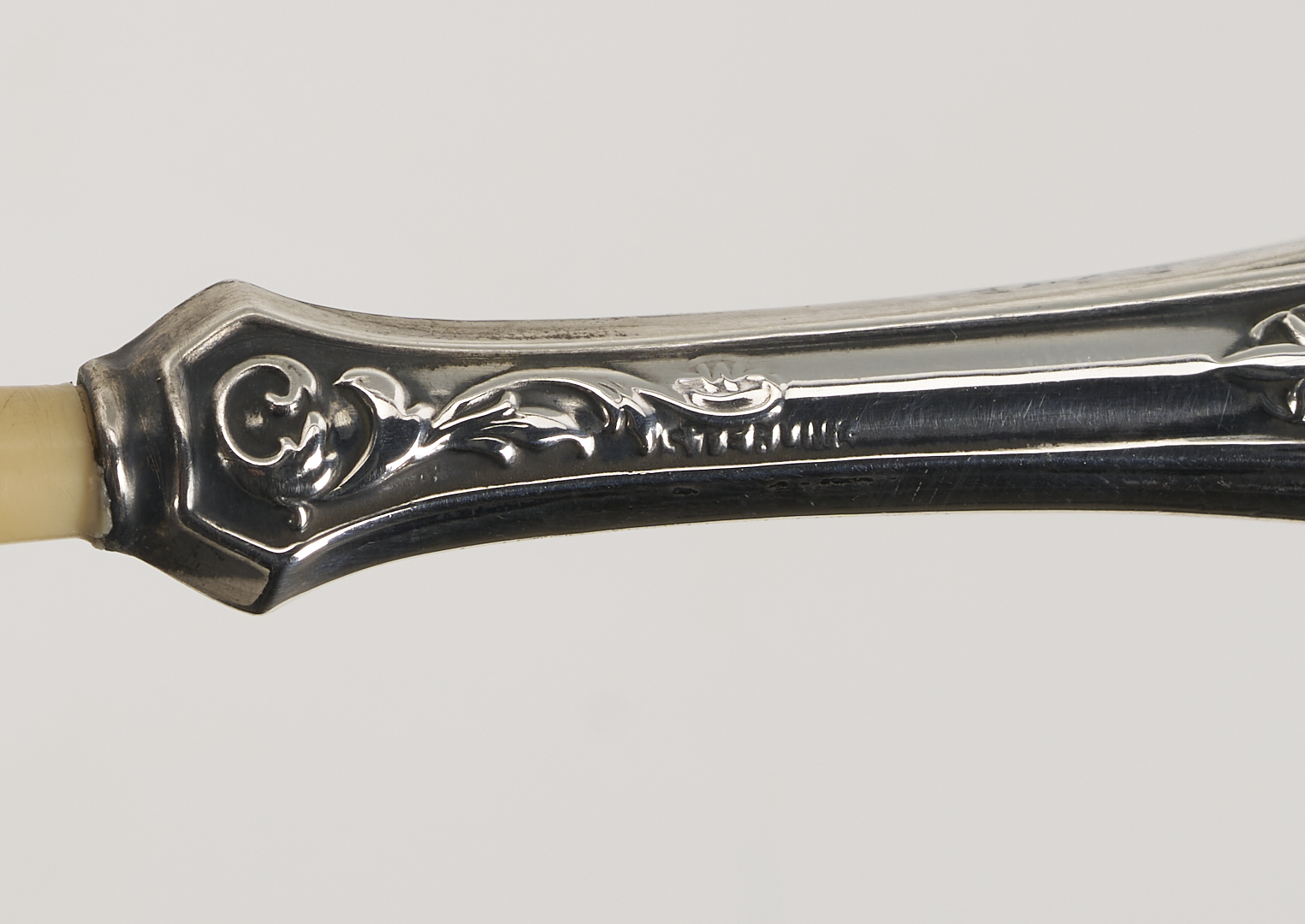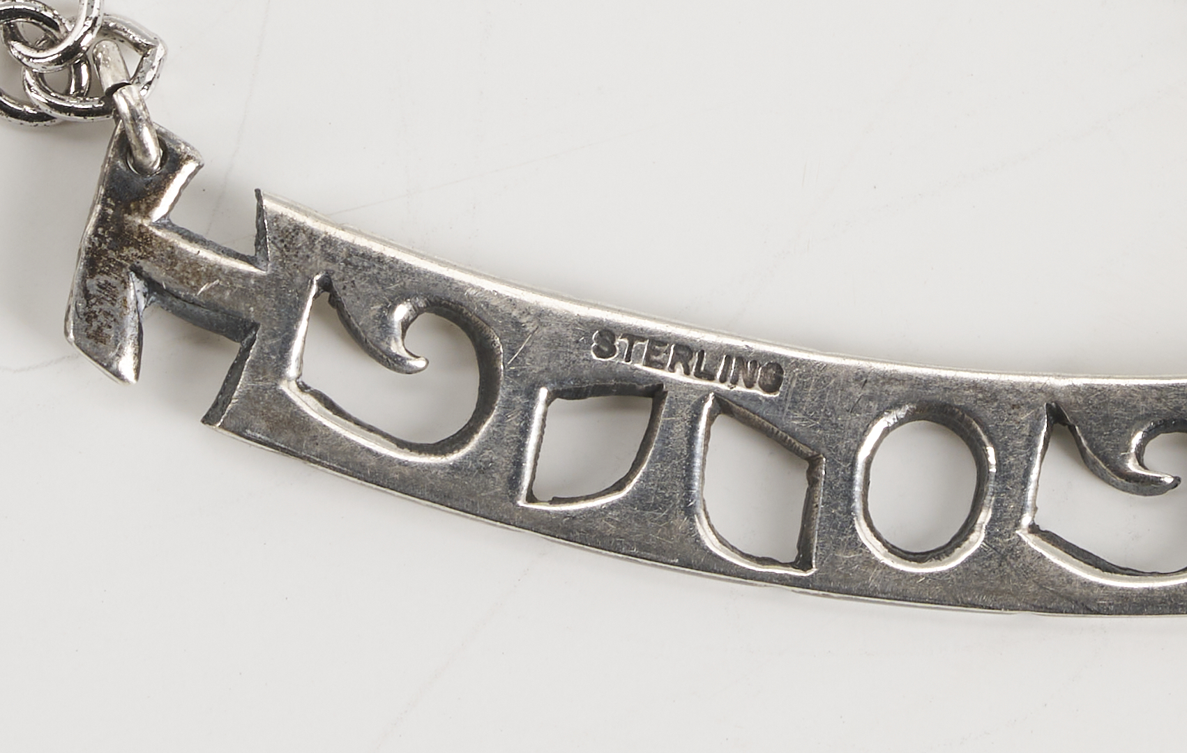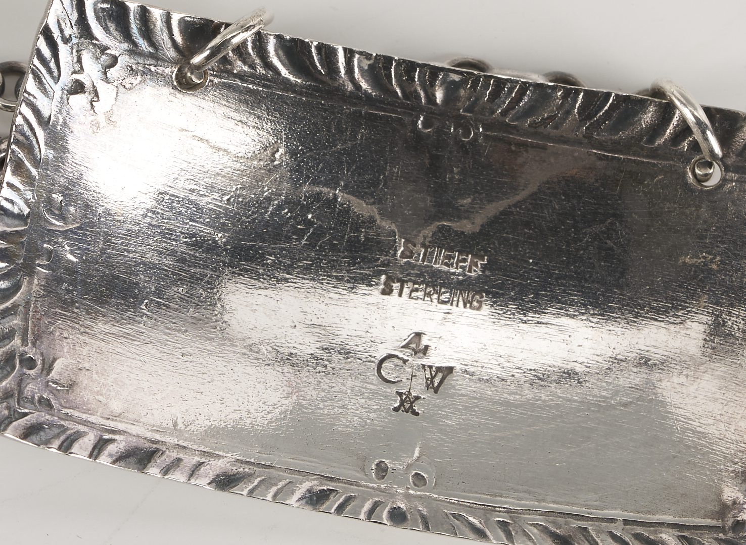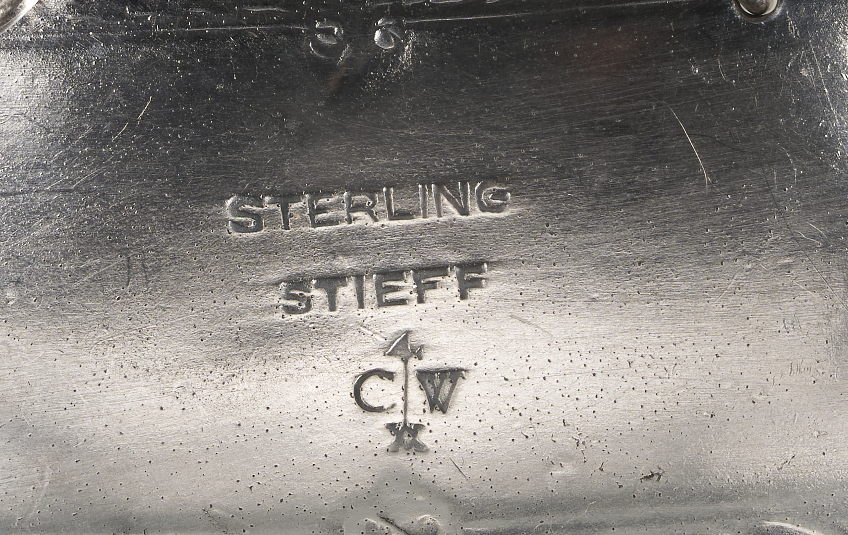 Group of 25 silver novelty items including 1 Tiffany sterling baby ring rattle; 2 unmarked baby rattles (rabbit and bell form, not weighed); 1 baby comb with sterling handle; 1 Towle sterling baby mug with clown design to bottom; 5 sterling liquor tags (4 are marked Stieff, from Colonial Willamsburg designs); 1 Apollo sterling floral form salt shaker; 1 Victorian repousse sterling match safe; 1 sterling inkwell with glass well; 1 Webster sterling bookmark; 1 key case with Gorham sterling cover; and 10 napkin rings (9 marked sterling, 1 not marked or weighed, all from various makers, eight monogrammed). Combined weighable sterling: 13.16 oz troy.