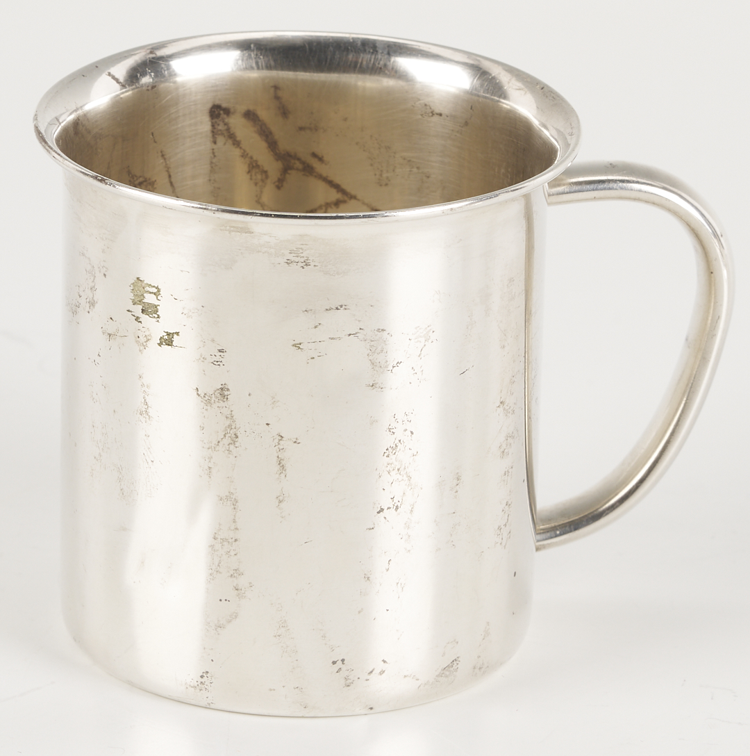 Baby items with some minor denting, fleabite size chip to glass inkwell; overall all items in very good condition.