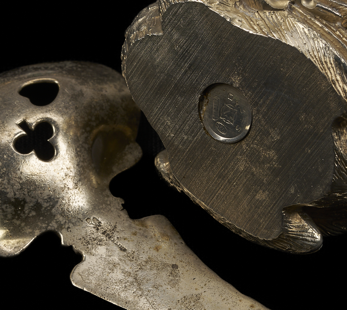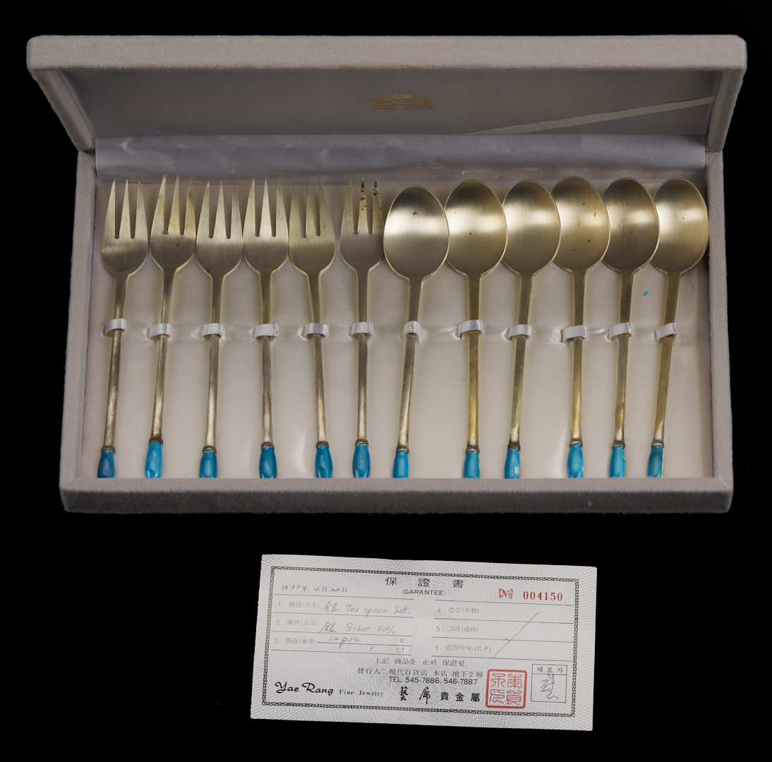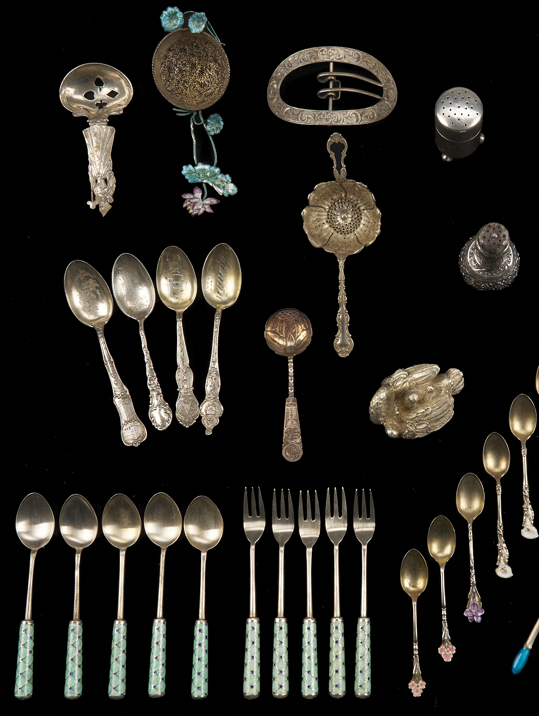 Group of 44 novelty and enameled silver items, including 1 sterling Swan figural group marked 925 (2 in. H); 1 Whiting Queen of Clubs sterling playing card themed pierced nut spoon; 1 sterling oval belt buckle with chased floral decoration; 2 Whiting sterling Salt and Pepper shakers; 1 English sterling footed salt shaker; 5 American sterling Souvenir spoons; 1 Chinese souvenir spoon with Chinese hallmark; 1 Gorham sterling tea strainer or sugar sifter spoon; 1 unmarked floral enameled silver tea strainer or sugar sifter with filigree basket; 8 floral enameled sterling demitasse spoons by various makers; 10 Korean enameled .925 sterling spoons and forks (five of each); and one boxed set of 12 Chinese enameled .800 silver spoons and forks (six of each). Case 12 in. x 7 in. Combined weighable sterling: 13.26 oz troy.
