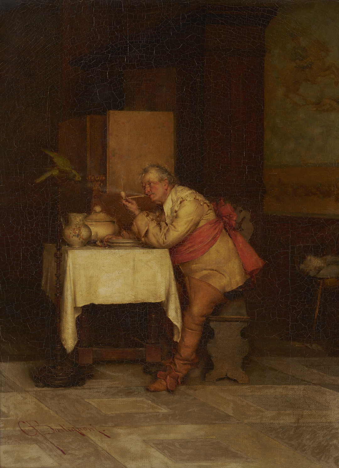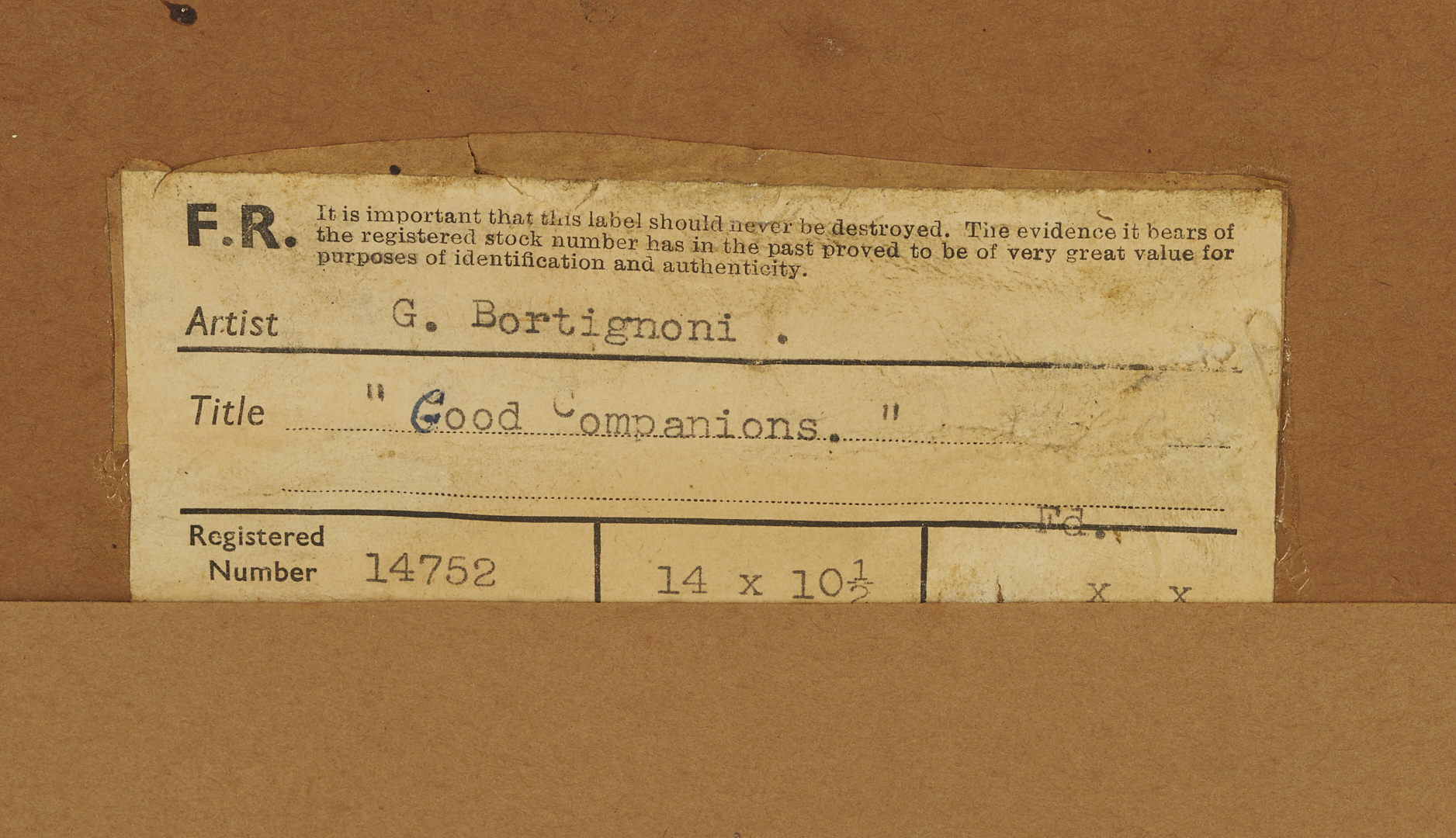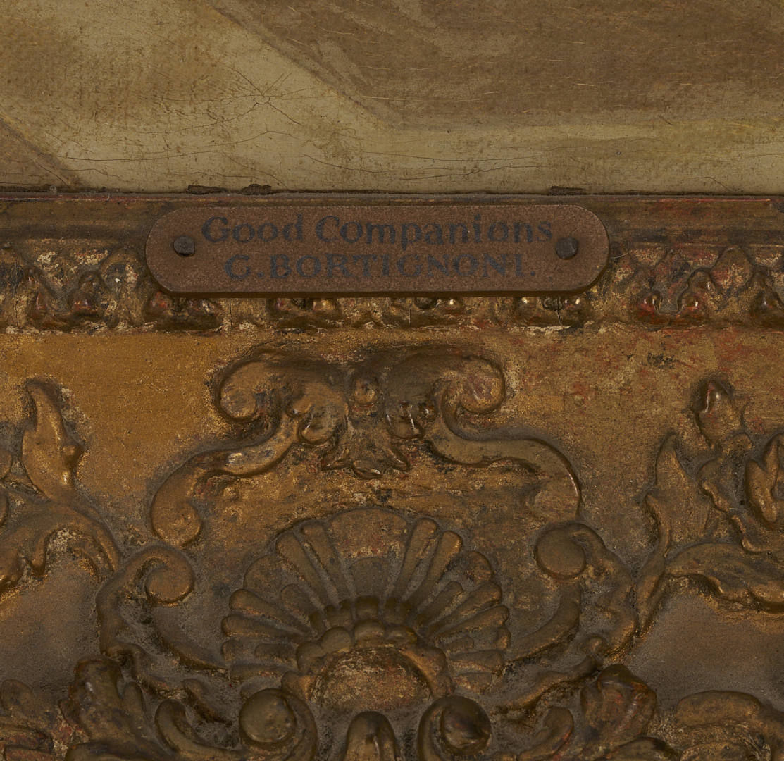 Giuseppe Bortignoni (Italy, 1778-1860) oil on canvas genre painting, “Good Companions,” 19th c. An elderly cavalier sits at a table in a grand domestic interior and leans forward as he blows smoke from his pipe toward a green parrot that raises its wings excitedly. Signed lower left. Housed in a molded giltwood frame with nameplate. With Findlay Galleries, Chicago label and Frost & Reed label with attribution, title, and registration number 14752 affixed to backing. Sight: 14 1/4 in. H x 10 1/2 in. W. Framed: 19 3/4 in. H x 15 3/4 in. W