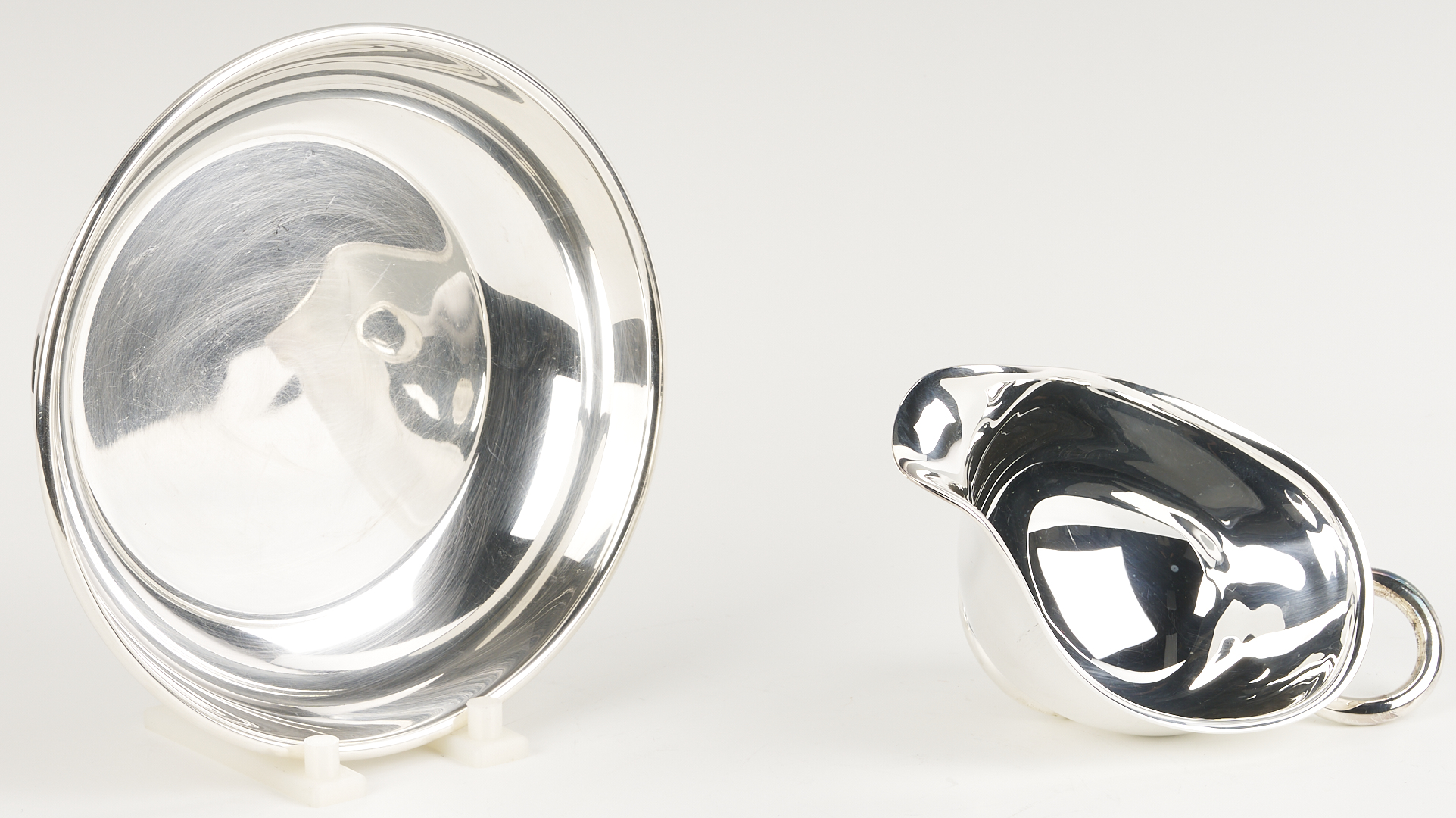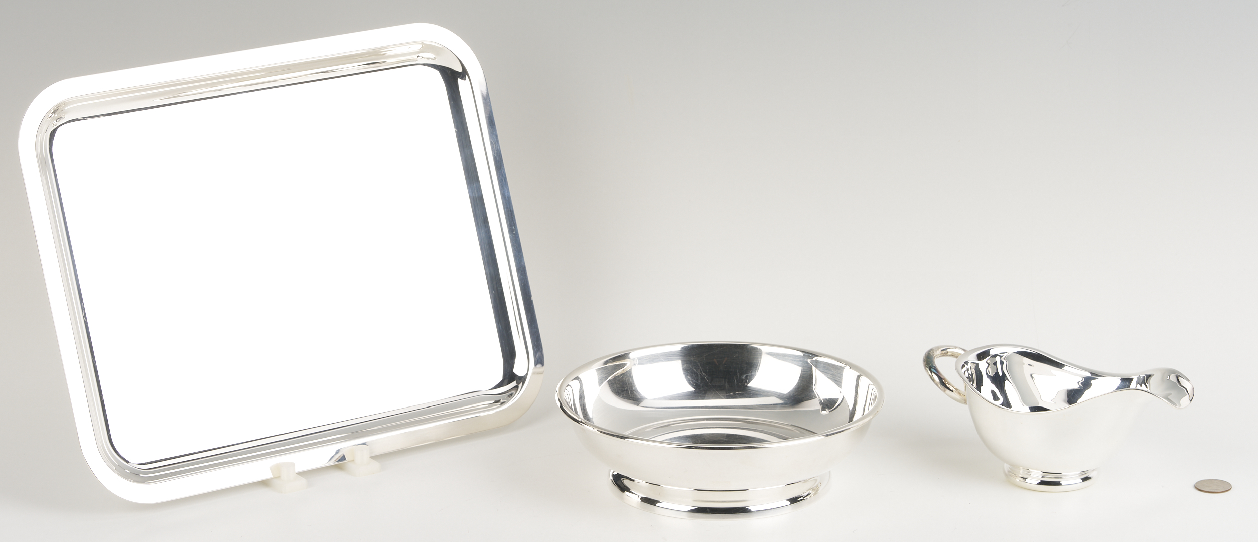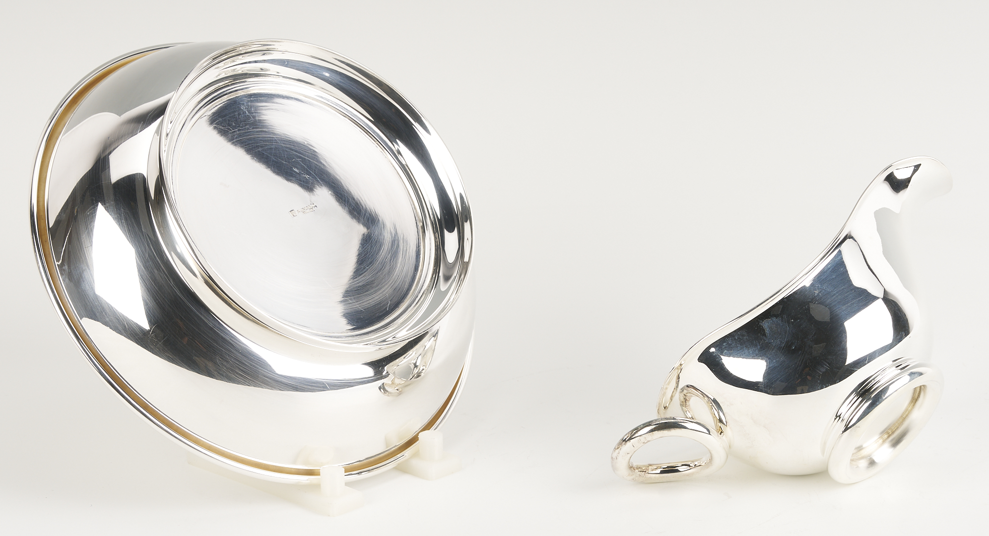 Tray and bowl are in very good condition with light scratches. Gravy boat: Mint condition, never used. Sales sticker and tape residue on boxes. Sheffield tray with light overall surface scratching.