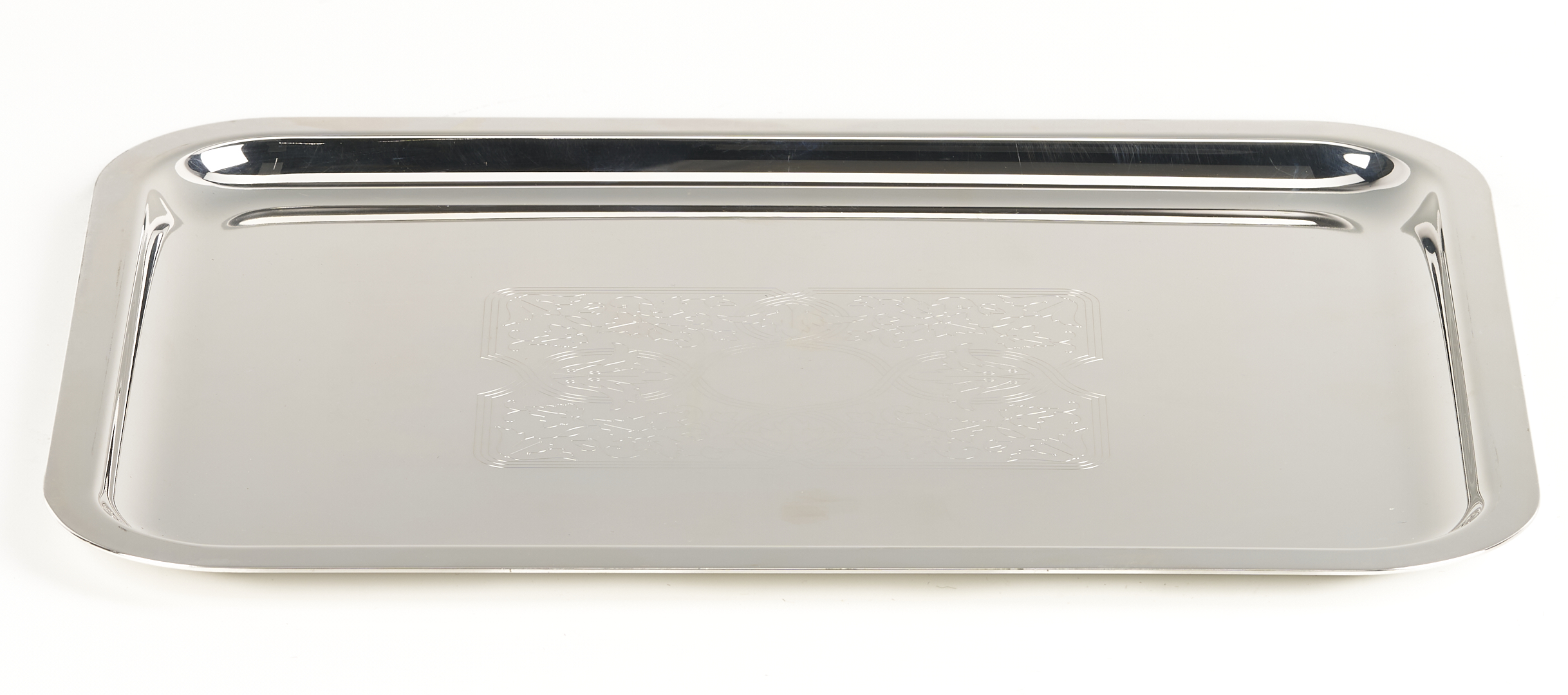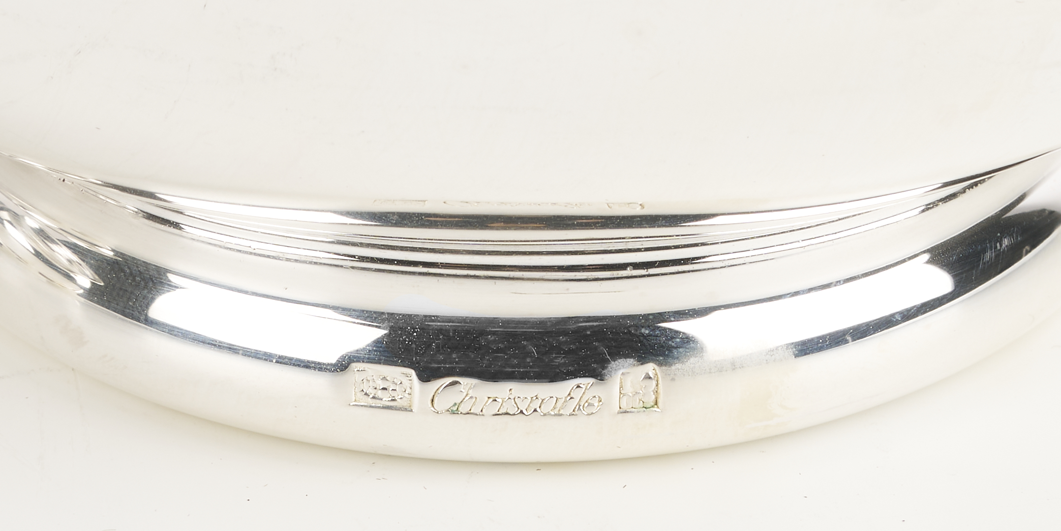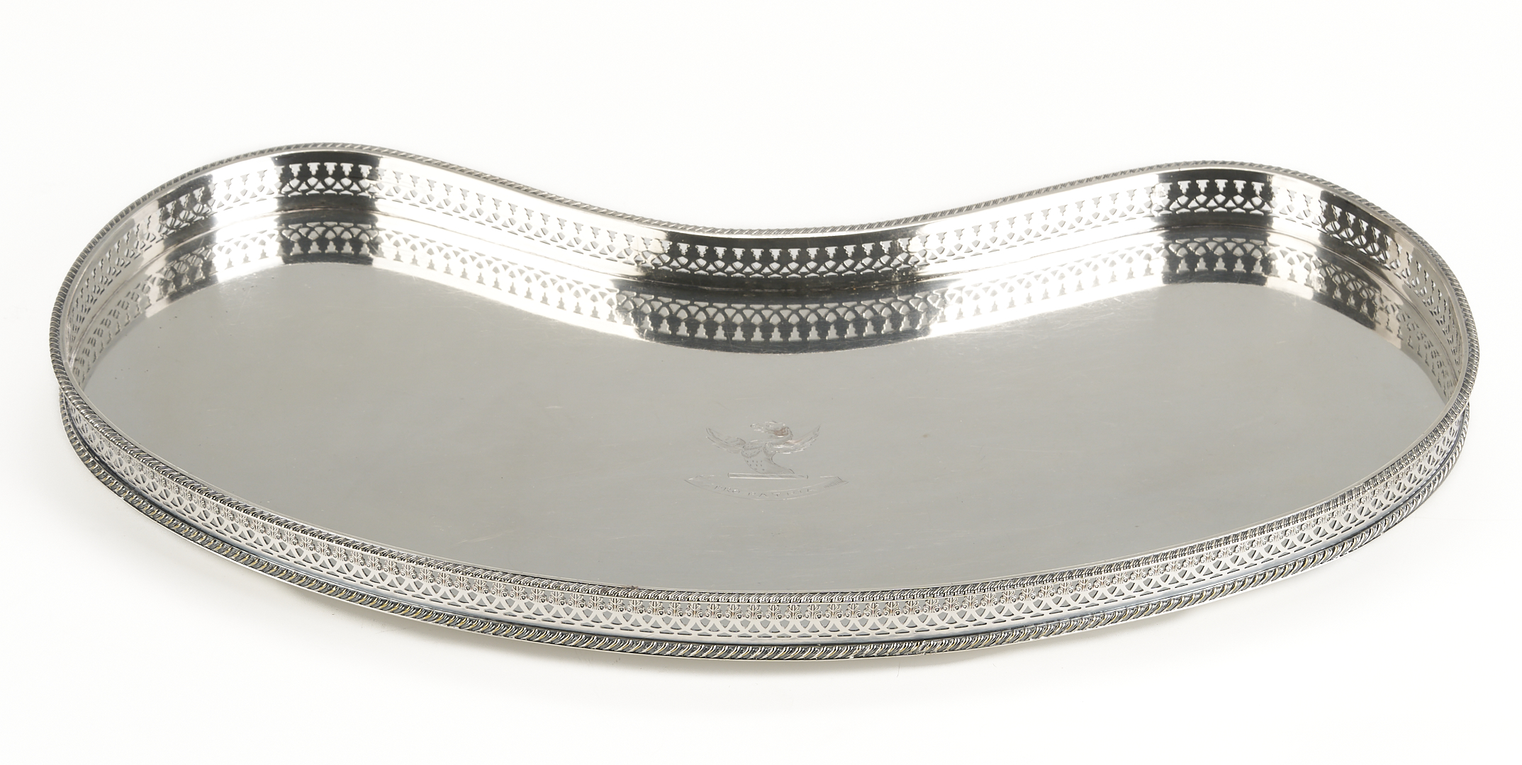 1st item: Christofle silverplated rectangular tray with engraved leaf and anthemion design to center, 13 in. x 11 in. with original box. 2nd item: Christofle silverplated gravy boat with loop handle, 8 in L., with original box. 3rd item: Puiforcat silverplated footed bowl, 8 3/8 in. Diam. All late 20th-early 21st century. 4th item: An English Sheffield kidney form silver-plated footed tray with reticulated gallery and armorial engraving to the center. Illegible hallmarks to the underside and stamped “Made in England.” Early to mid 20th century. , 20 1/4 in. x 11 1/2 in.