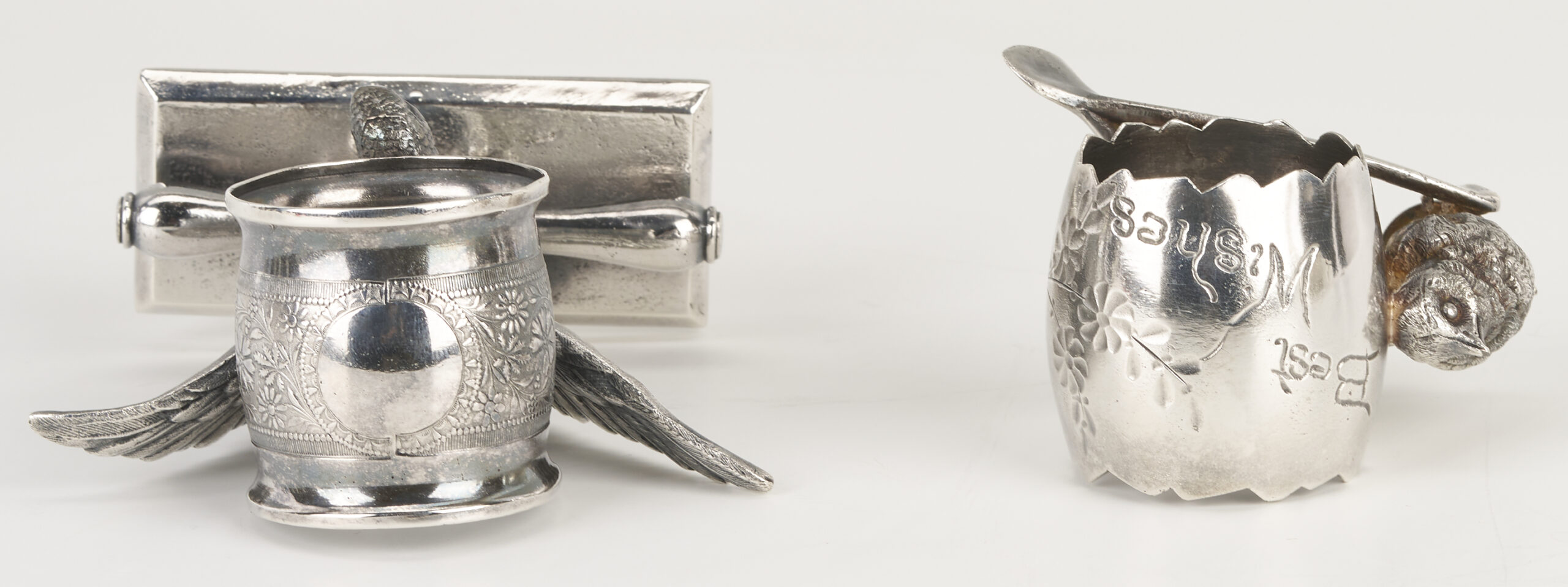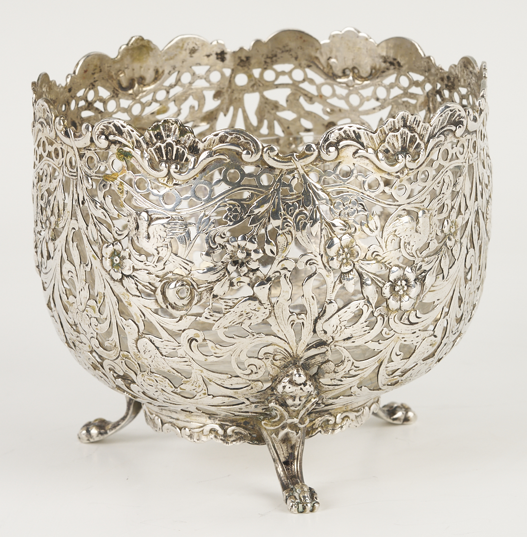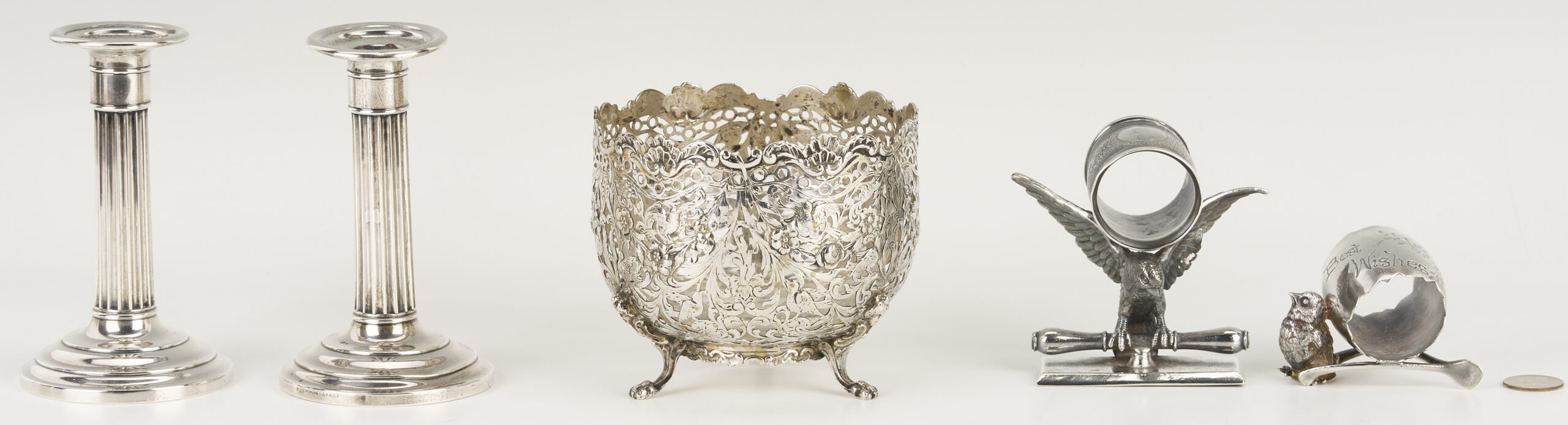 1st item: Continental, likely Hanau, German, .800 silver bowl with pierced Rococo style bird and floral decoration, raised on three caryatid feet, with later associated clear glass liner. Marks worn. 8.8 oz troy. 5 in. diameter. 2nd item: Victorian silverplated napkin ring in the form of a spread winged eagle, stamped Rogers, Smith & Co. quadruple plate to bottom, vacant monogram reserve, 4 in. H. 3rd item: Victorian Silverplated napkin ring featuring a small bird beside a barrel engraved “Best Wishes.” Rogers & Bro. triple plate stamp to underside. 2 1/2 in. H. 4th and 5th items: Pair of Gorham weighted sterling silver candlesticks, columnar form. 5 3/4 in. H. All items late 19th to early 20th century.