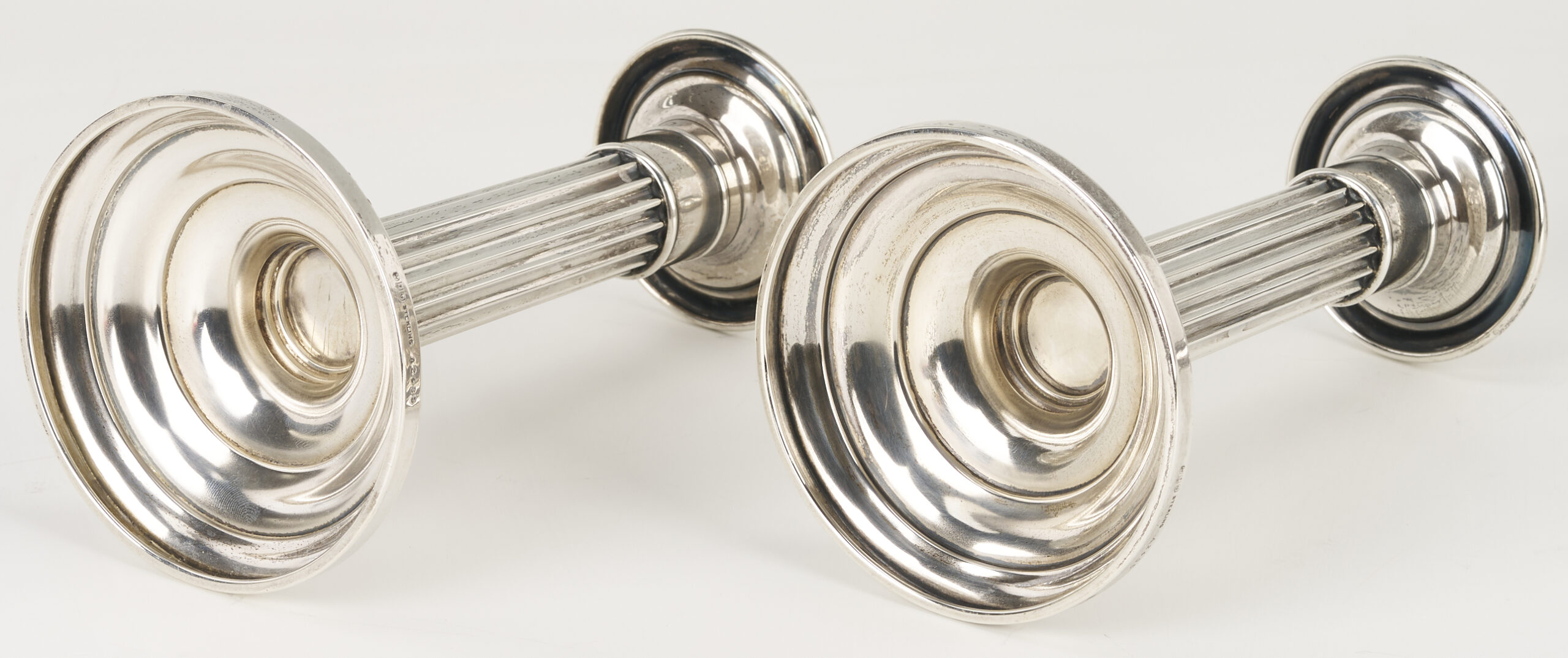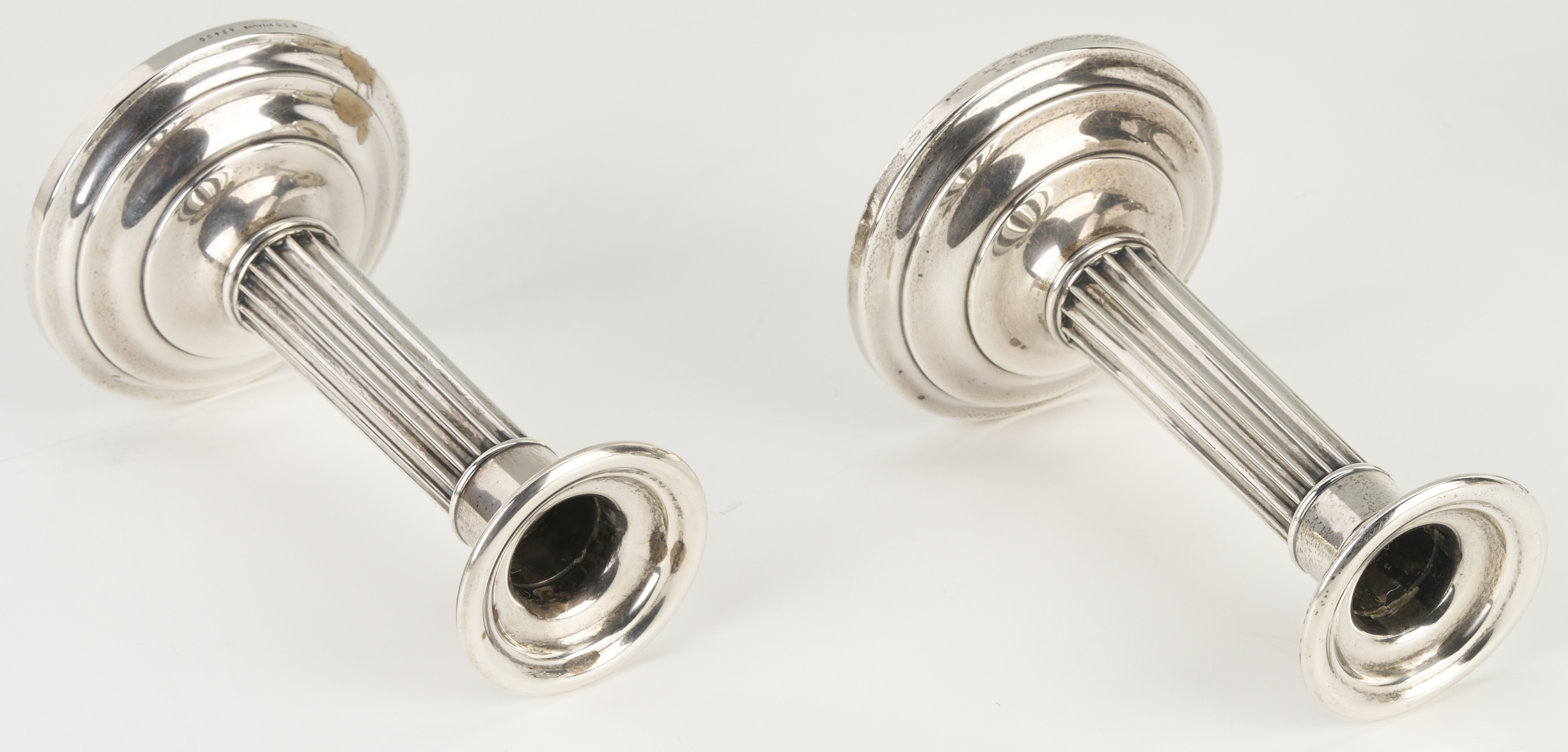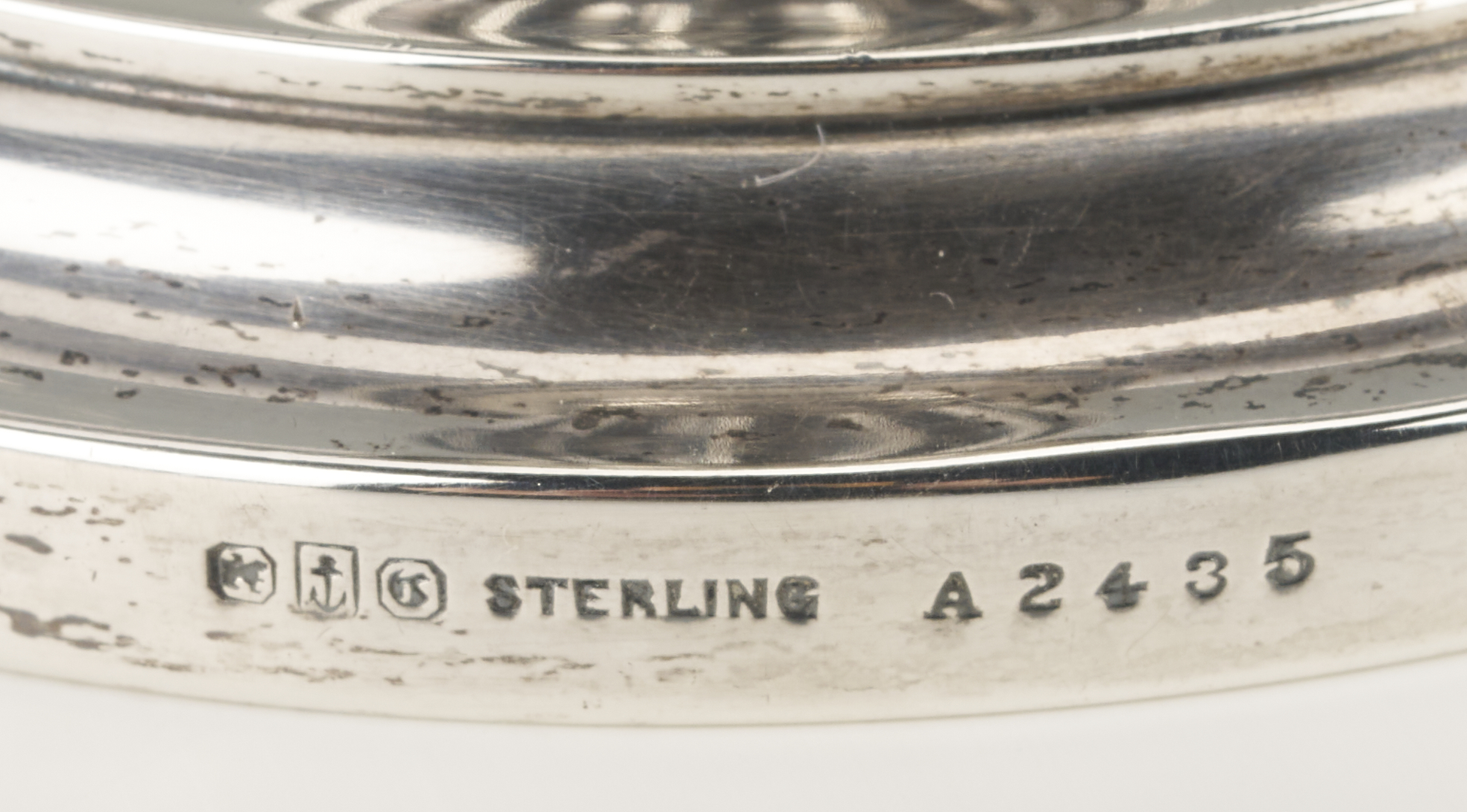 1st item: Continental, likely Hanau, German, .800 silver bowl with pierced Rococo style bird and floral decoration, raised on three caryatid feet, with later associated clear glass liner. Marks worn. 8.8 oz troy. 5 in. diameter. 2nd item: Victorian silverplated napkin ring in the form of a spread winged eagle, stamped Rogers, Smith & Co. quadruple plate to bottom, vacant monogram reserve, 4 in. H. 3rd item: Victorian Silverplated napkin ring featuring a small bird beside a barrel engraved “Best Wishes.” Rogers & Bro. triple plate stamp to underside. 2 1/2 in. H. 4th and 5th items: Pair of Gorham weighted sterling silver candlesticks, columnar form. 5 3/4 in. H. All items late 19th to early 20th century.